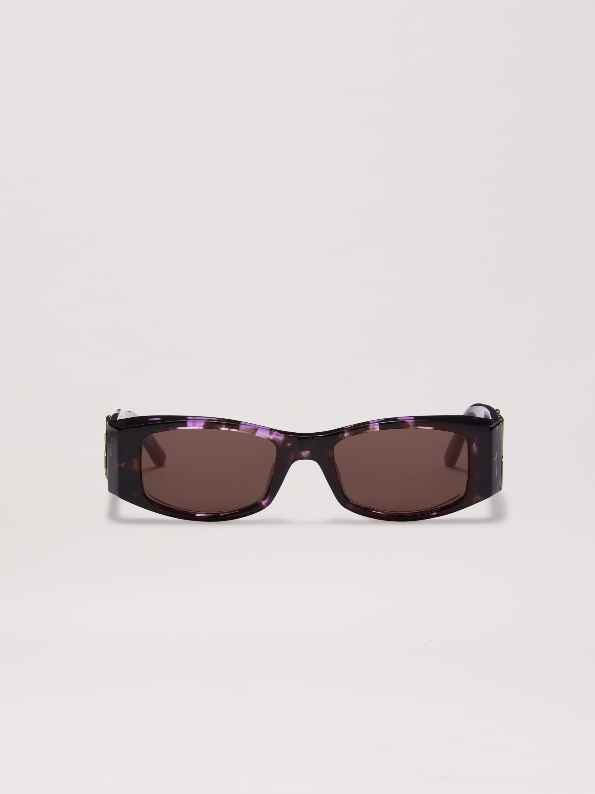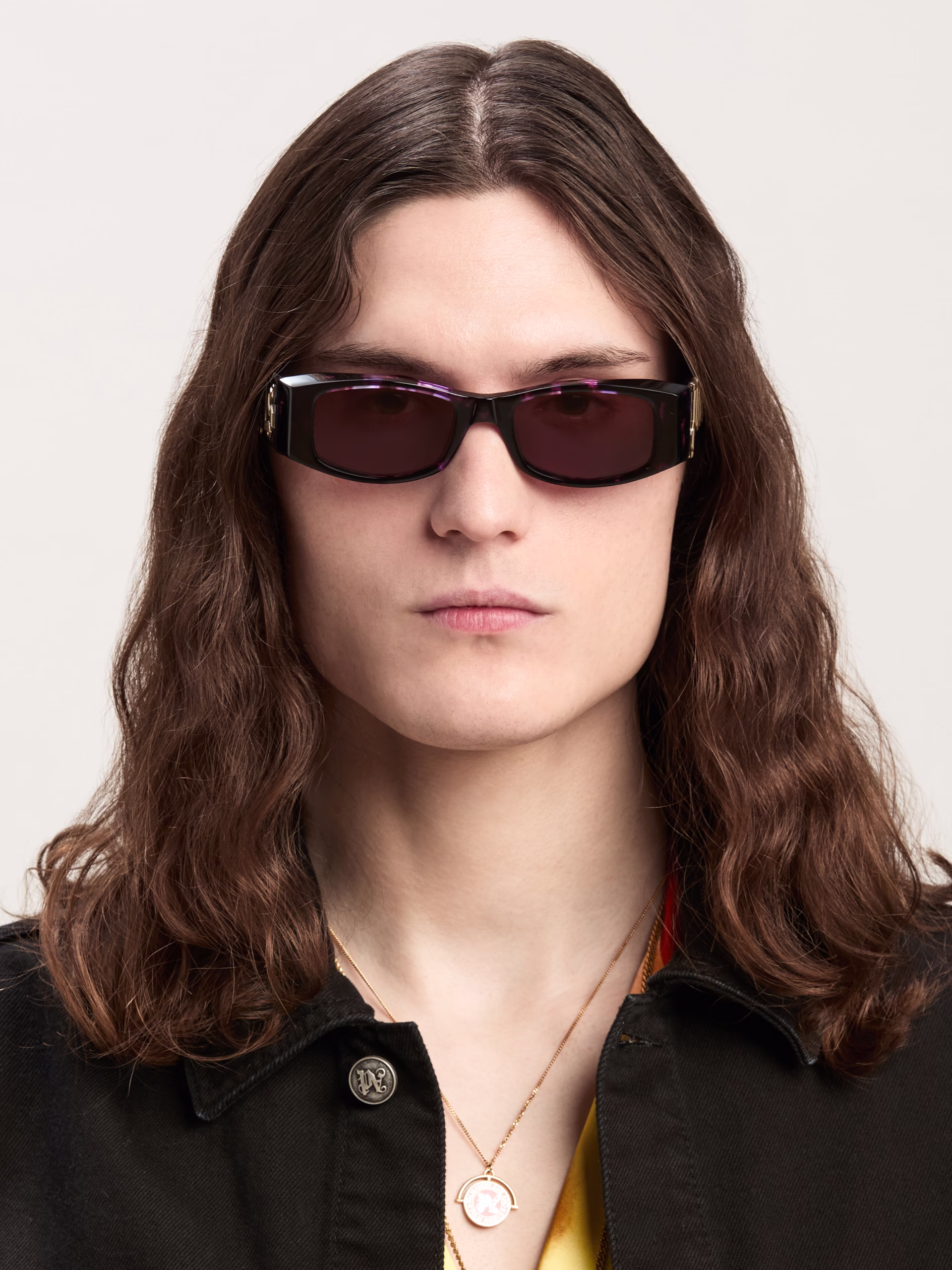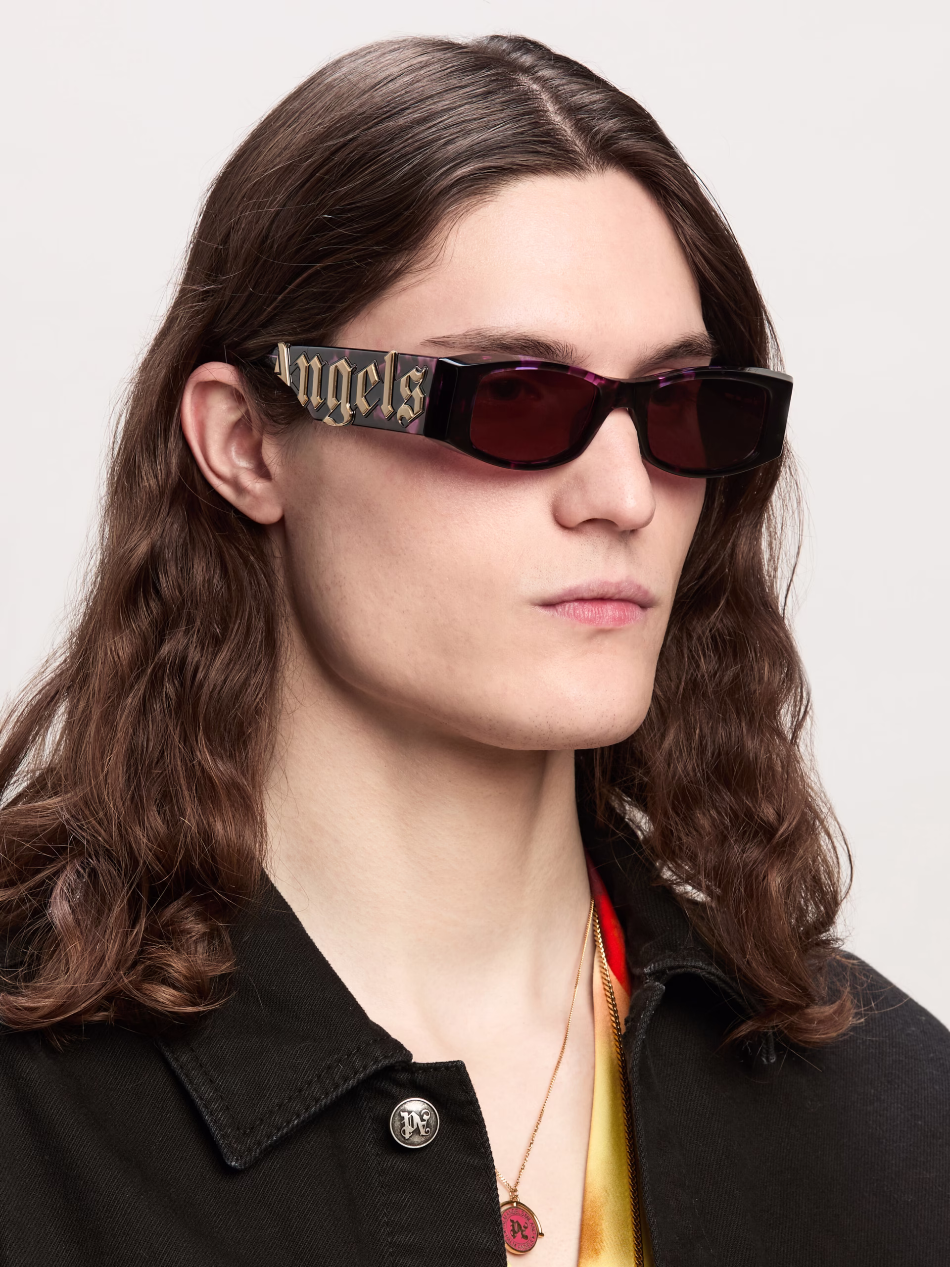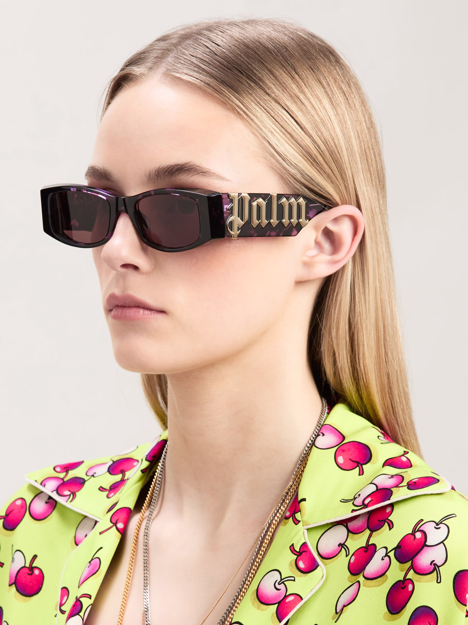 Bold design, standout shade. Purple acetate sunglasses with brown lenses and oversized gold Palm Angels logo on temples.