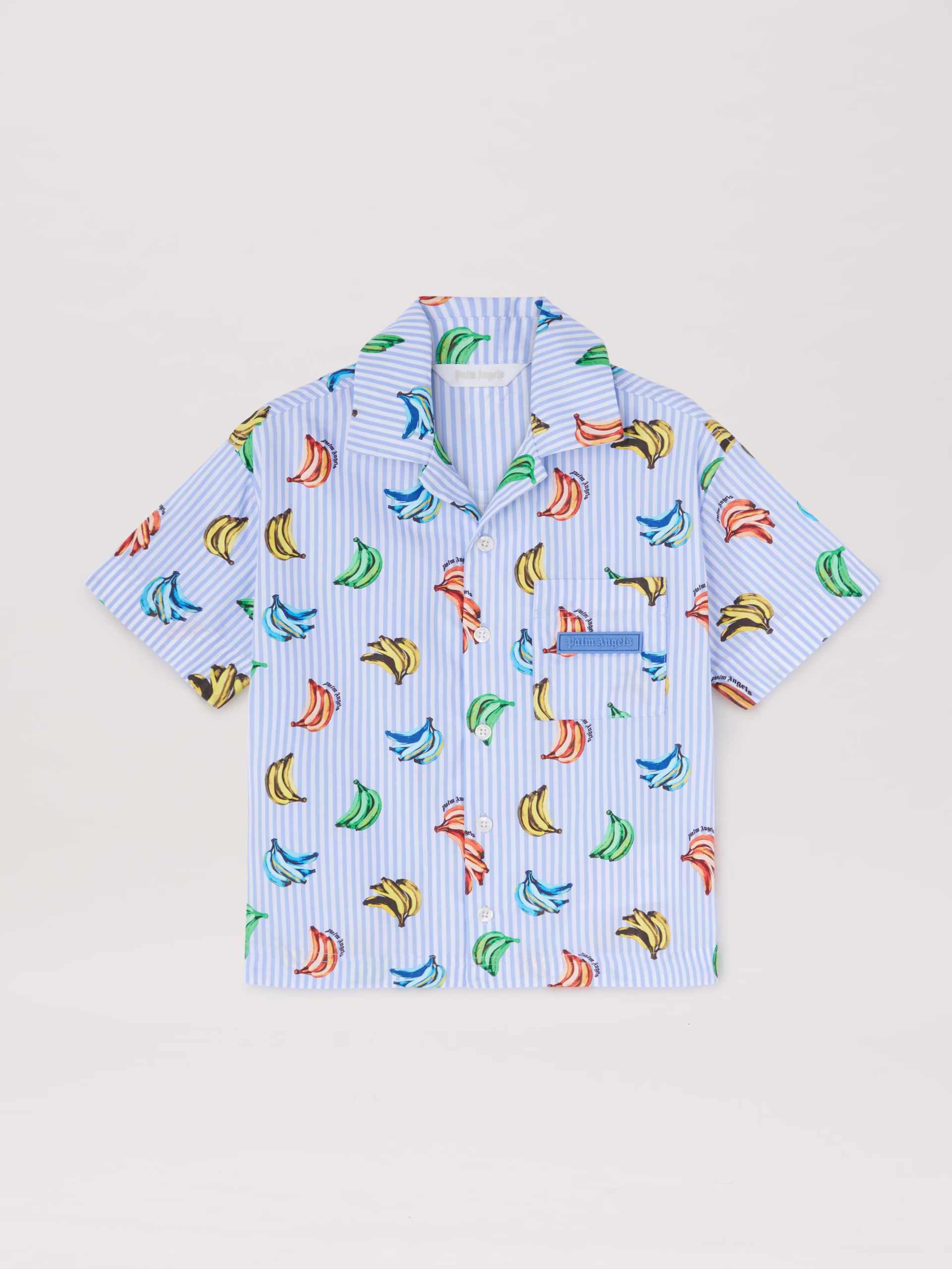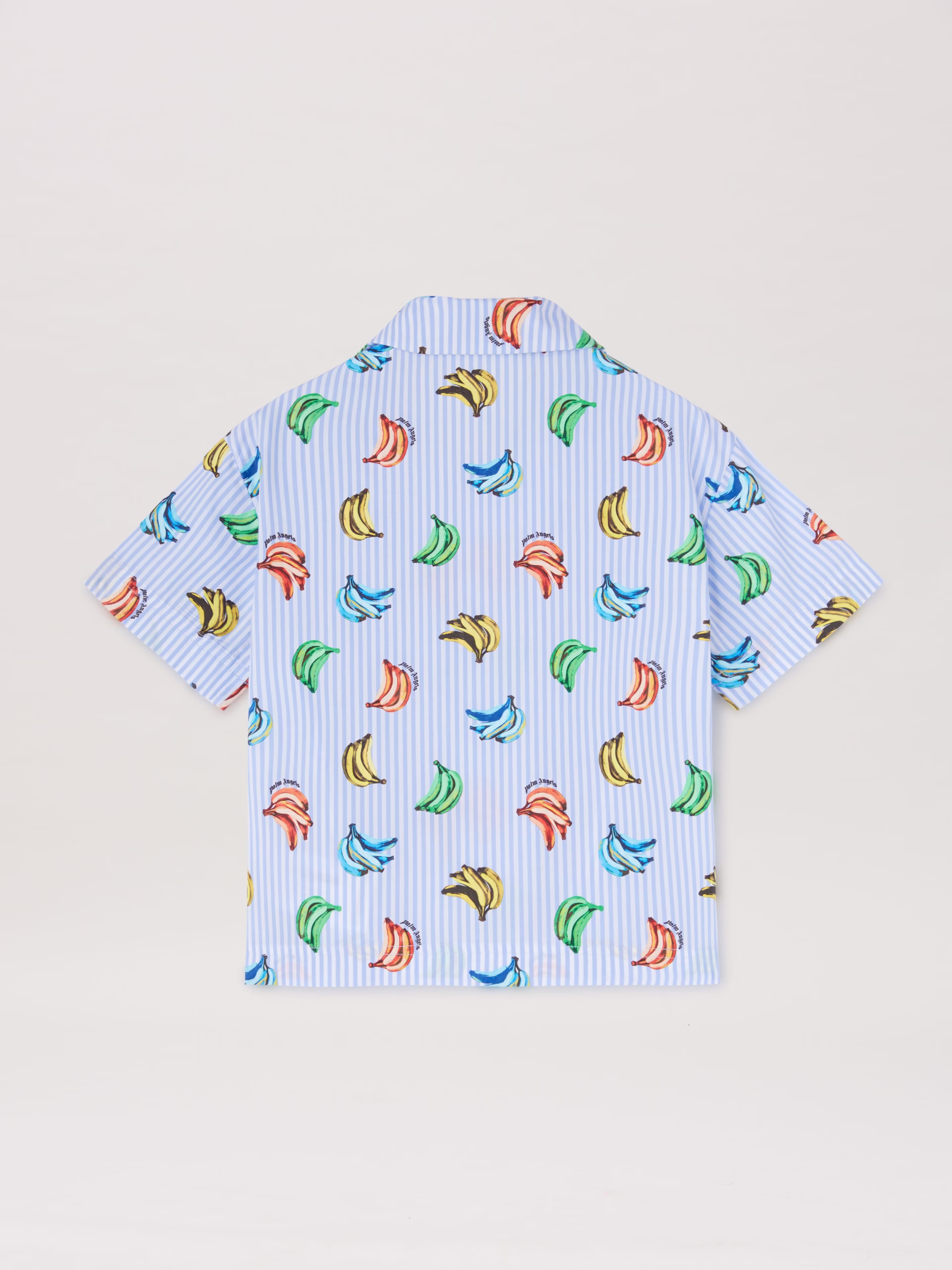 Wearing SS25 bananas pop print is pure fun. Boy’s vertical striped bowling shirt with all over print of multicolored bananas and b