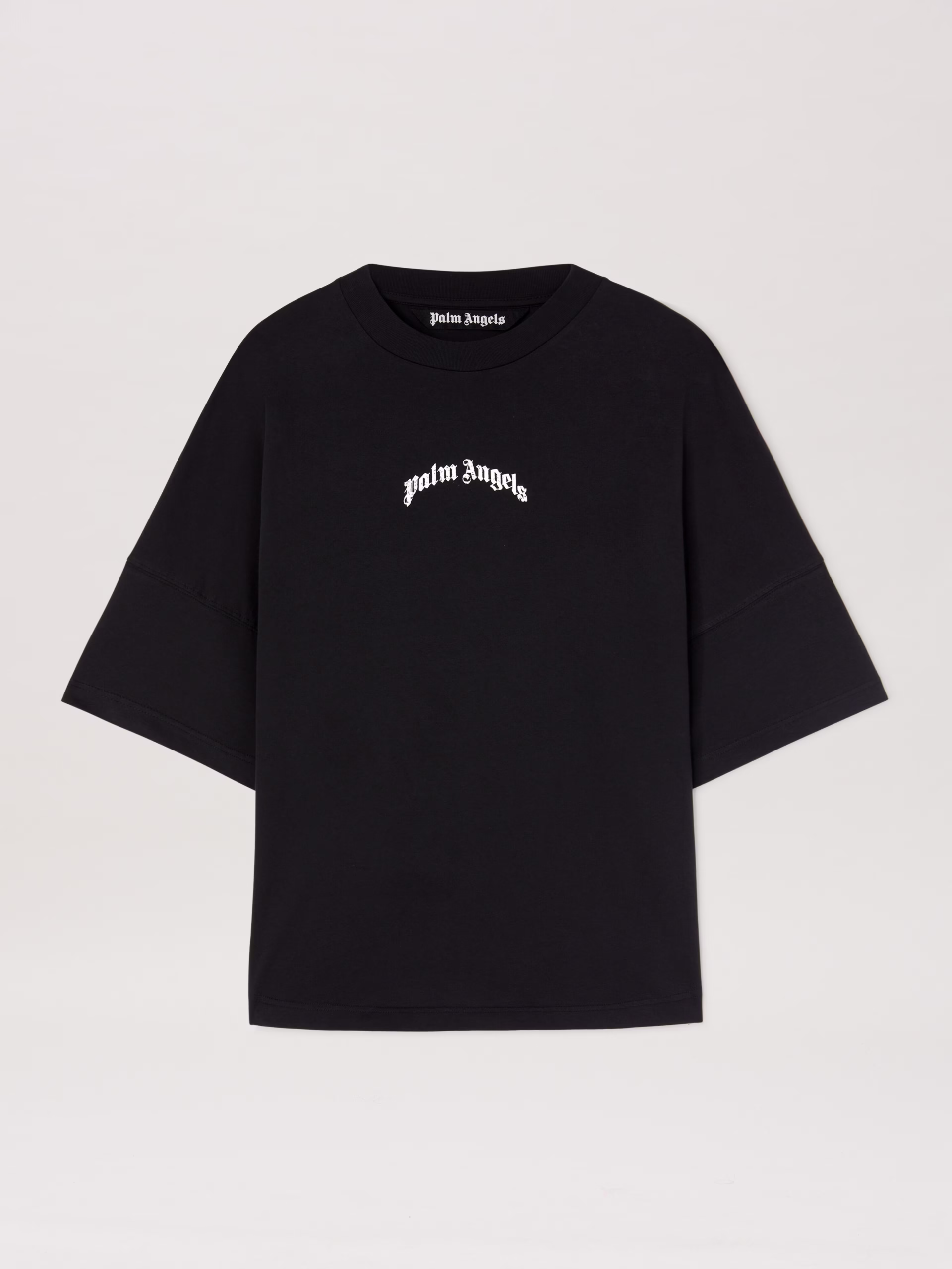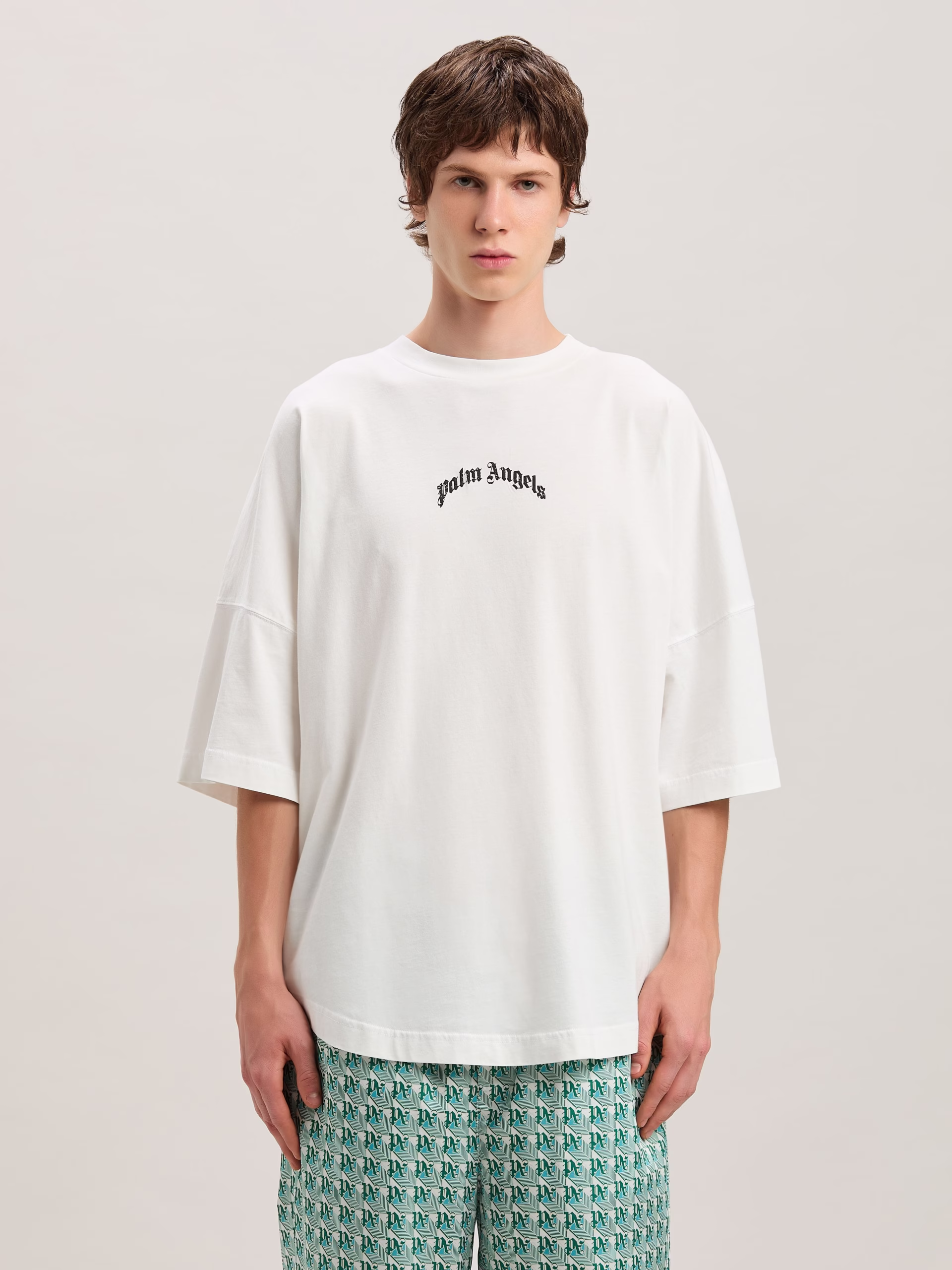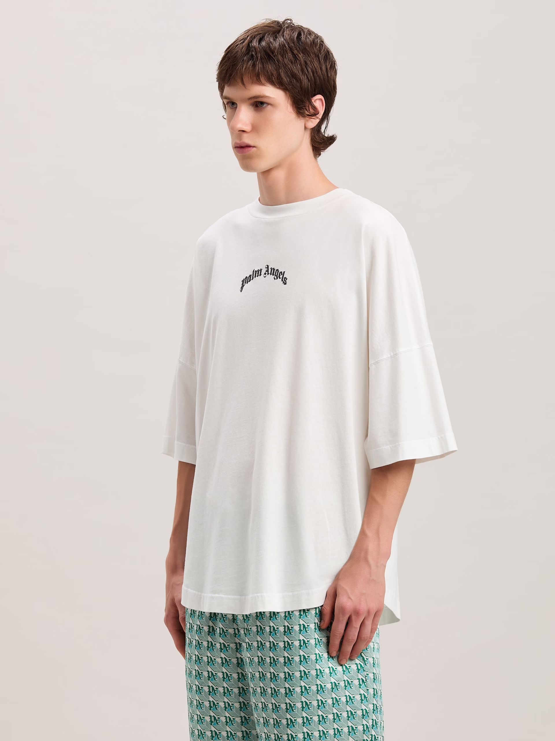 Logo mutations that make a timeless icon a new seasonal graphic. Men’s oversized white T-shirt with Curved logo in black printed i