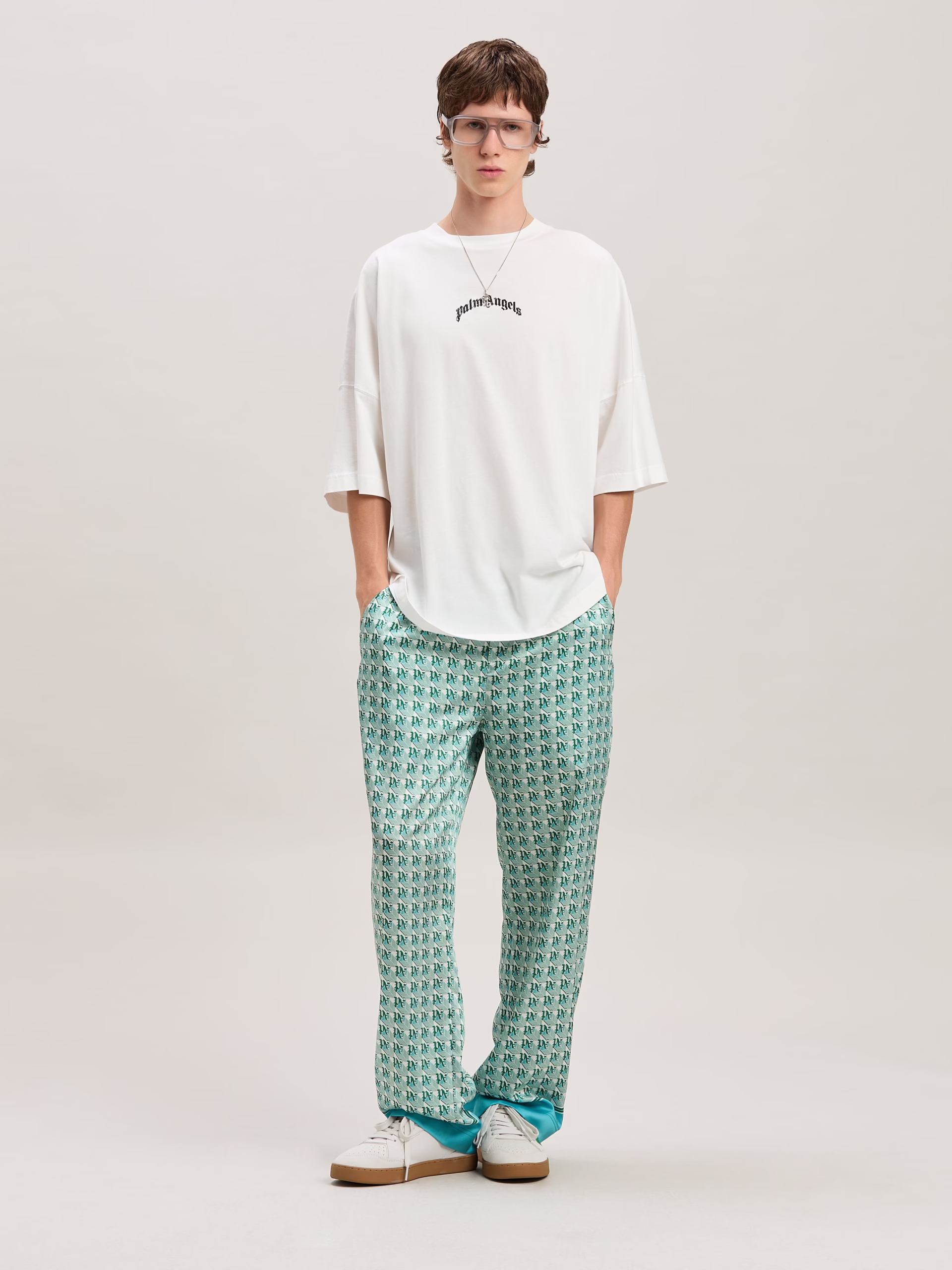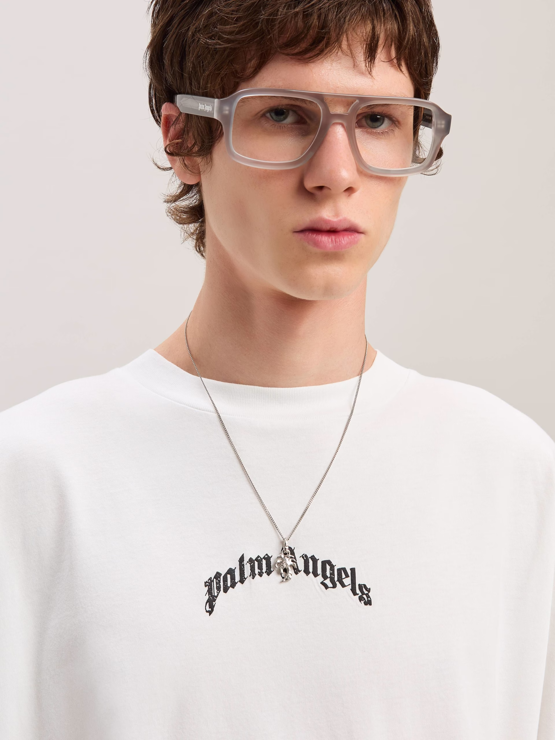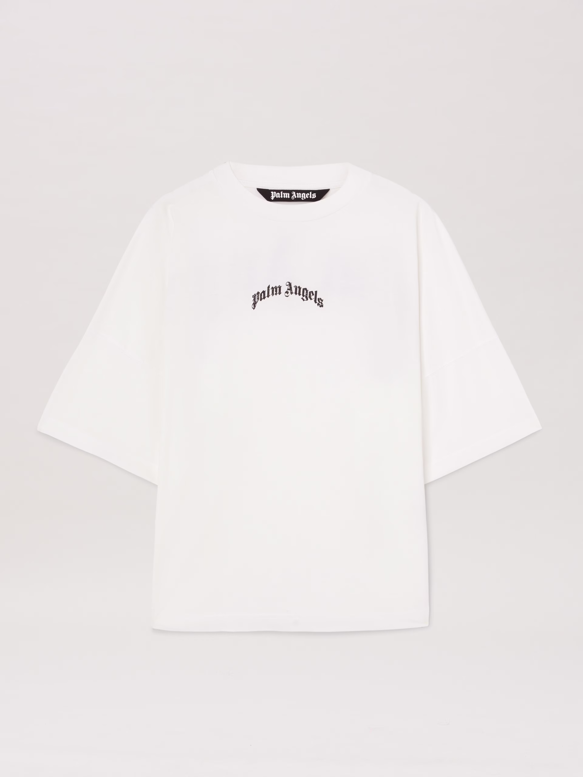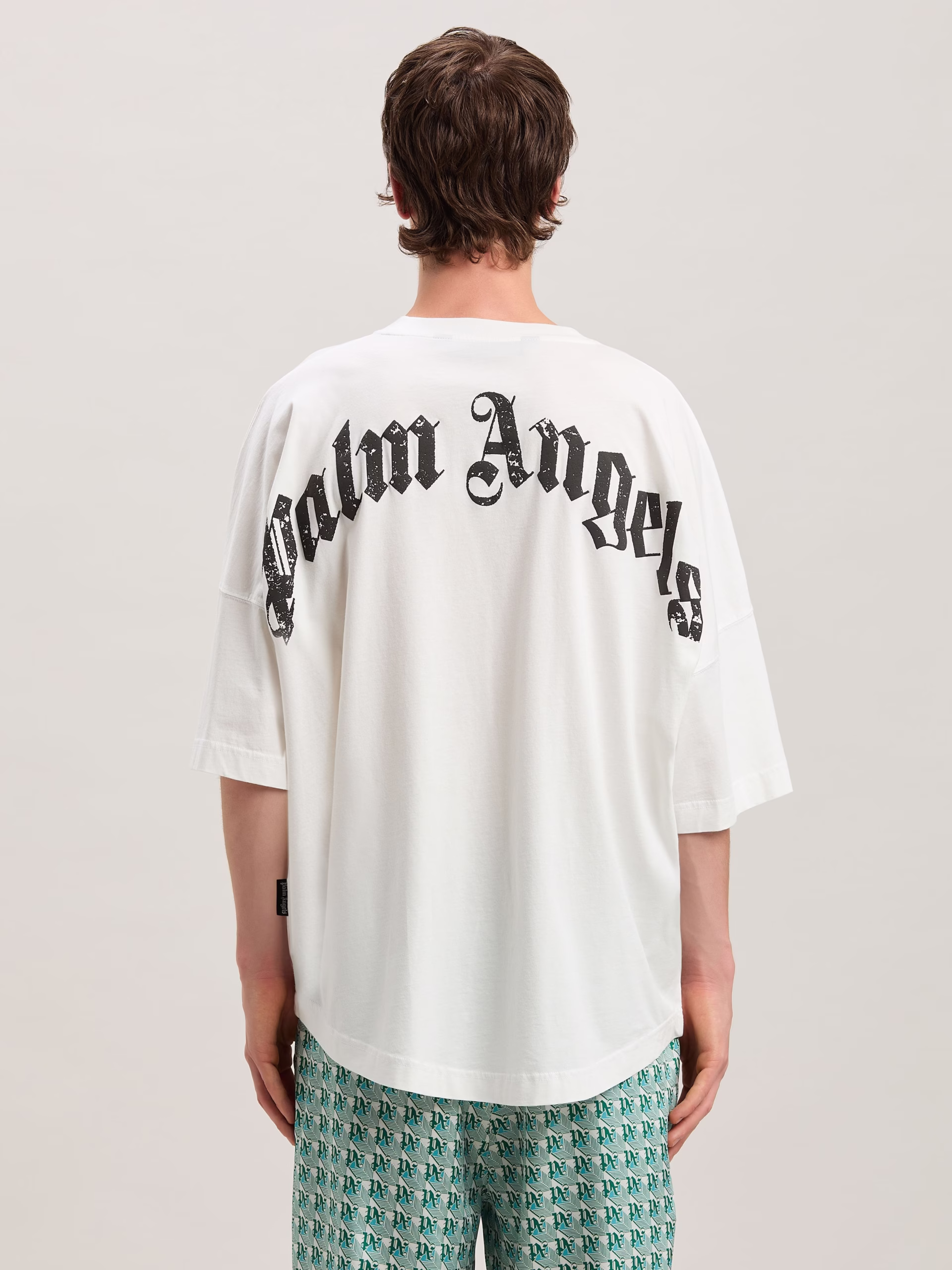 Logo mutations that make a timeless icon a new seasonal graphic. Men’s oversized white T-shirt with Curved logo in black printed i