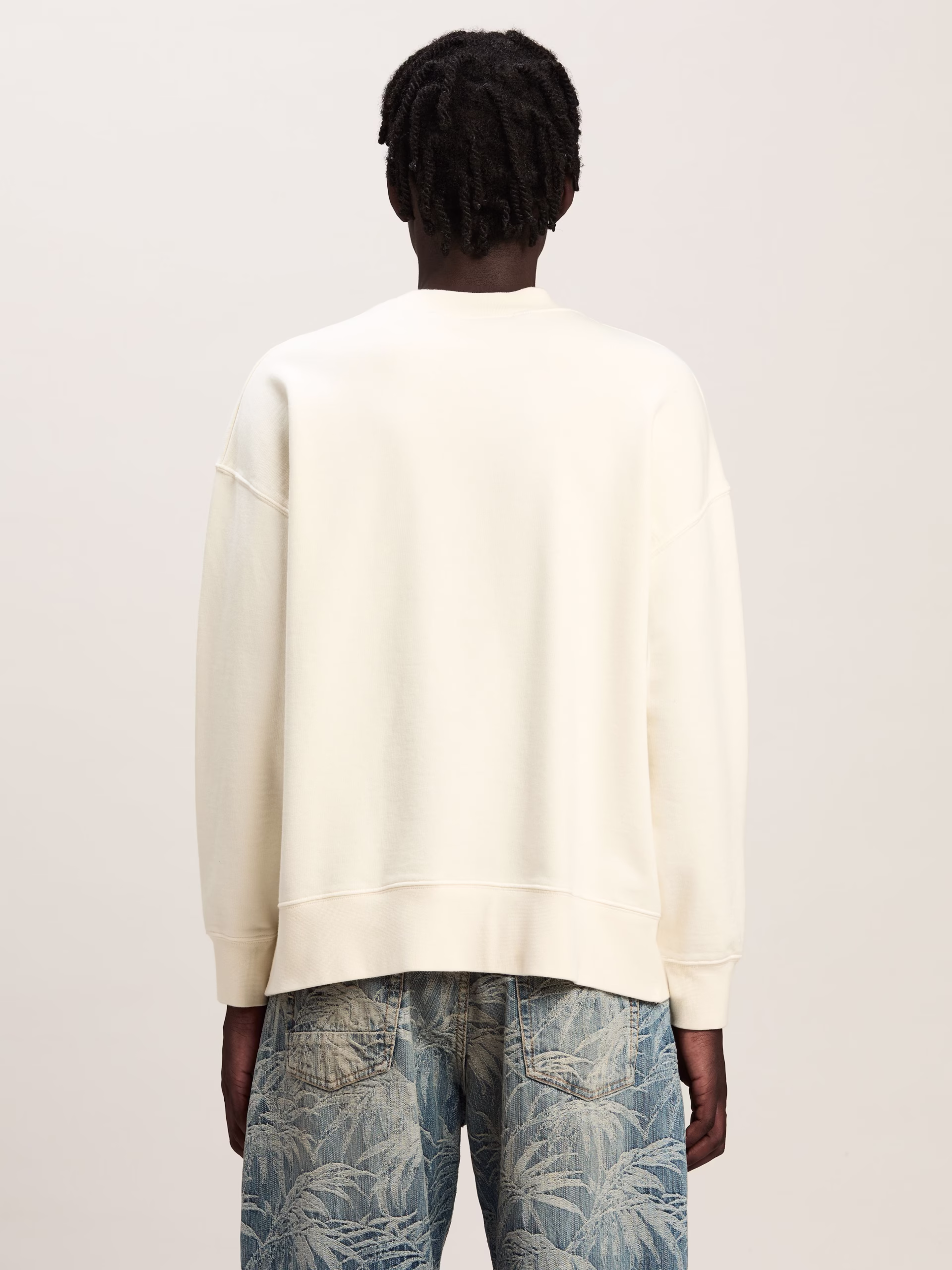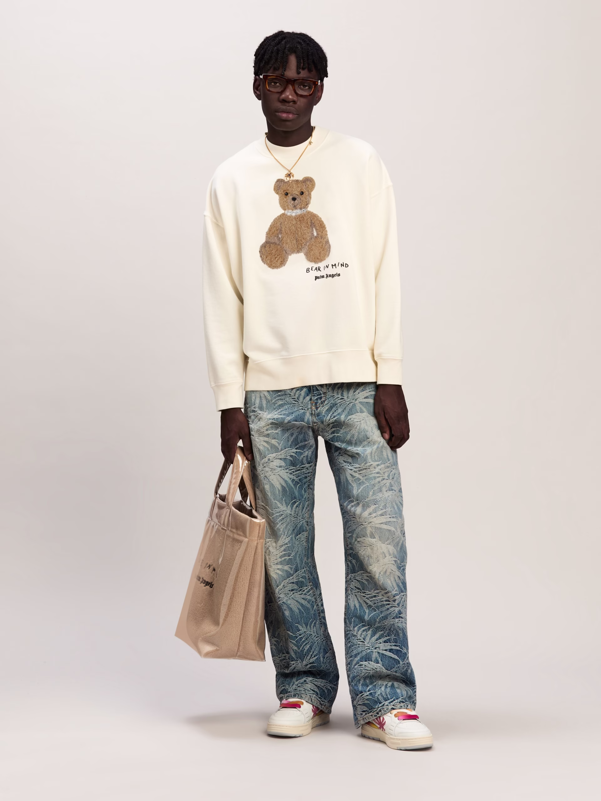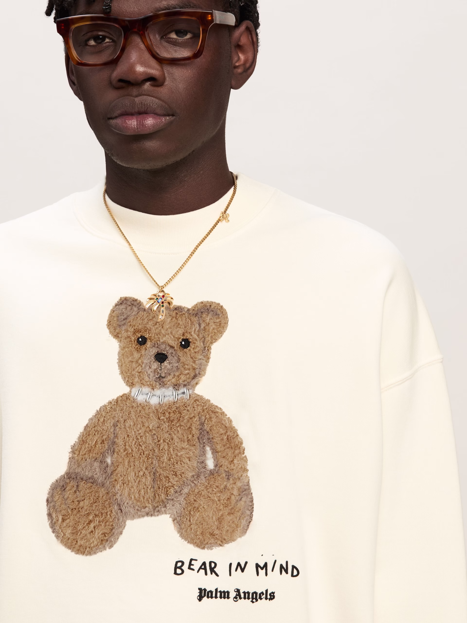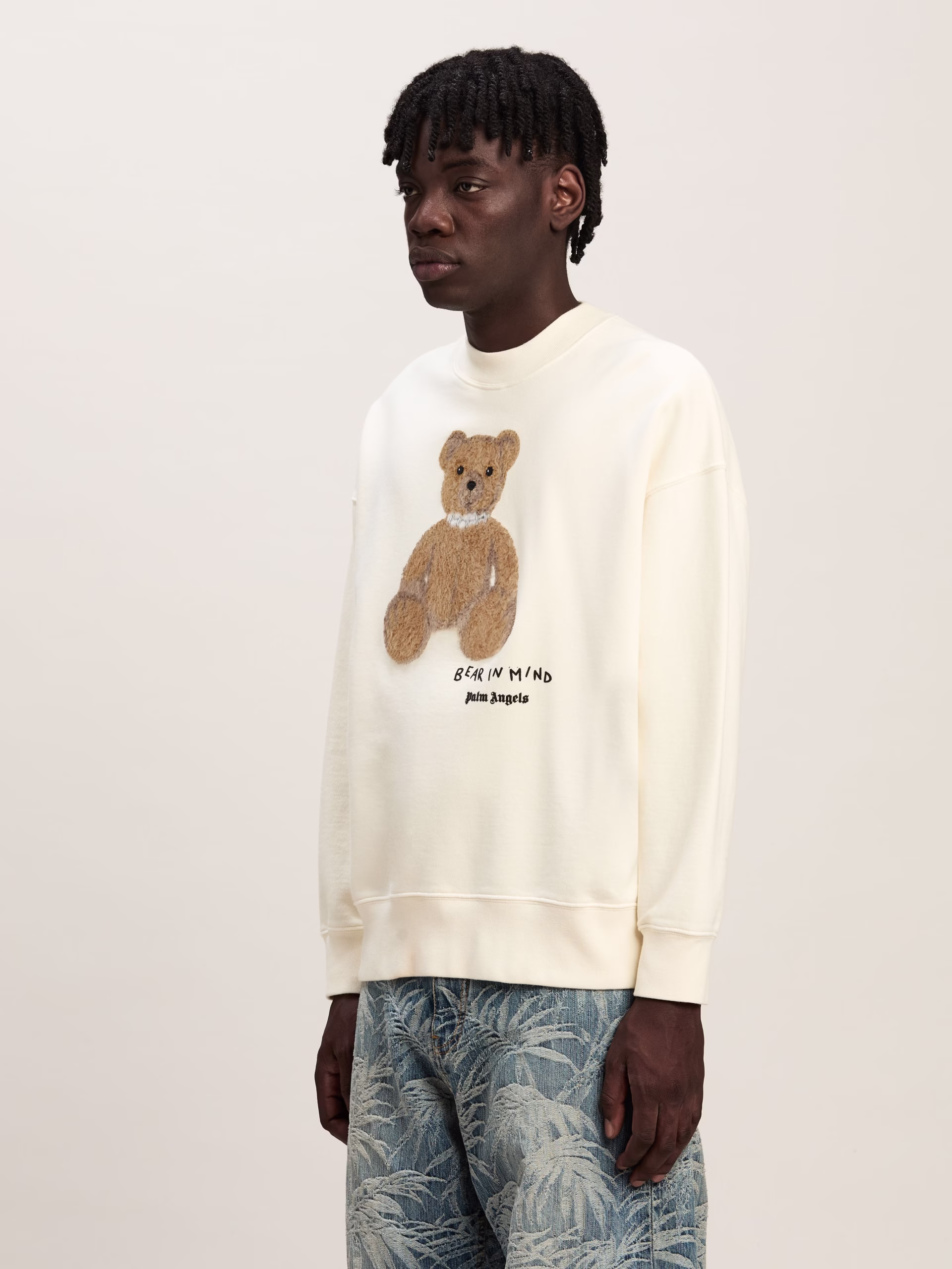 The iconic teddy bear in its punk version returns with new motifs and graphics. Men’s white crewneck sweatshirt with teddy bear wi