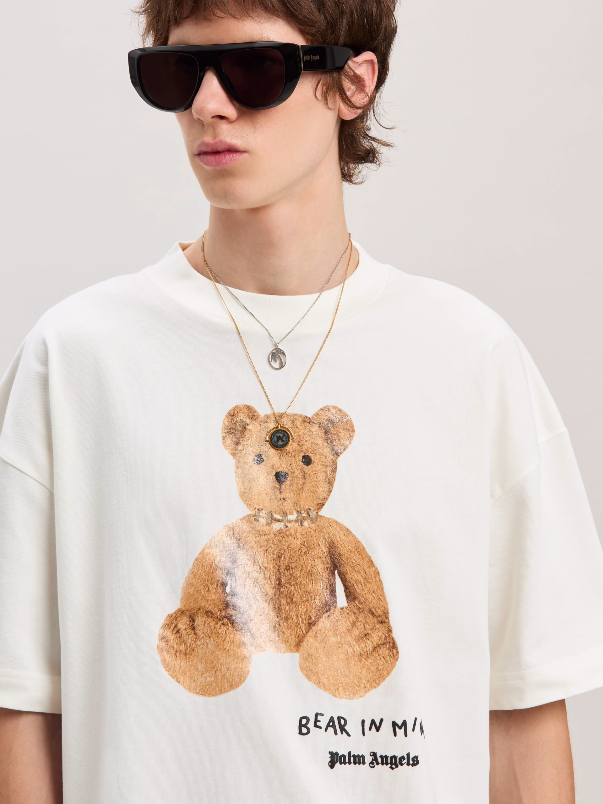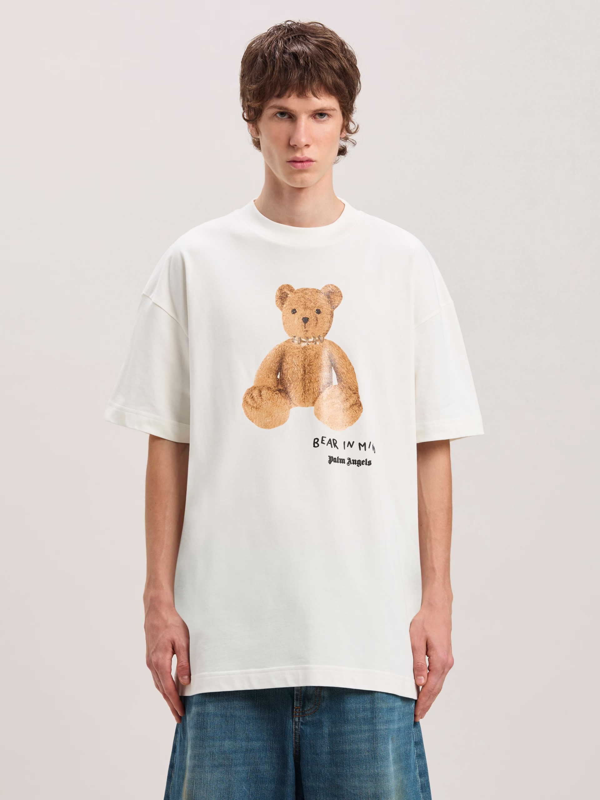 The iconic teddy bear in its punk version returns with new motifs and graphics. Men’s white short-sleeved T-shirt with front gloss