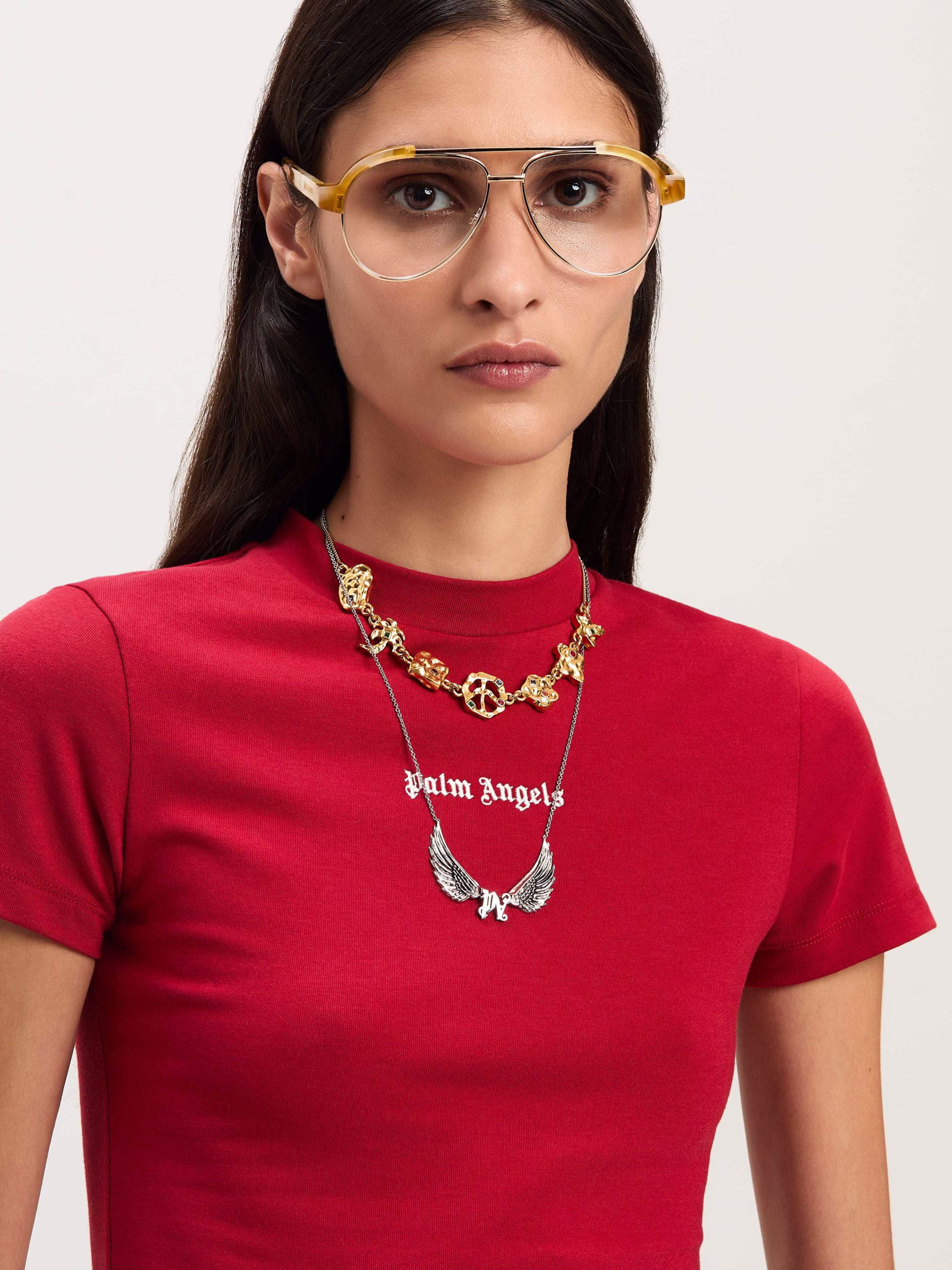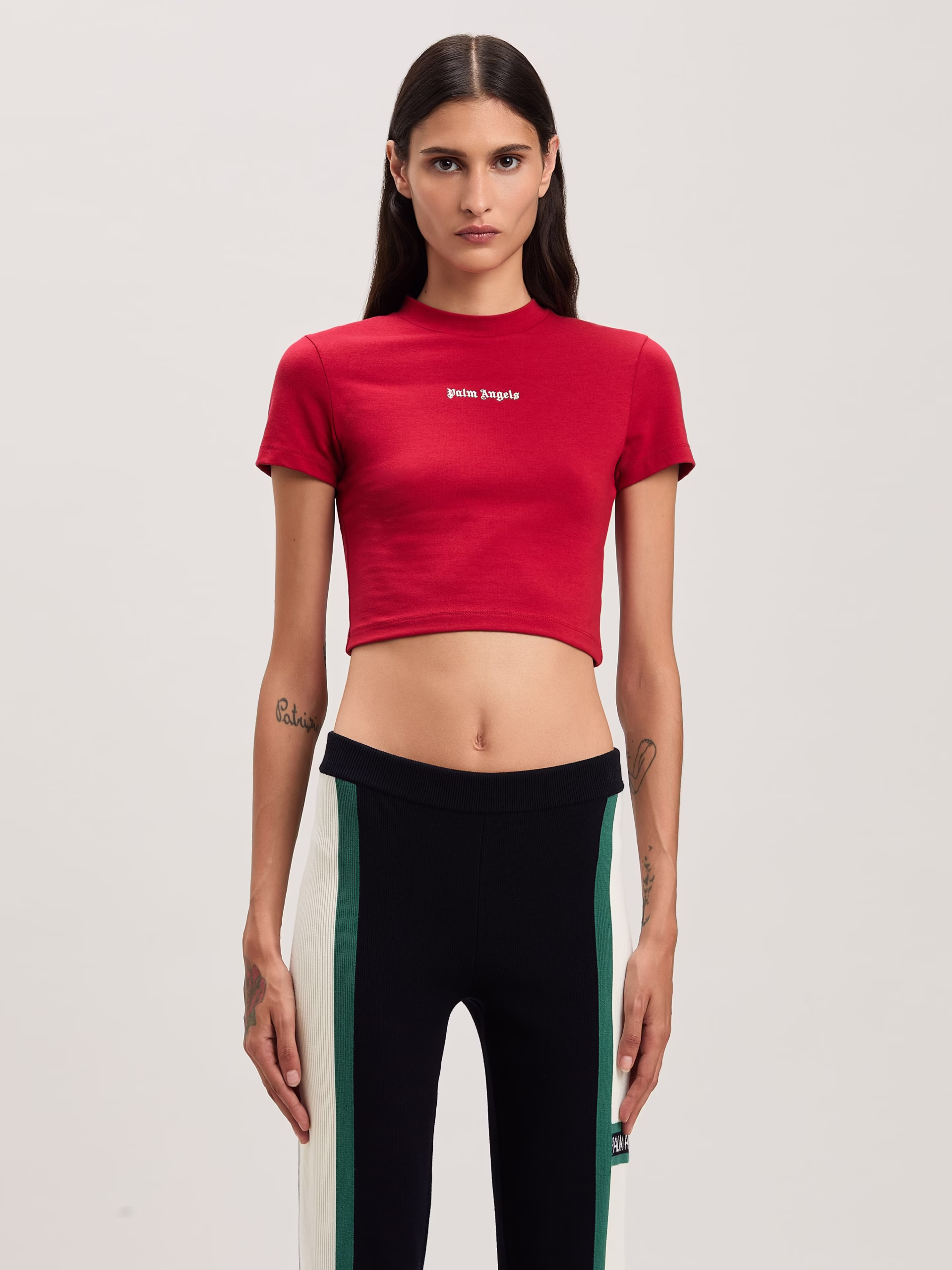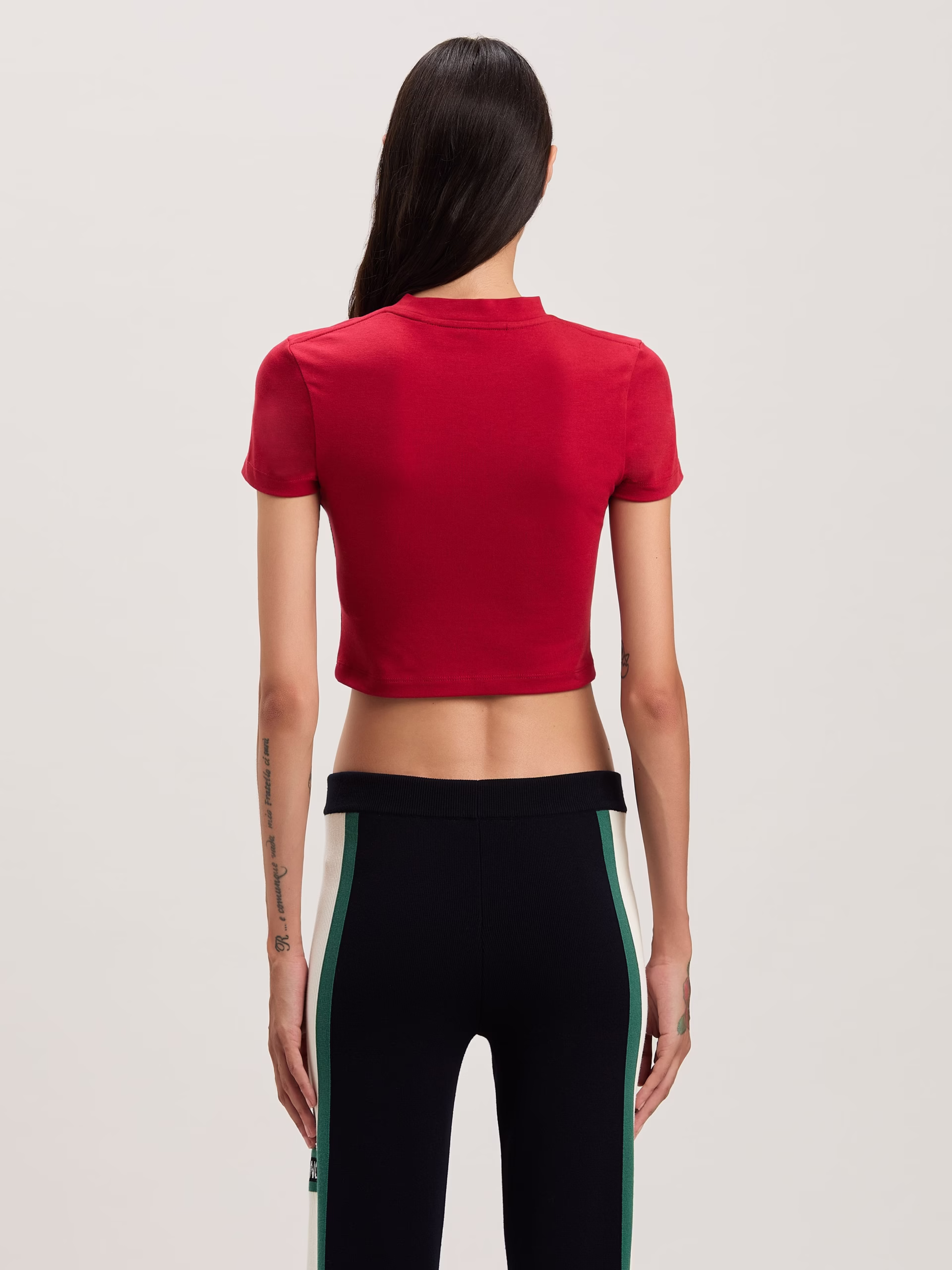 Sporty and feminine the Mini Tee is a new classic. Women’s cropped red T-shirt with slim fit and logo embroidered in white on the