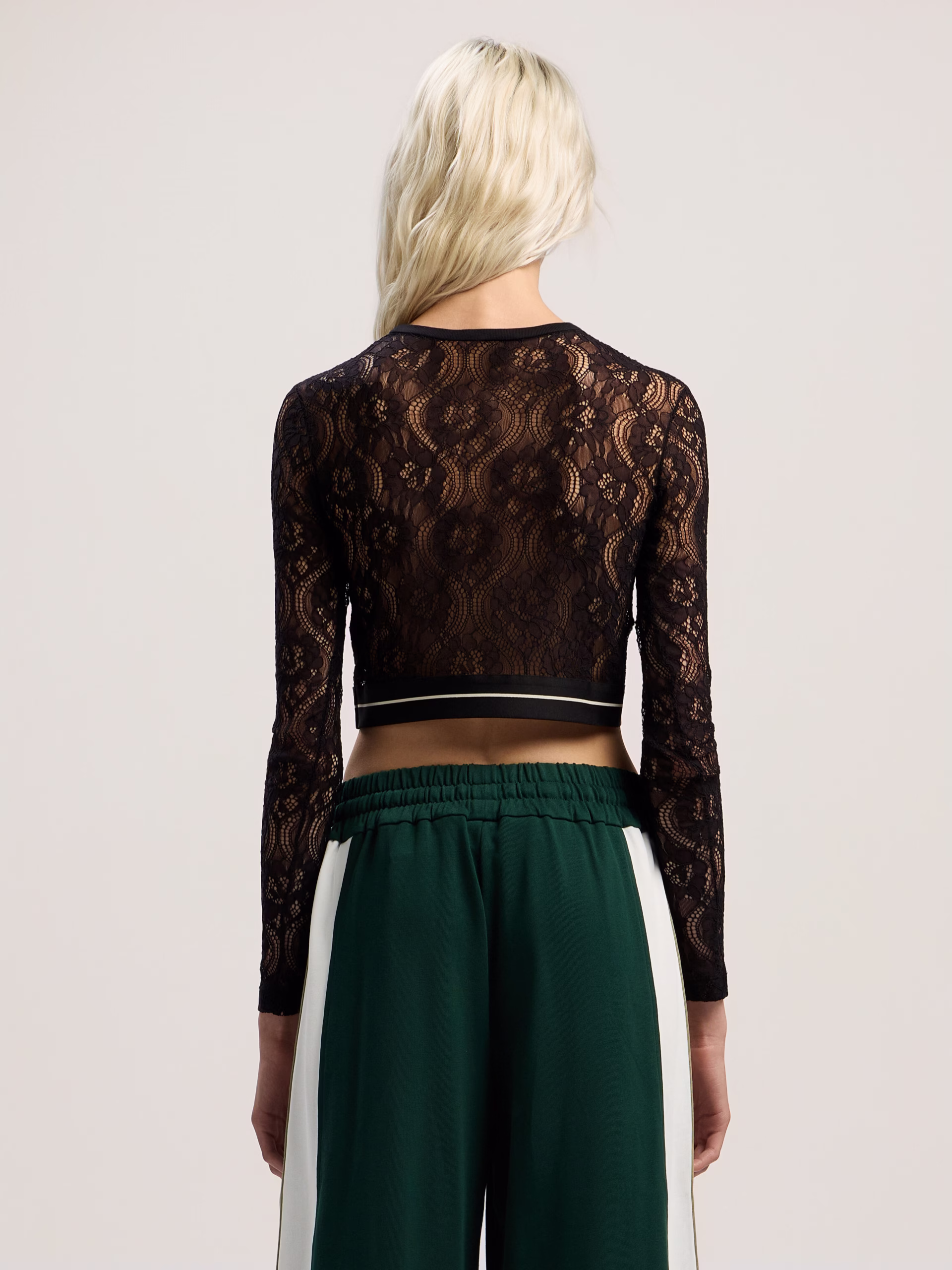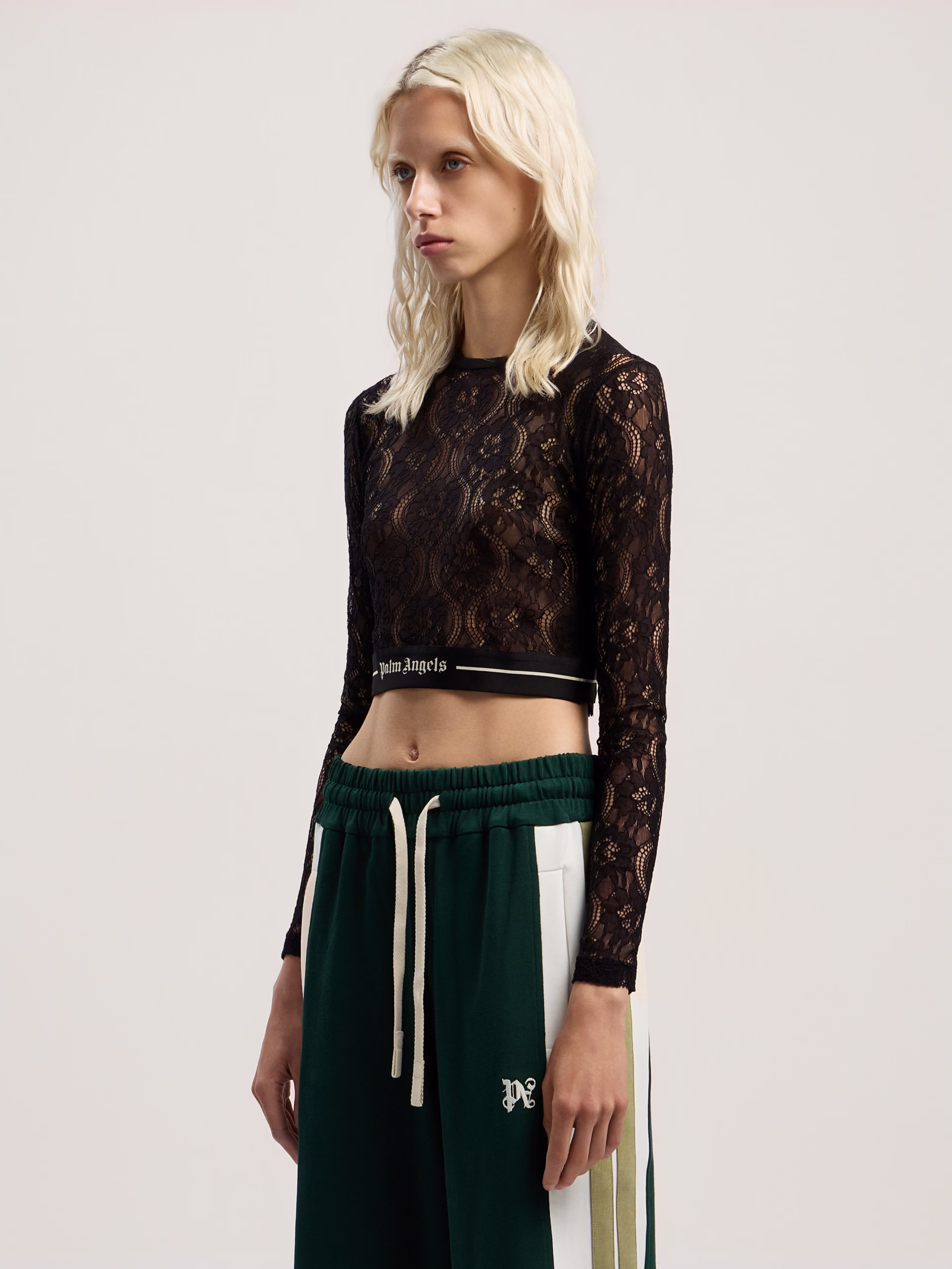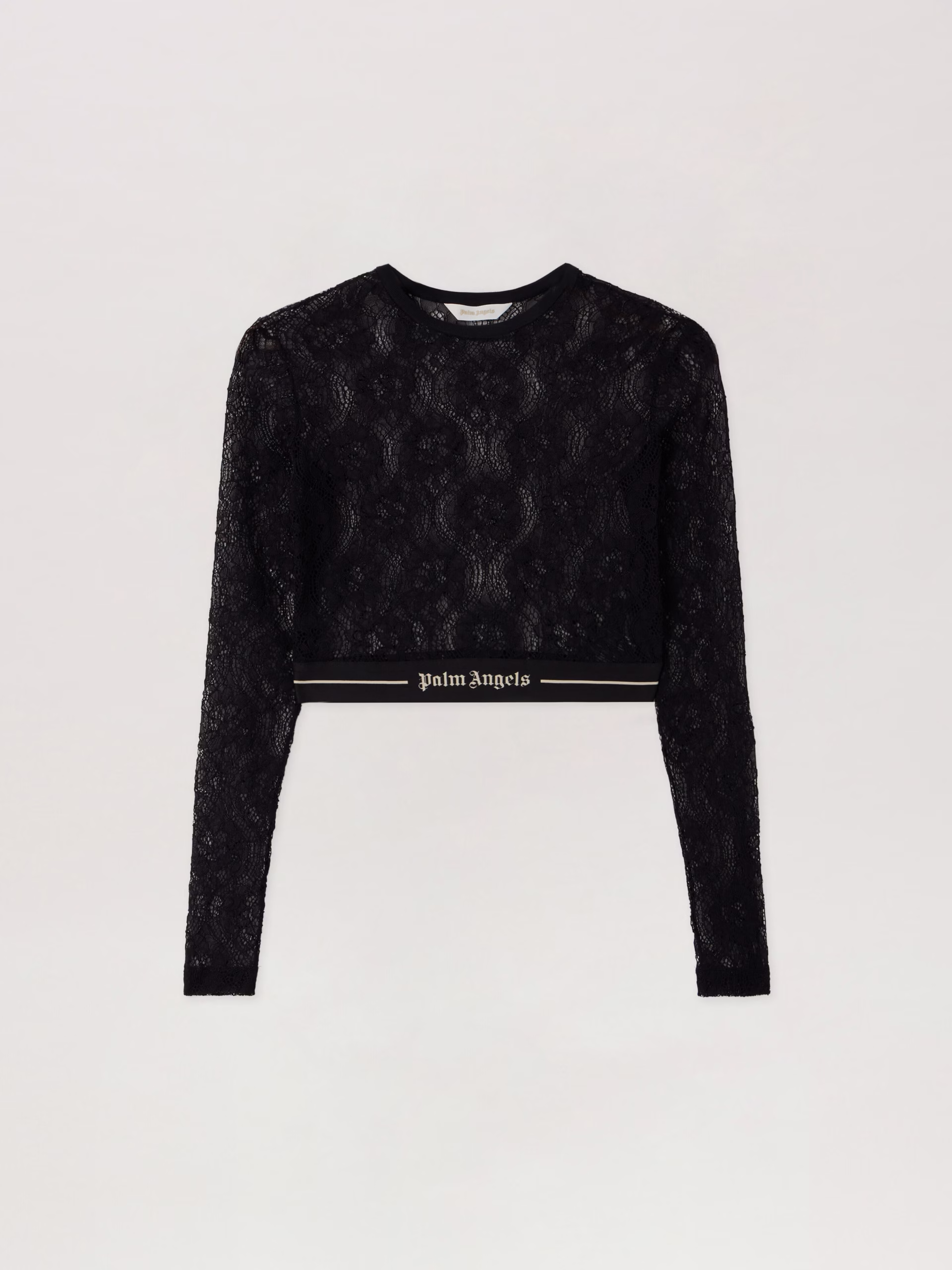 Intricately designed lace top featuring a signature elastic logo band, combining street style with refined elegance.