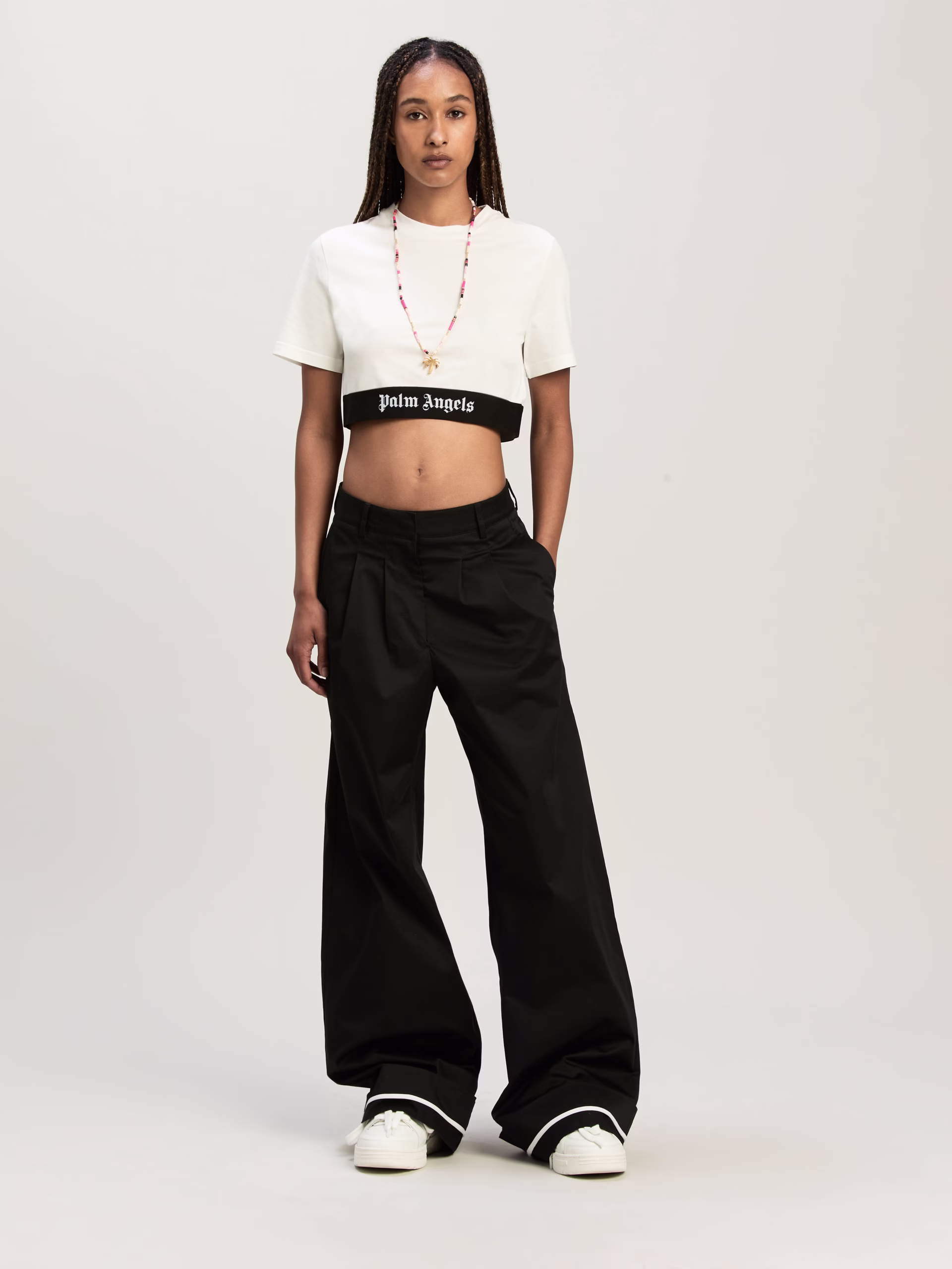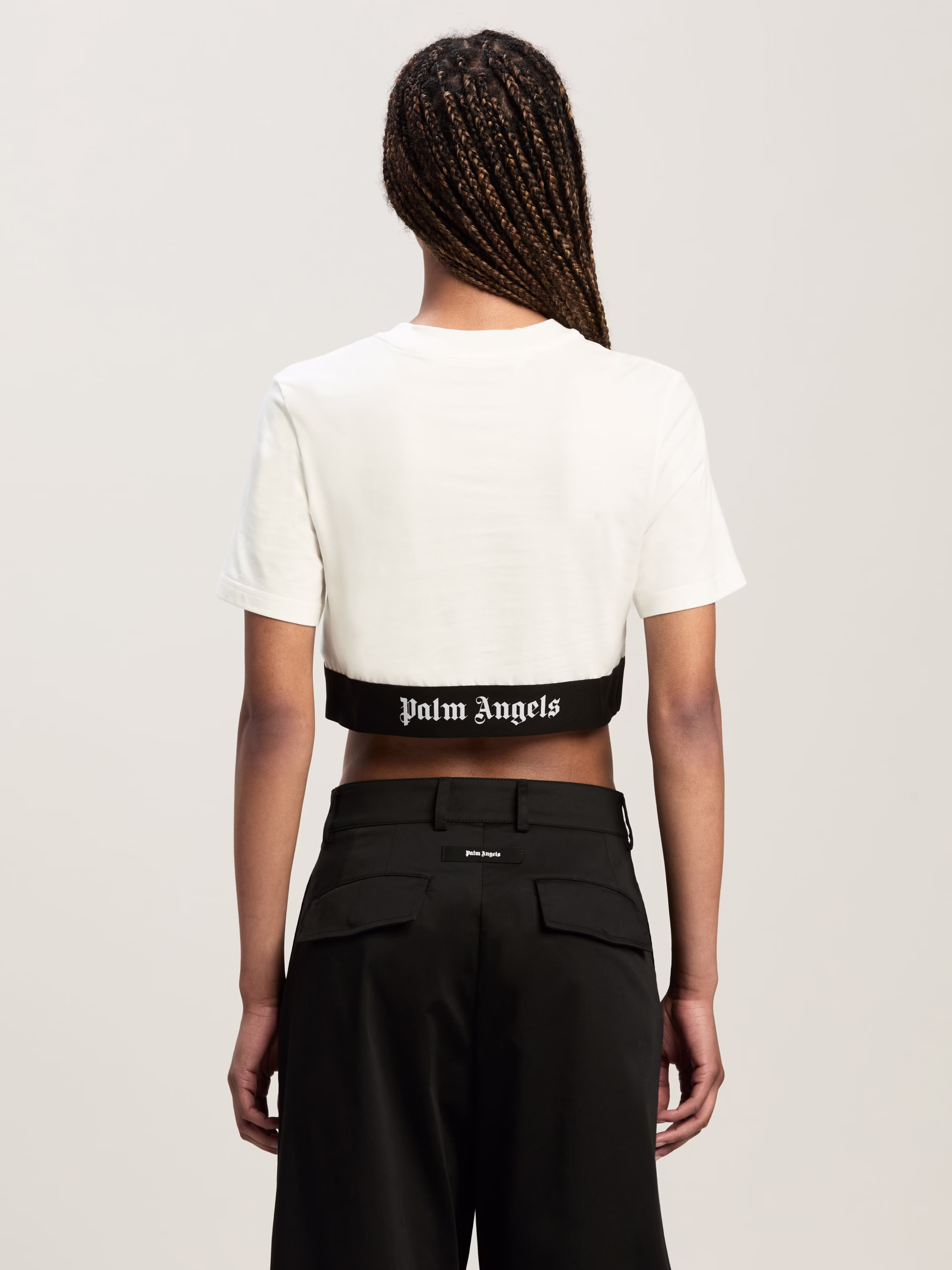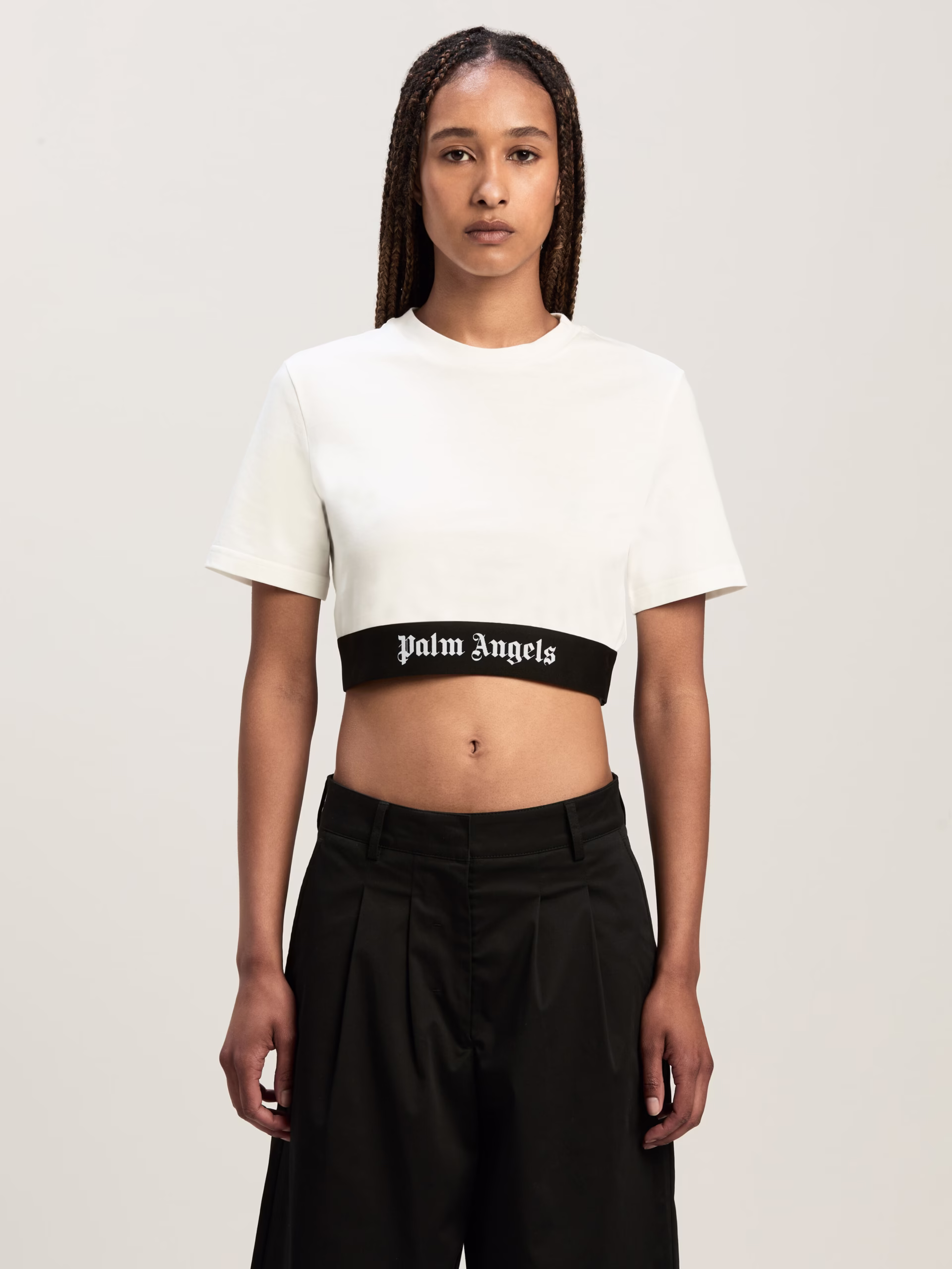 The brand’s signature streetwear spirit. Women’s white cropped t-shirt with embroidered logo on elastic waistband.