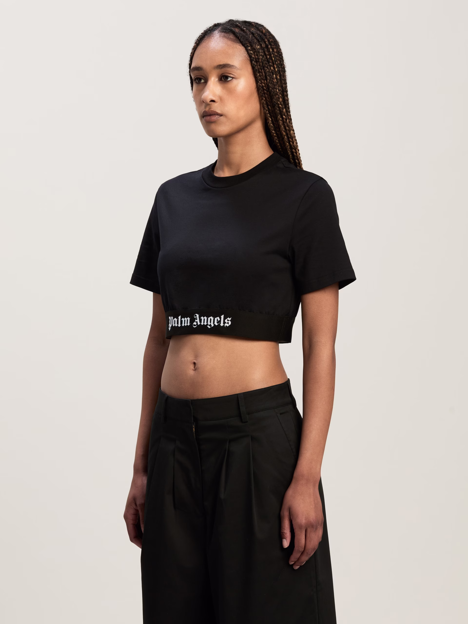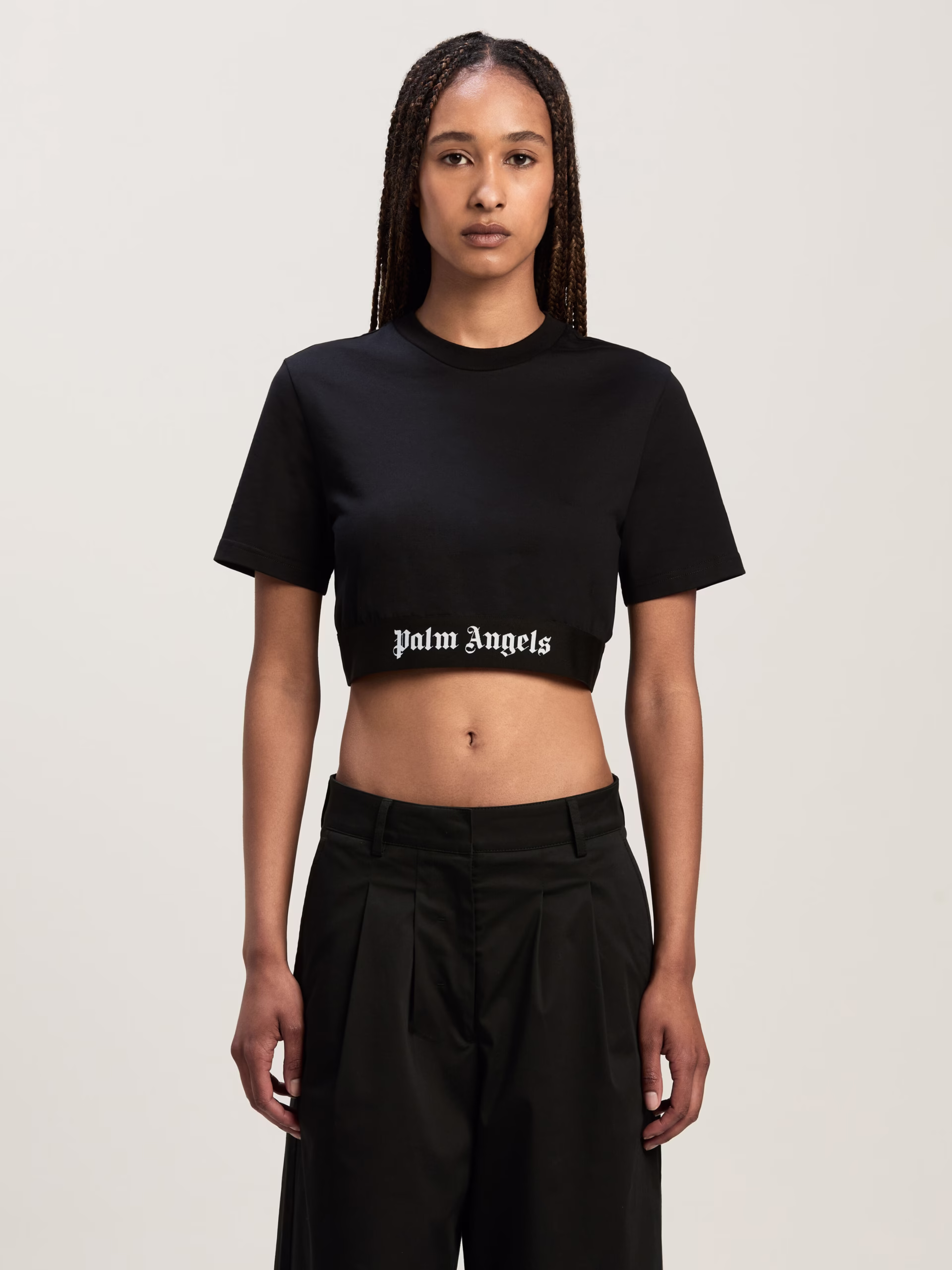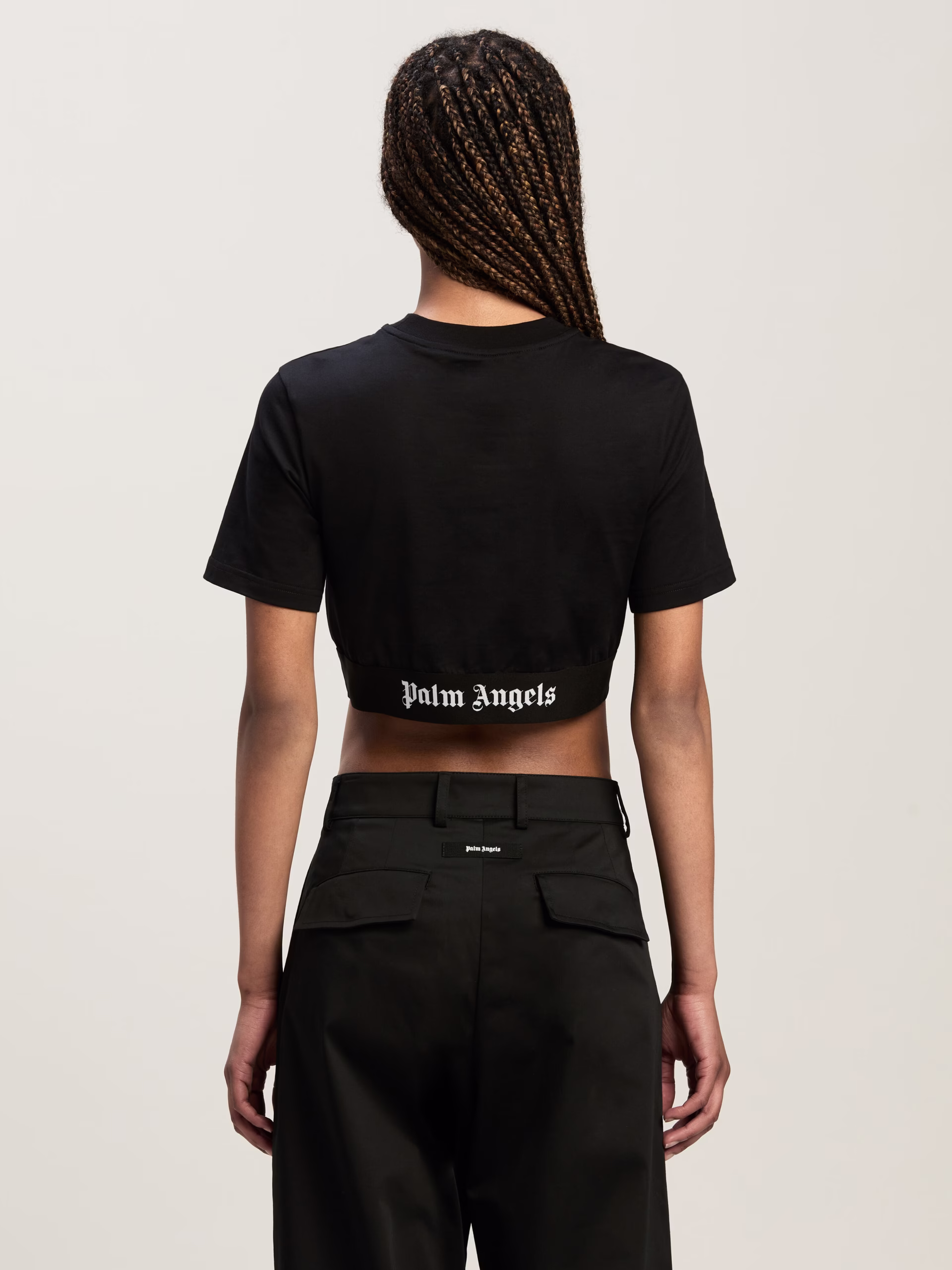 The brand’s signature streetwear spirit. Women’s black cropped t-shirt with white embroidered logo on elastic waistband.