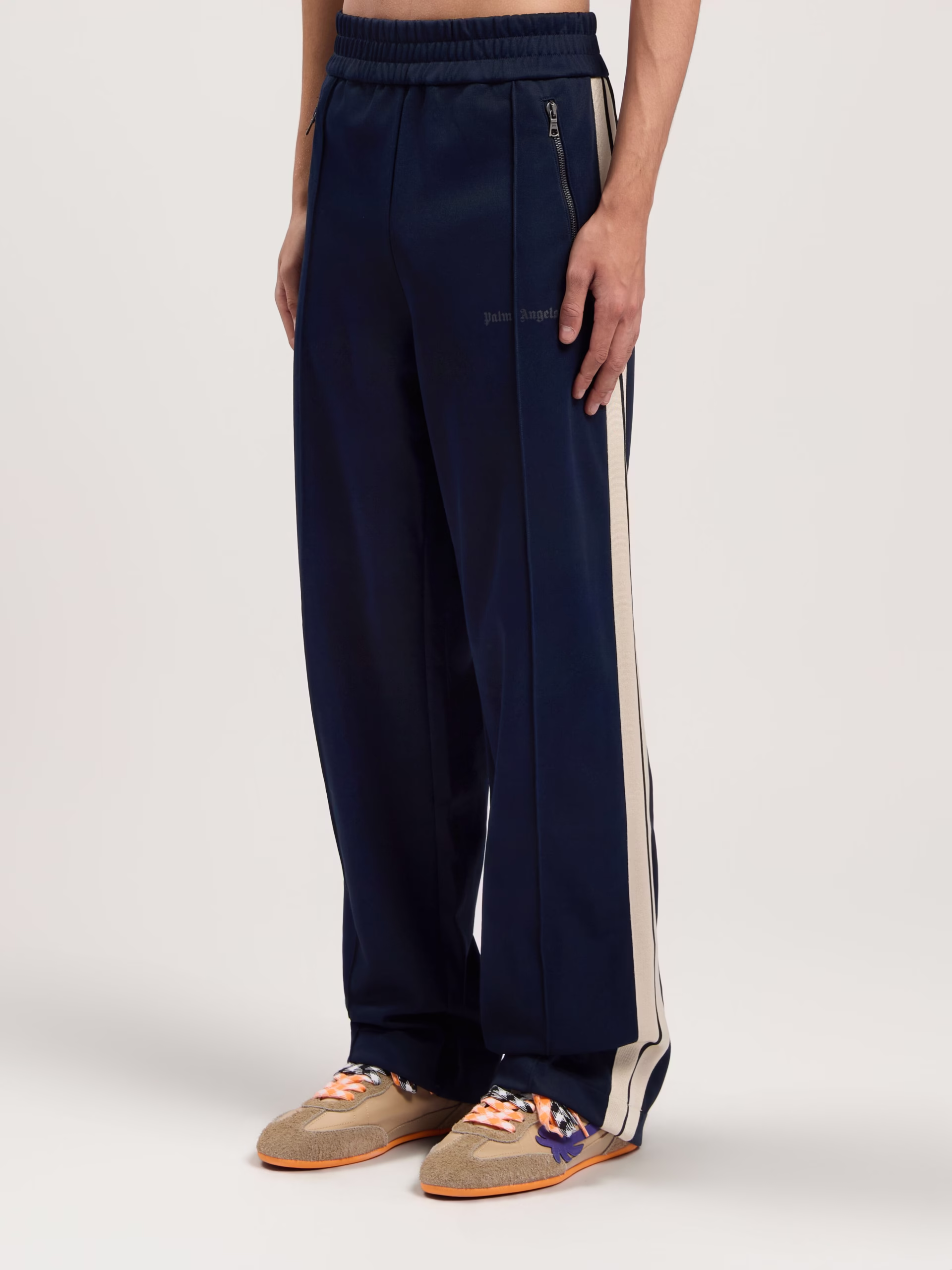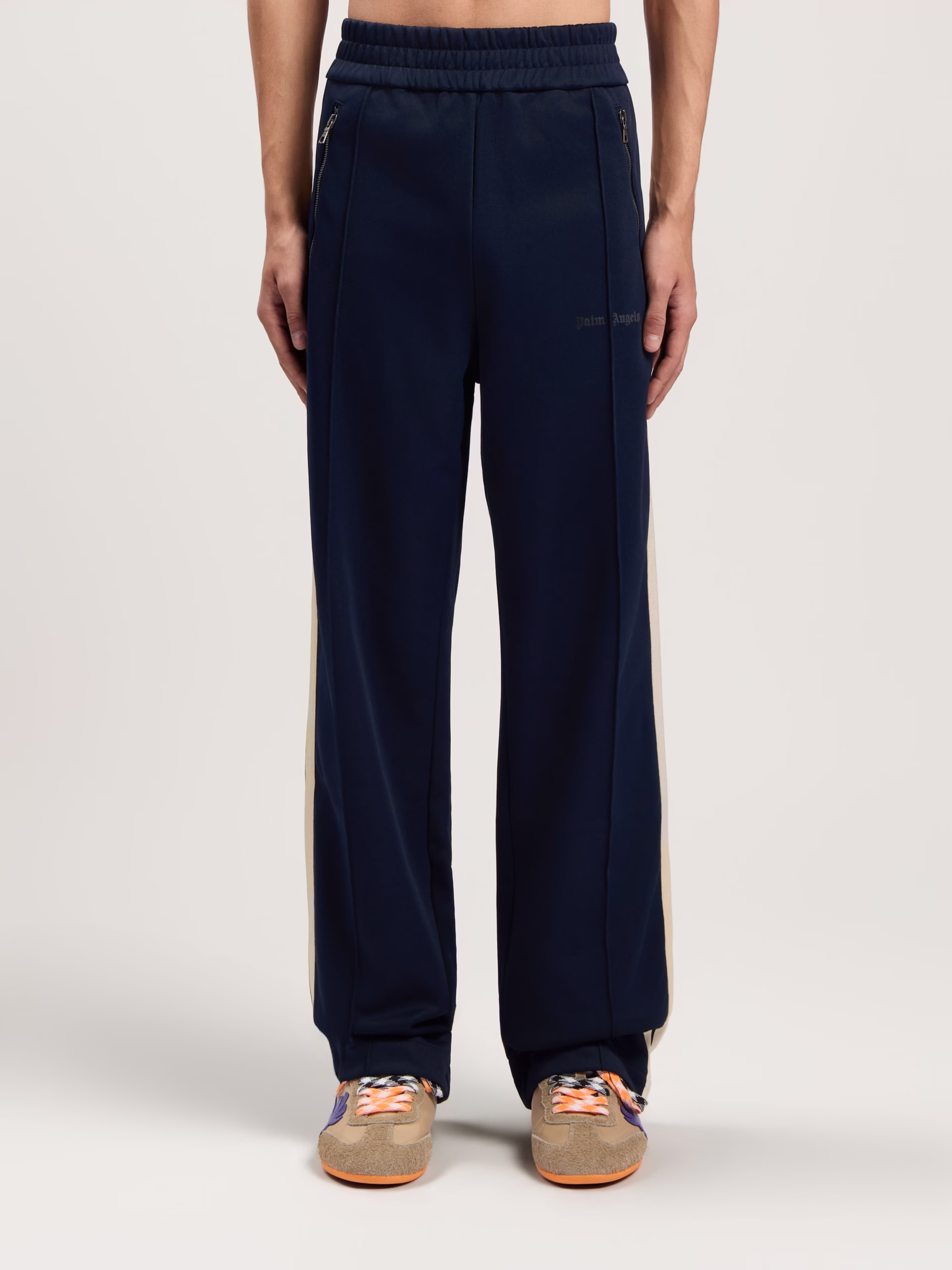 Streamlined track pants with a minimalist design, featuring a classic logo detail and zip-up pockets.
