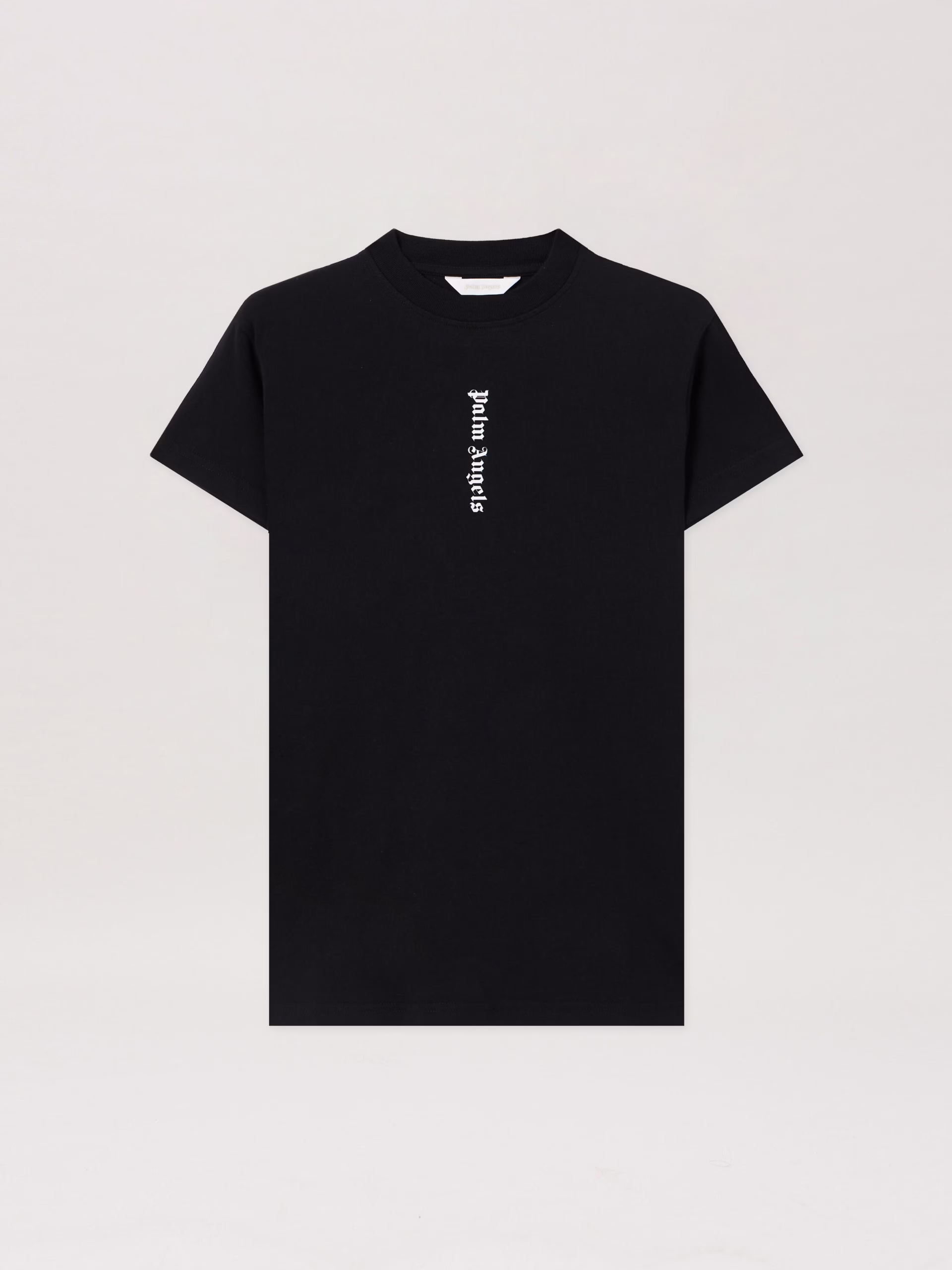 This black cotton t-shirt for boys features the vertical palm angels gothic logo on the chest. A mini essential with maxi street i