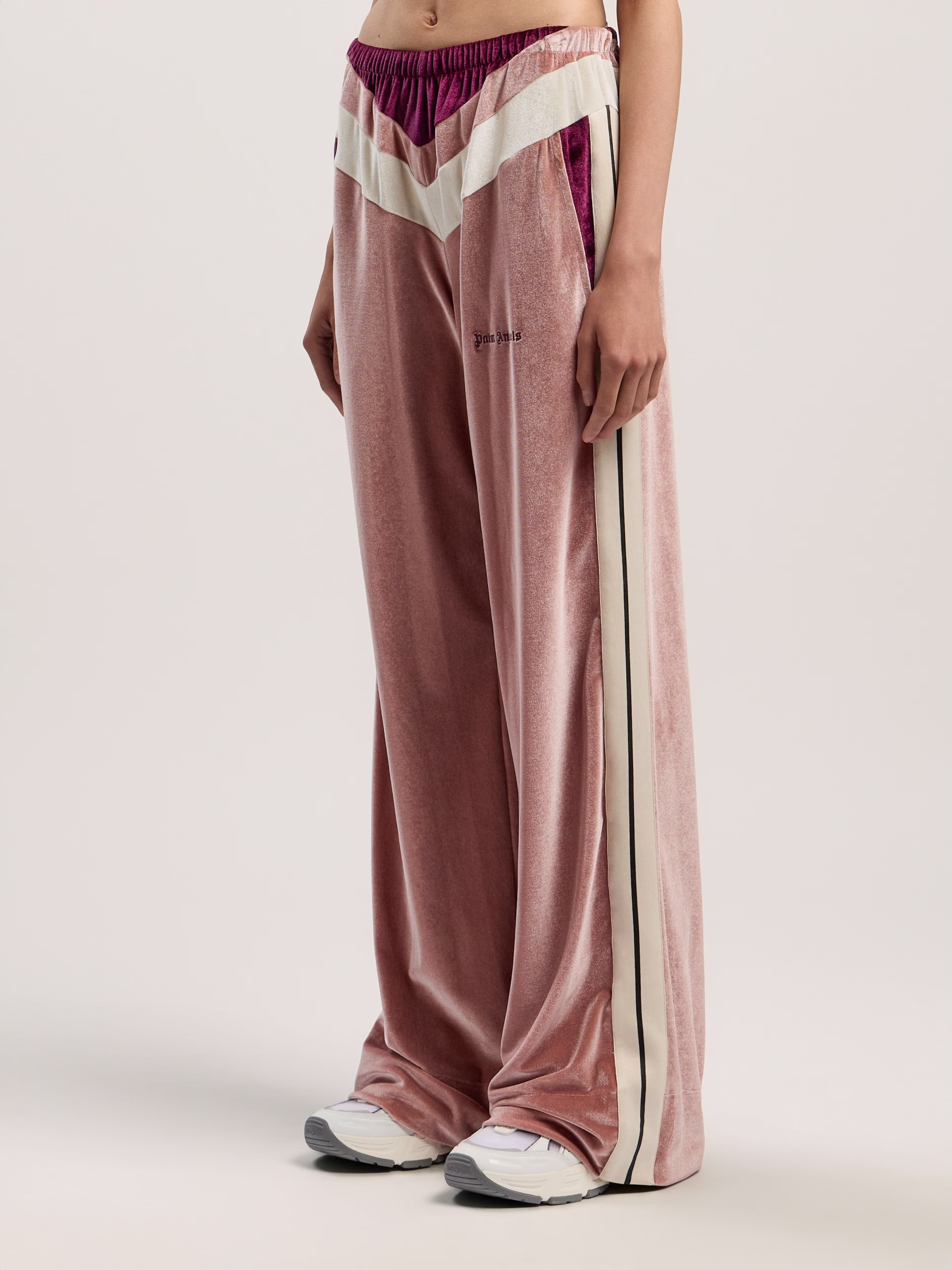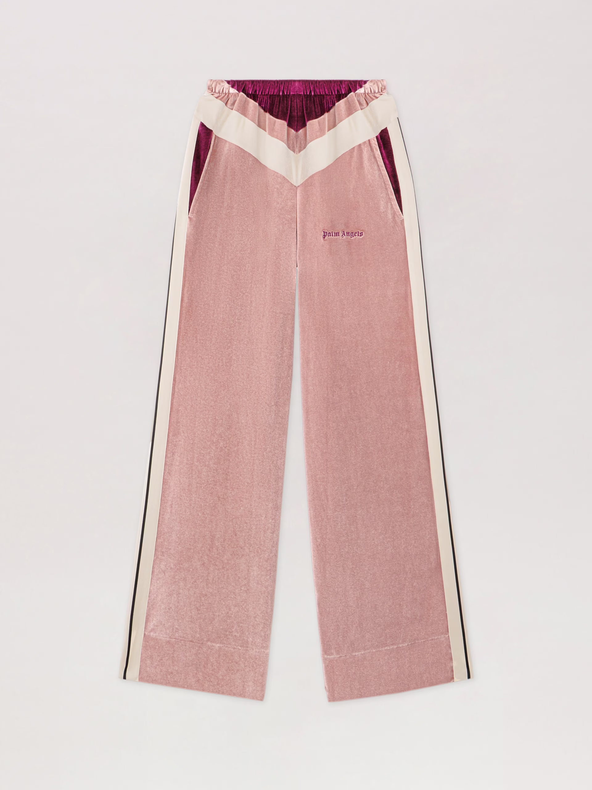 Luxuriously soft chenille track pants featuring a bold colorblock design, embodying a seamless fusion of streetwear and high fa