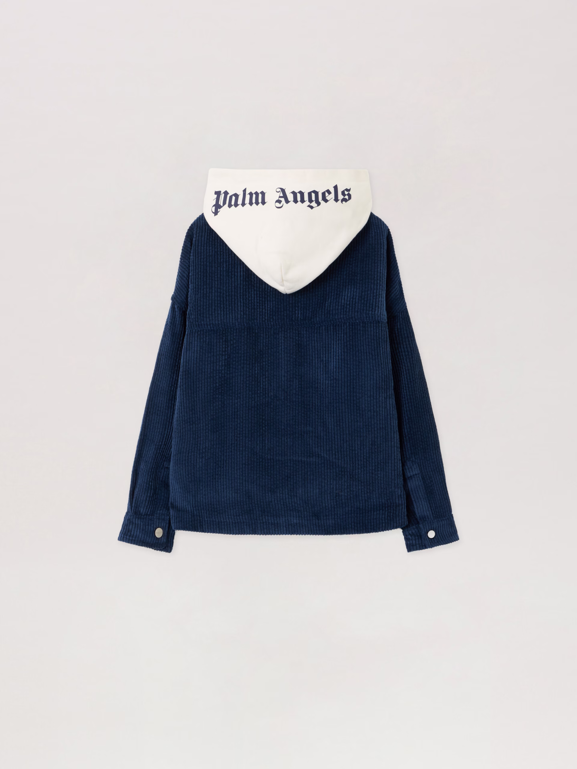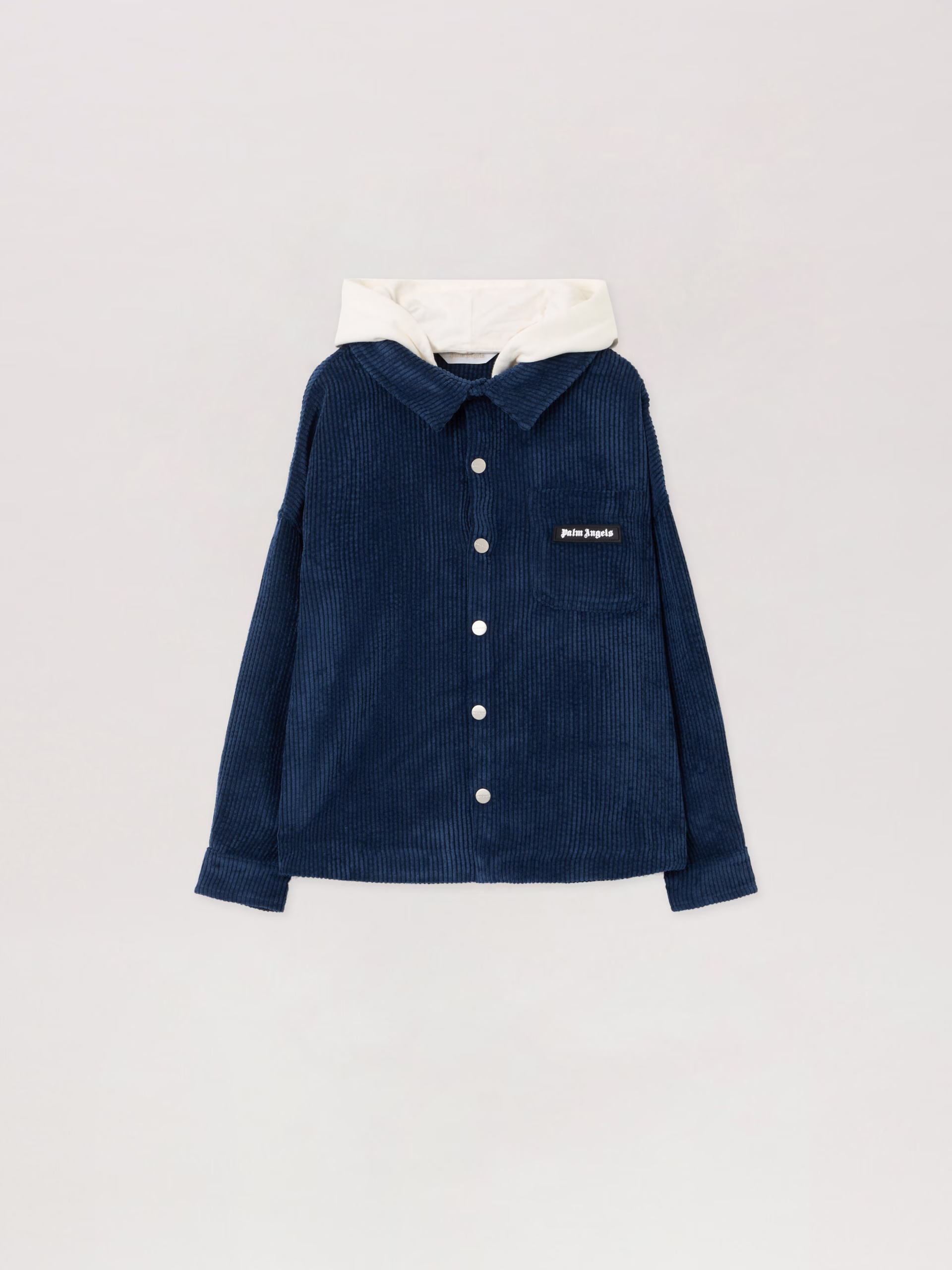 This corduroy hooded shirt jacket combines streetwear aesthetics with a refined silhouette, featuring a classic logo and versat