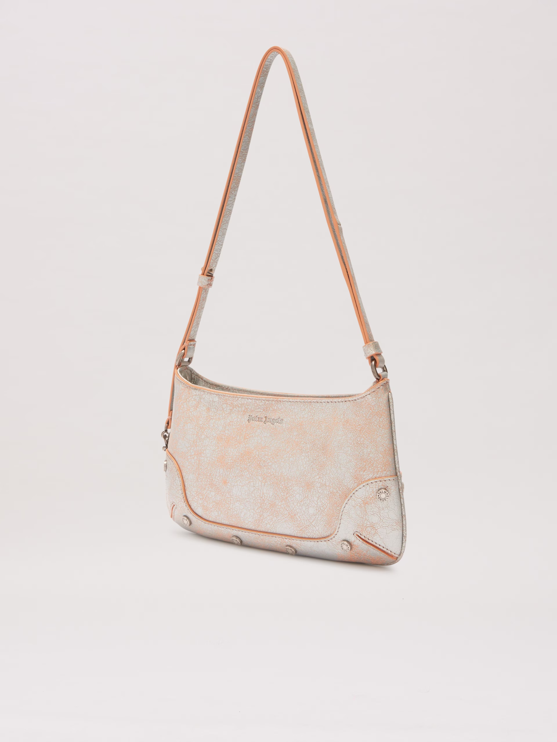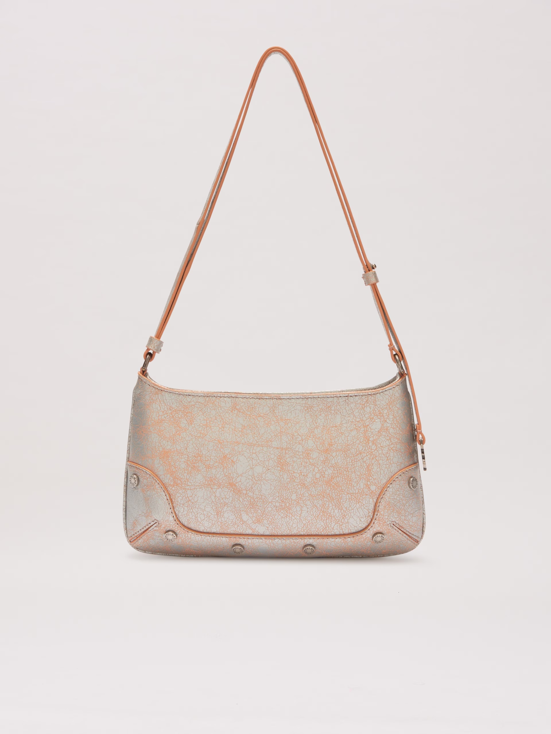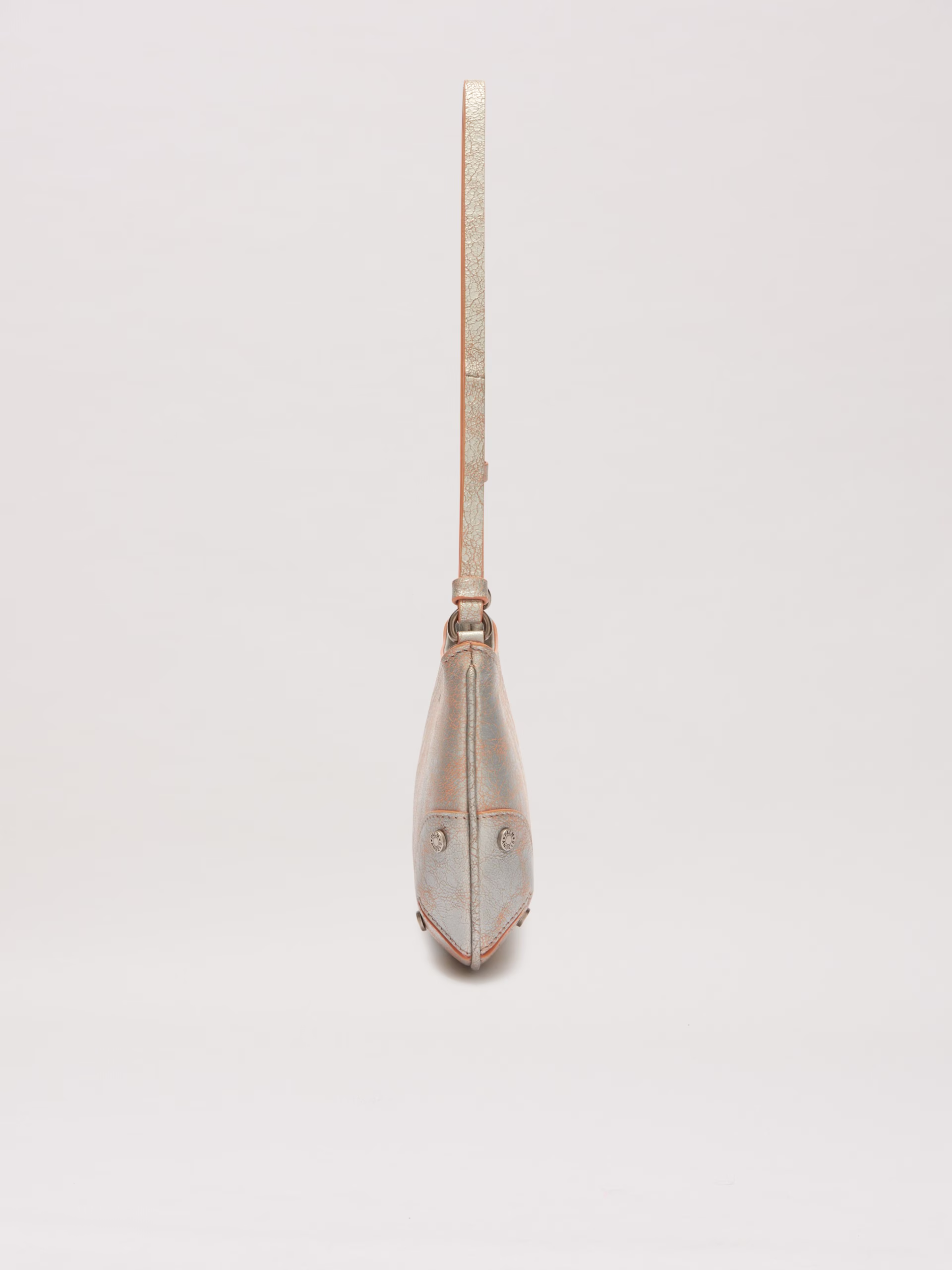 An unmistakable shape with a unprecedented metal finish. Women’s silver leather Giorgina bag with crackle effect, golden detailing