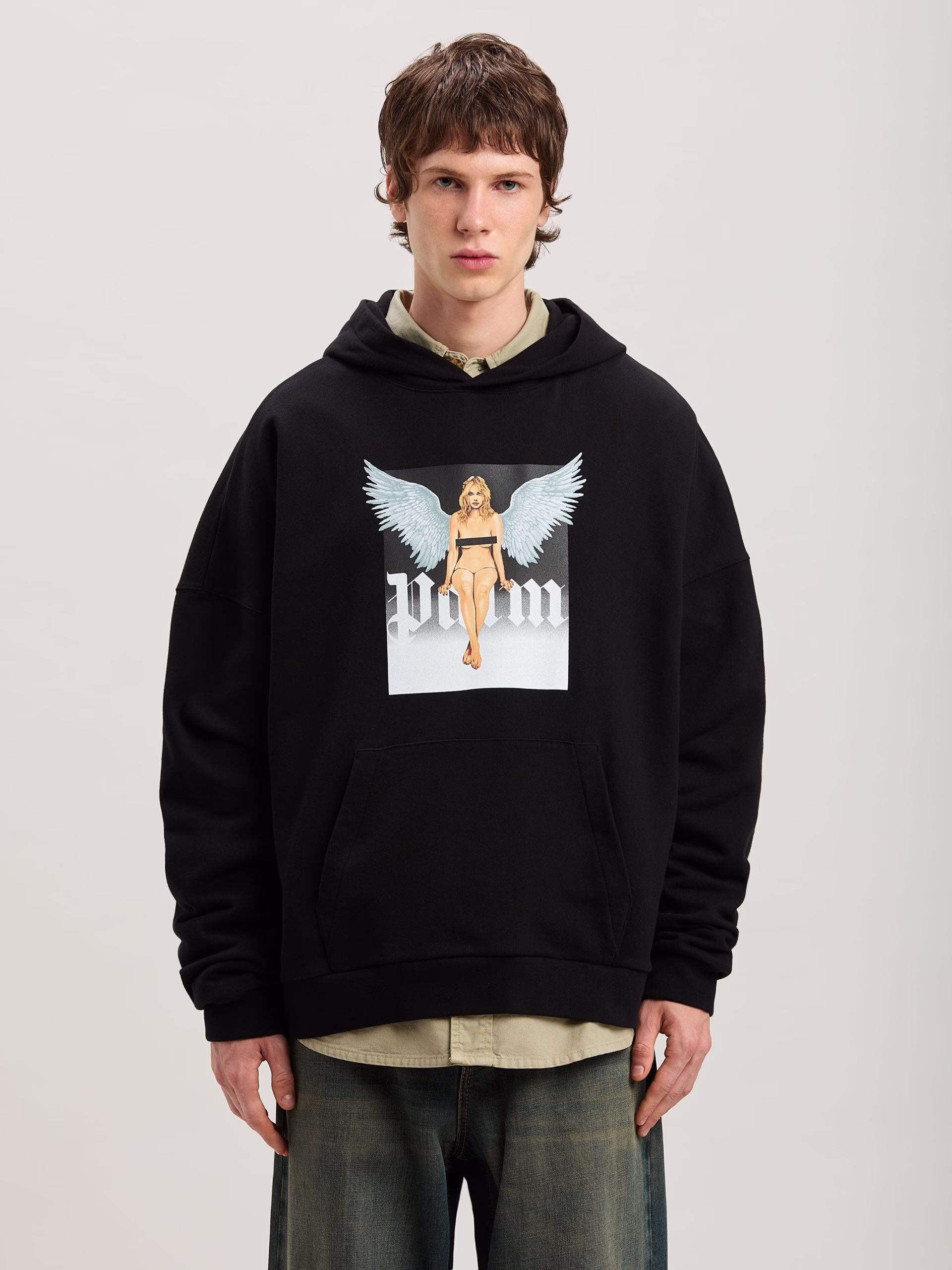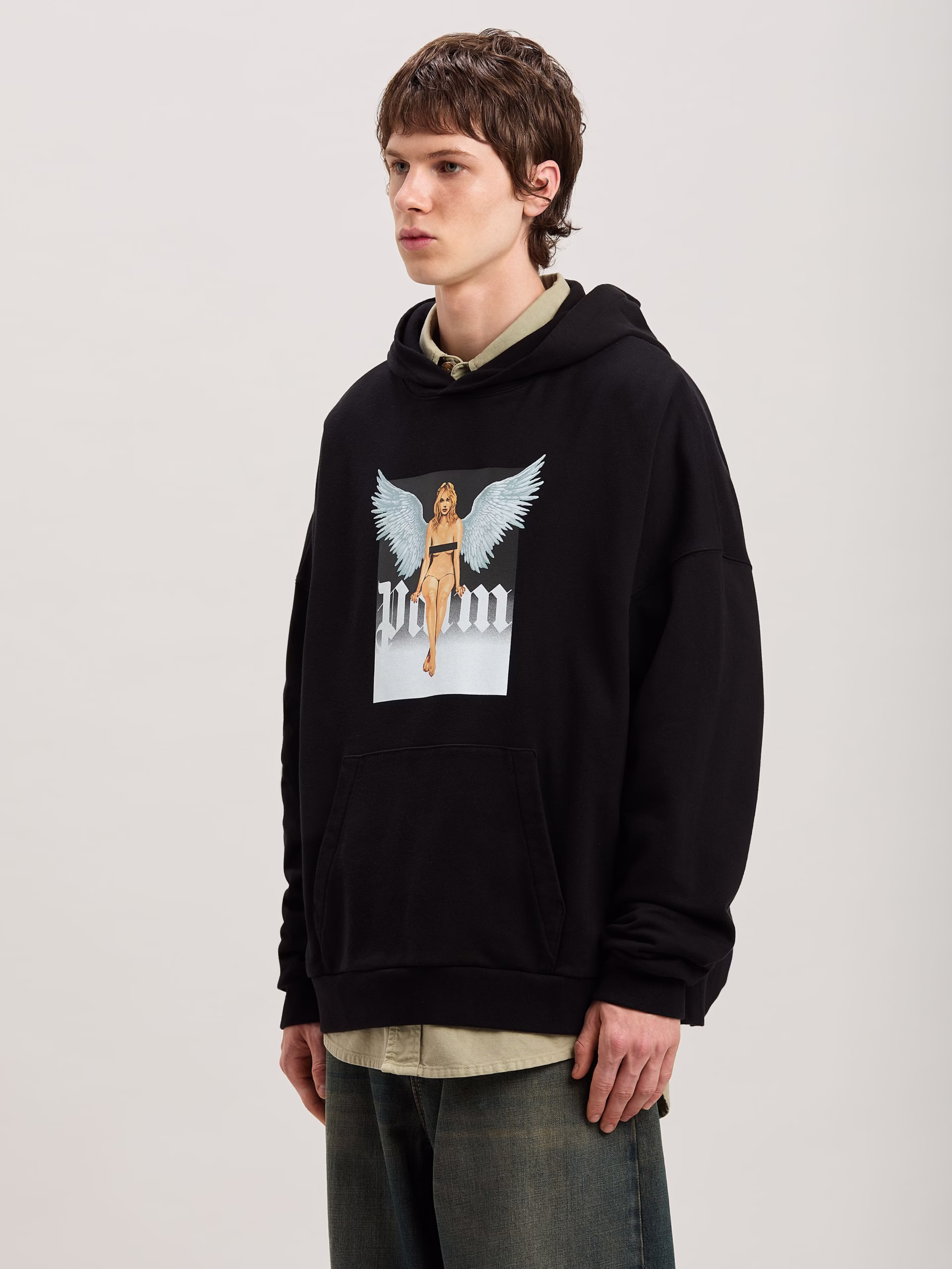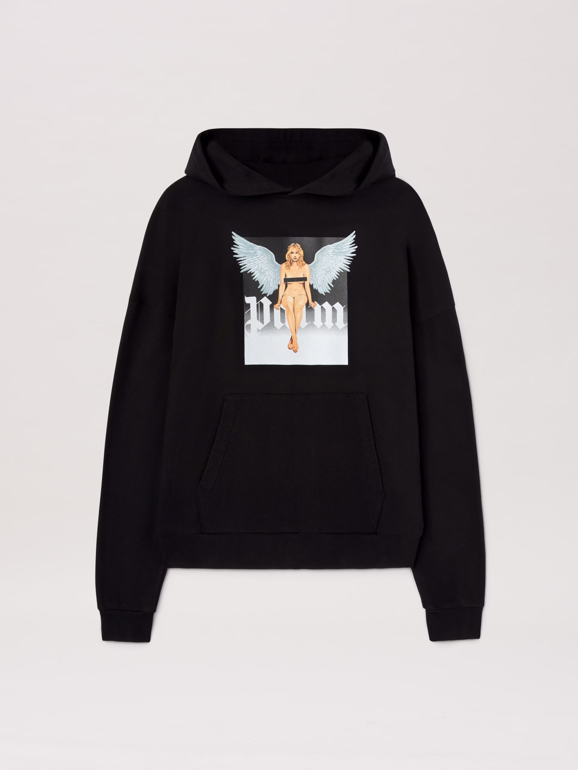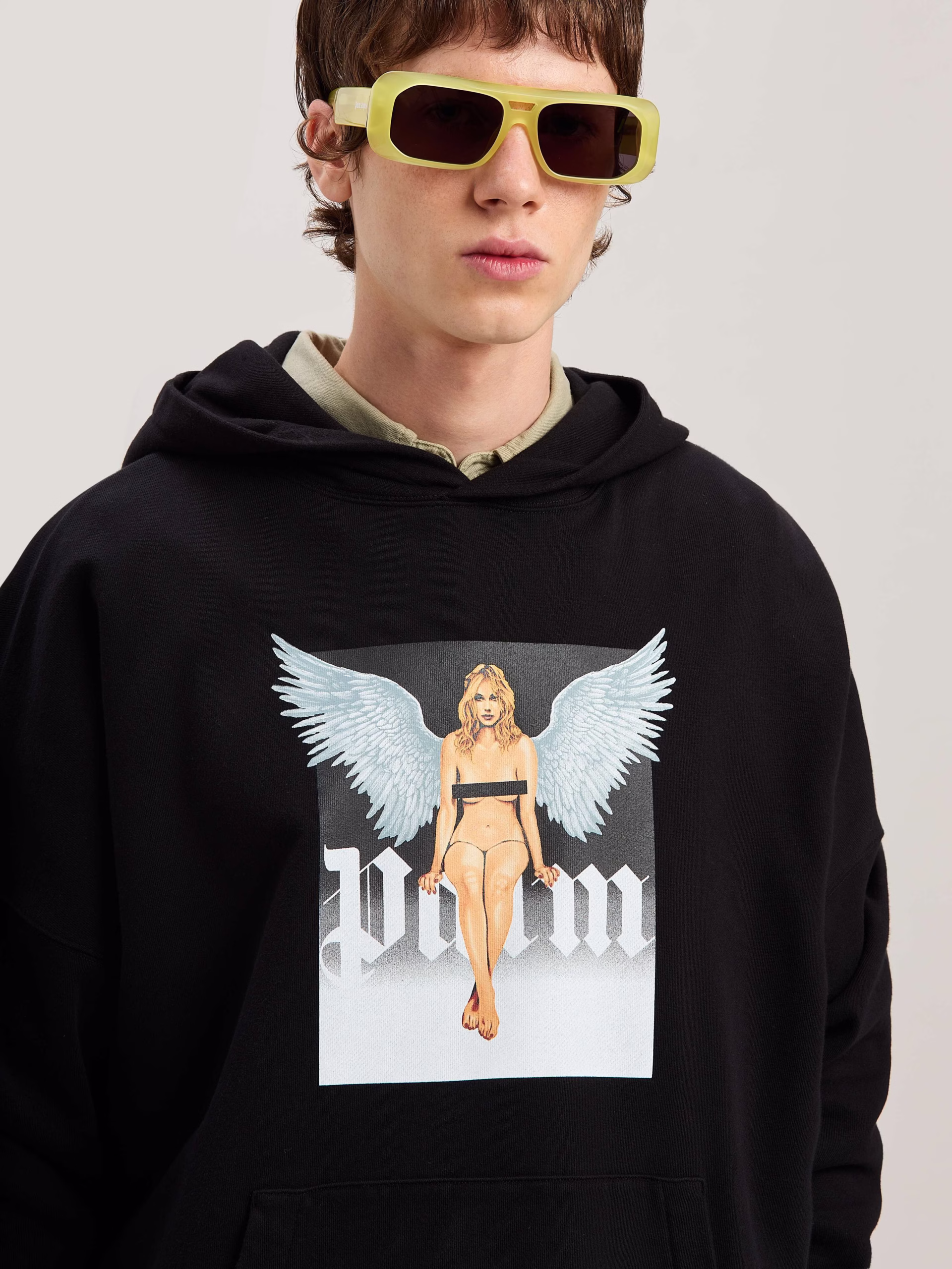 A unique original print inspired by vintage pin-ups, hybridized with elements from Palm Angels’ world. Men’s black hoodie with ima