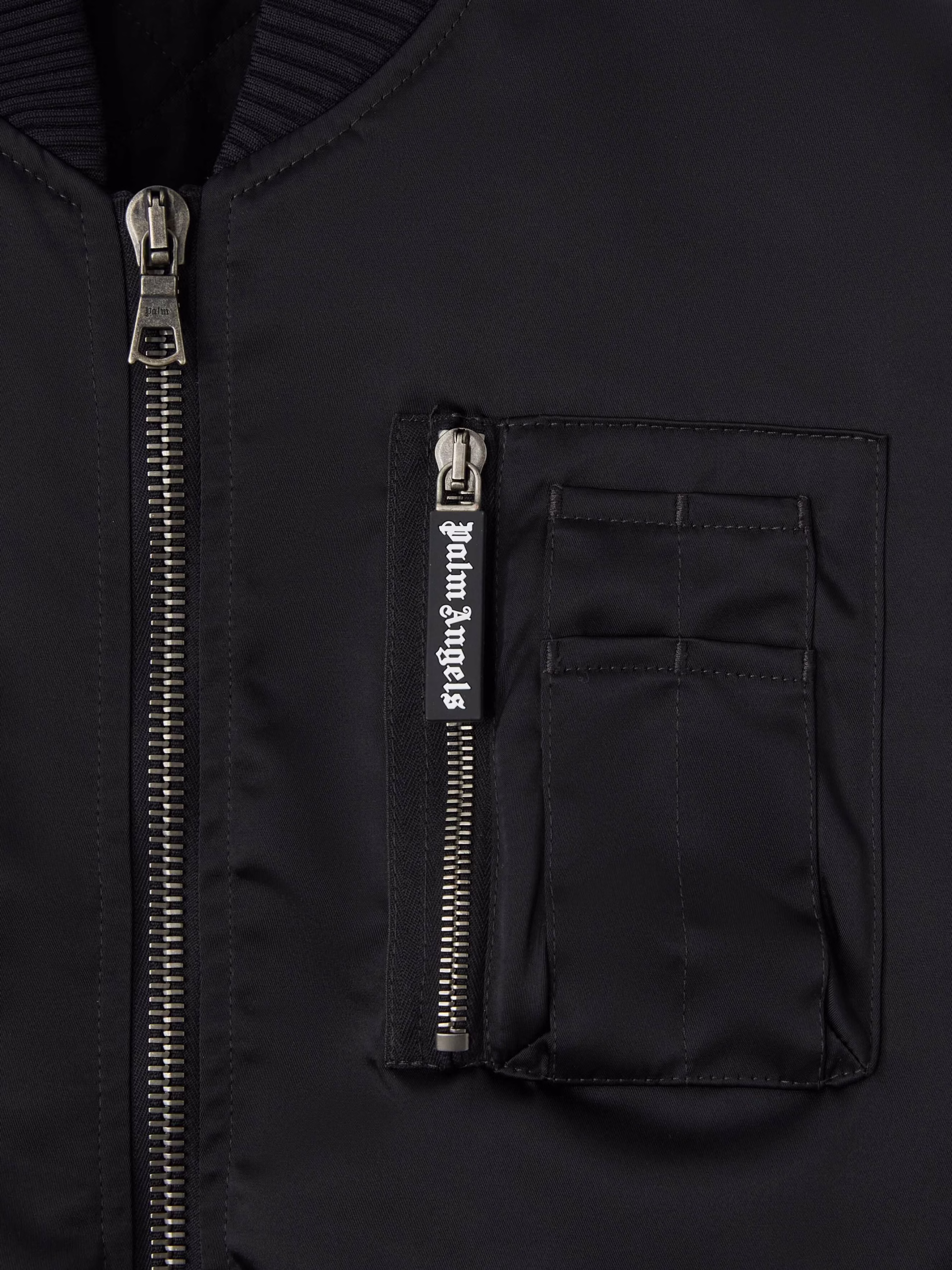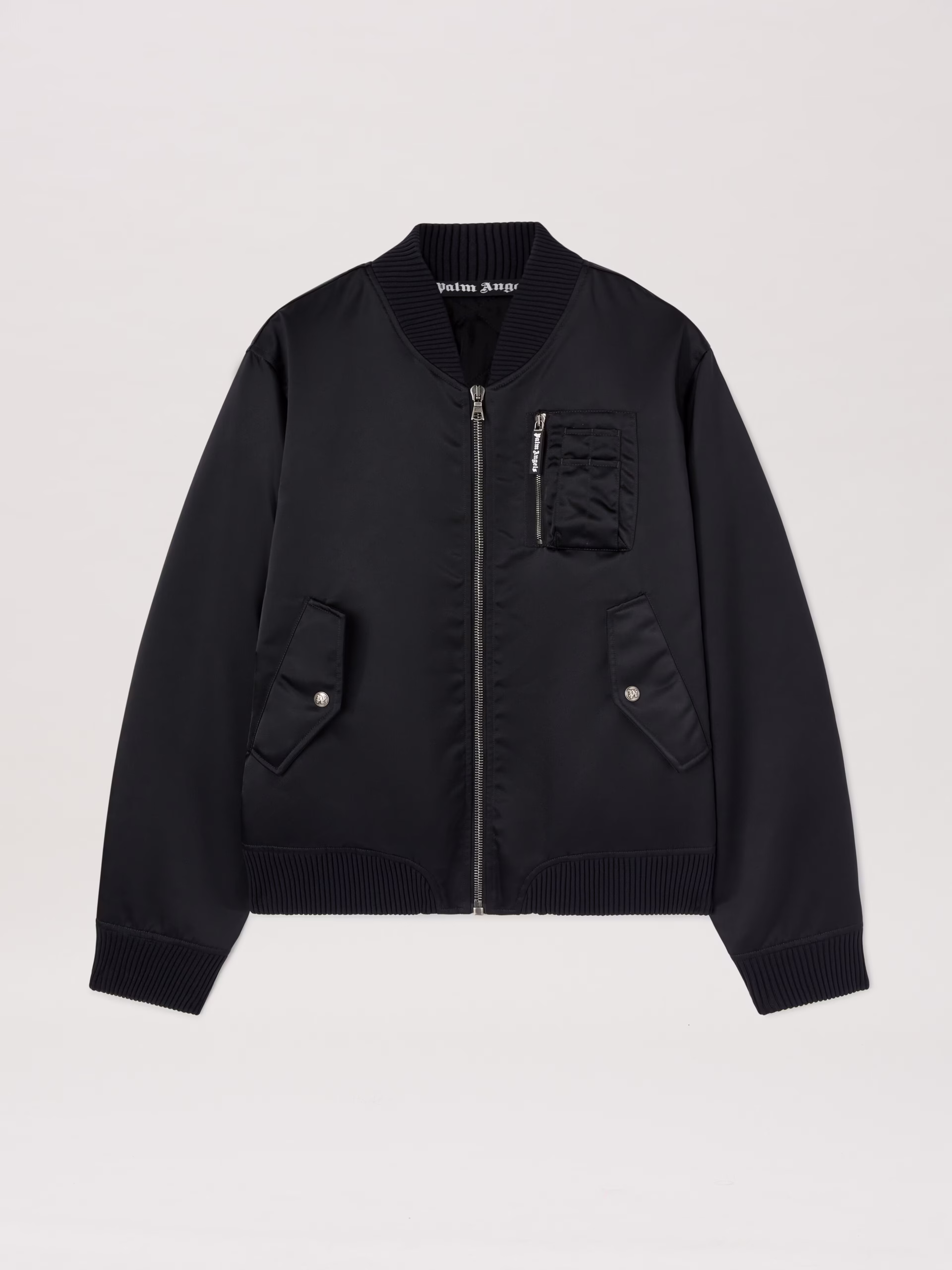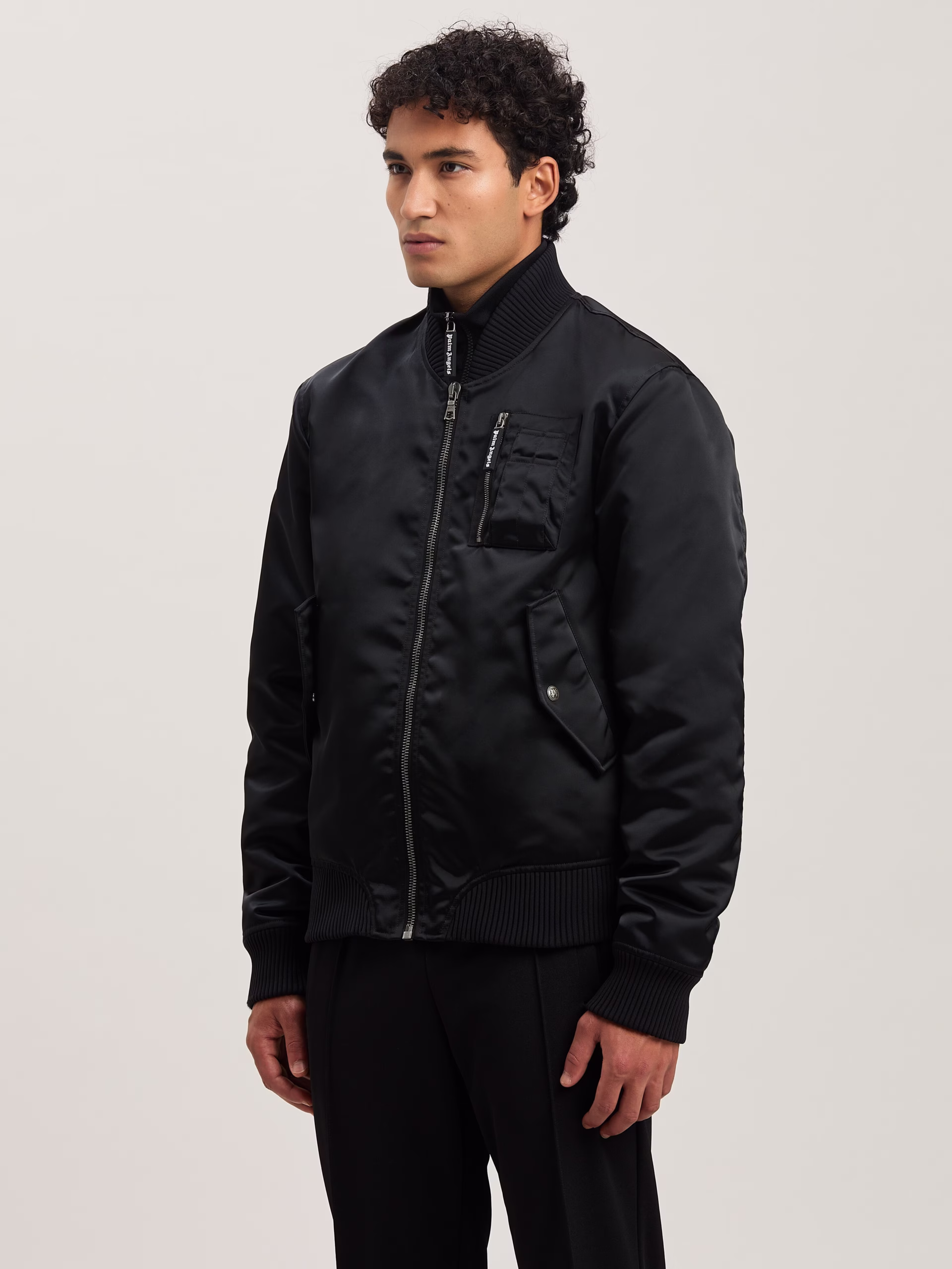 Pragmatic windbreakers with a new version of the logo. Men’s glossy black bomber jacket with ribbed details, multifunction chest p