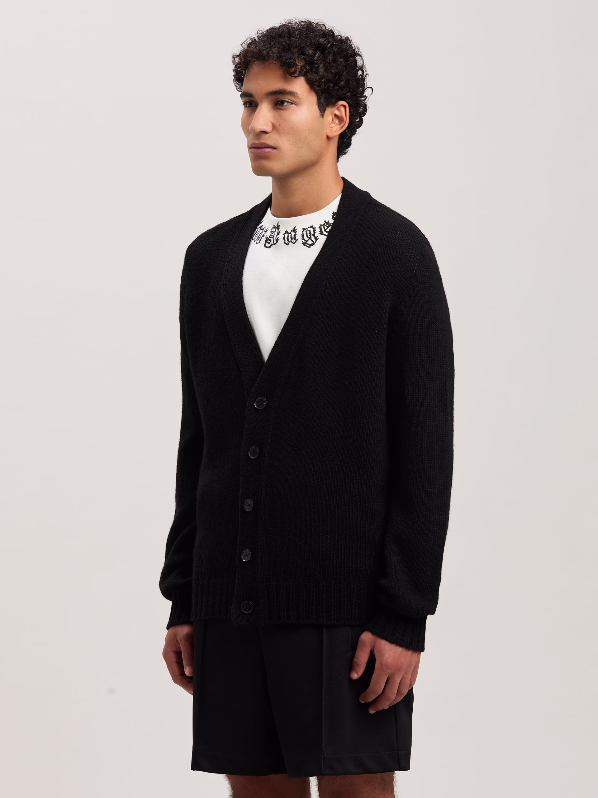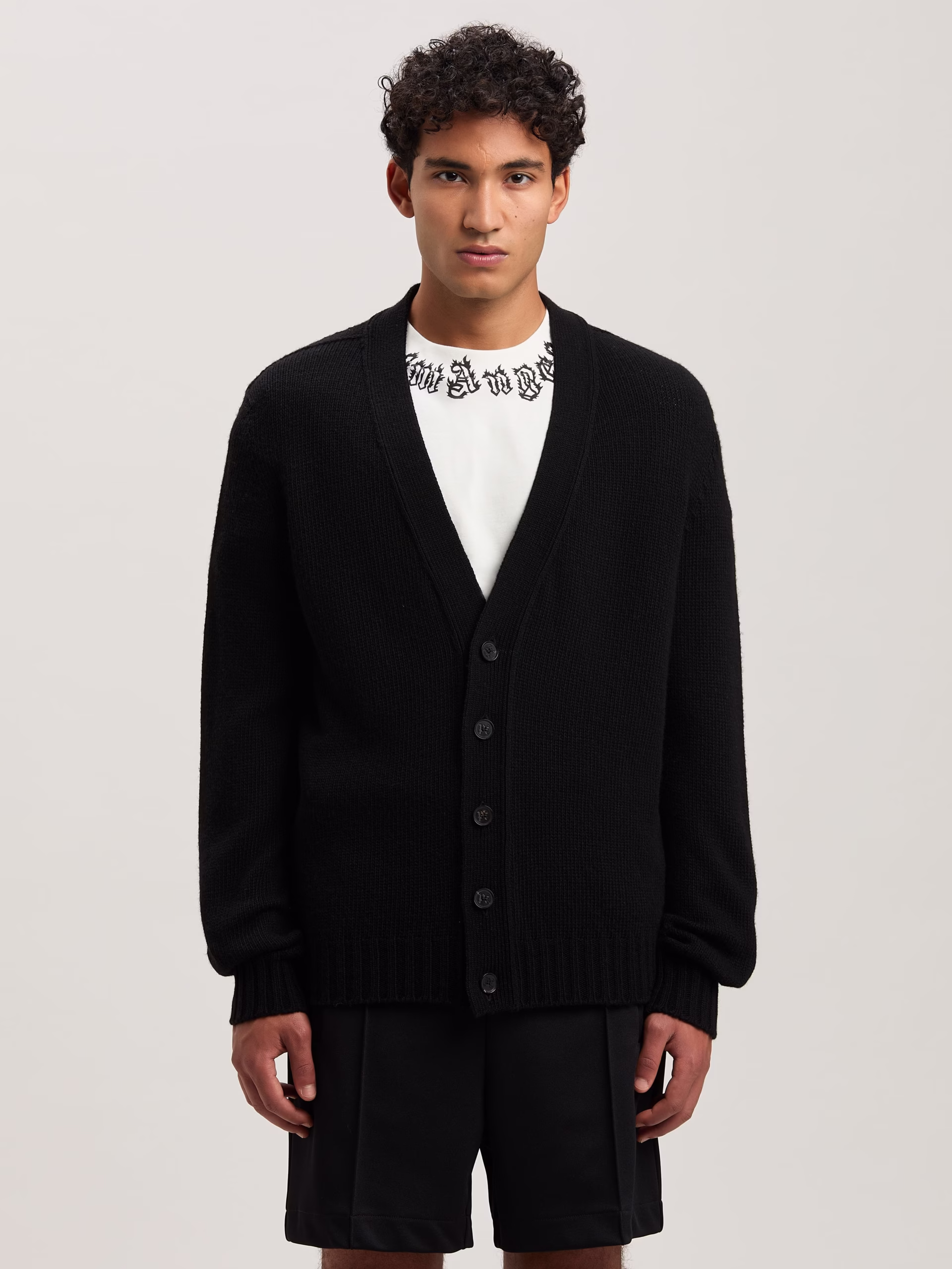Leisurewear is more sophisticated when knitted. Men’s black knitted V neck cardigan, with buttons closure and Curved logo embroide