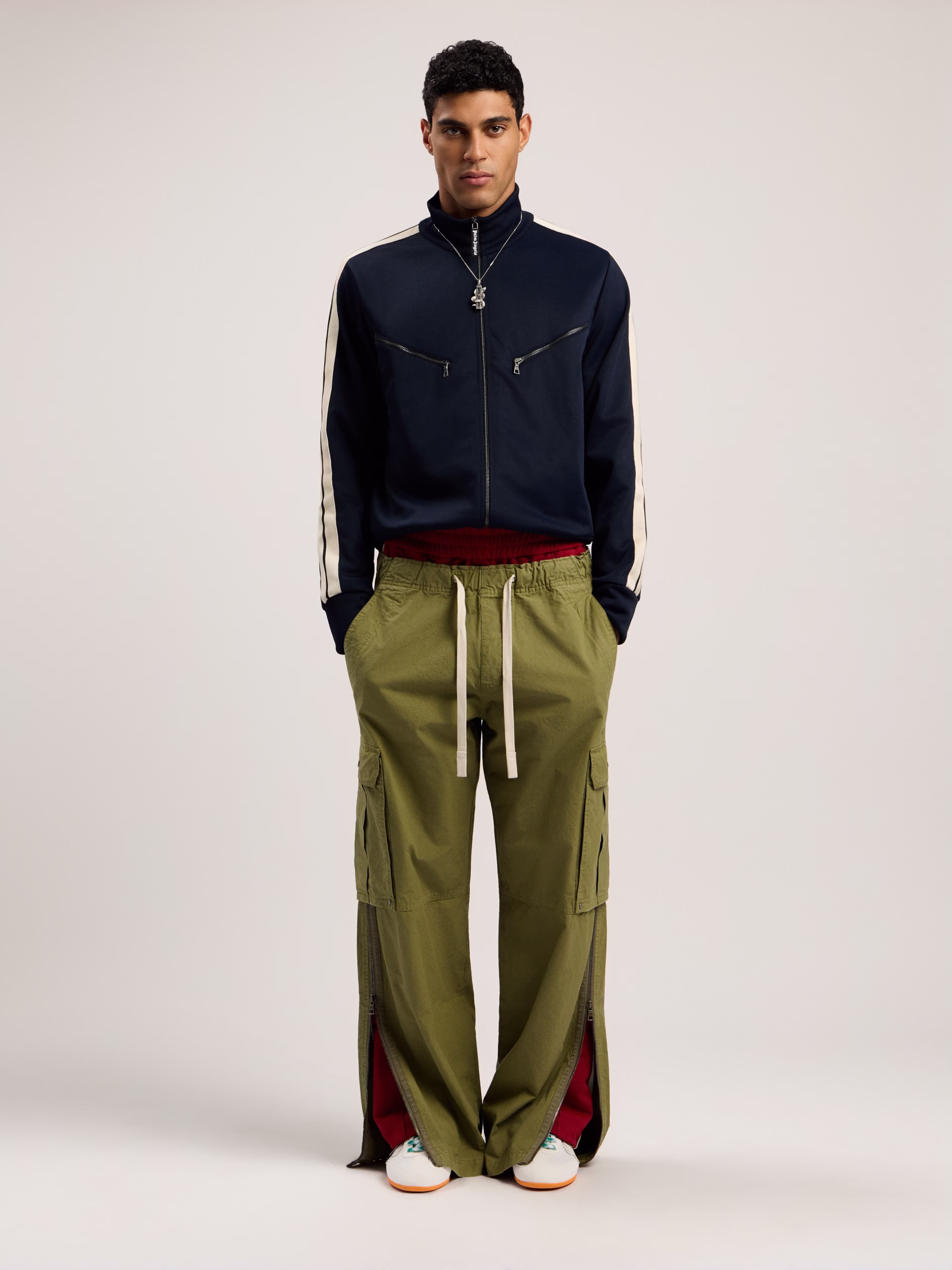 Wide-leg cargo pants crafted from durable fabric featuring an elasticated waistband and signature curved logo detail at the rea