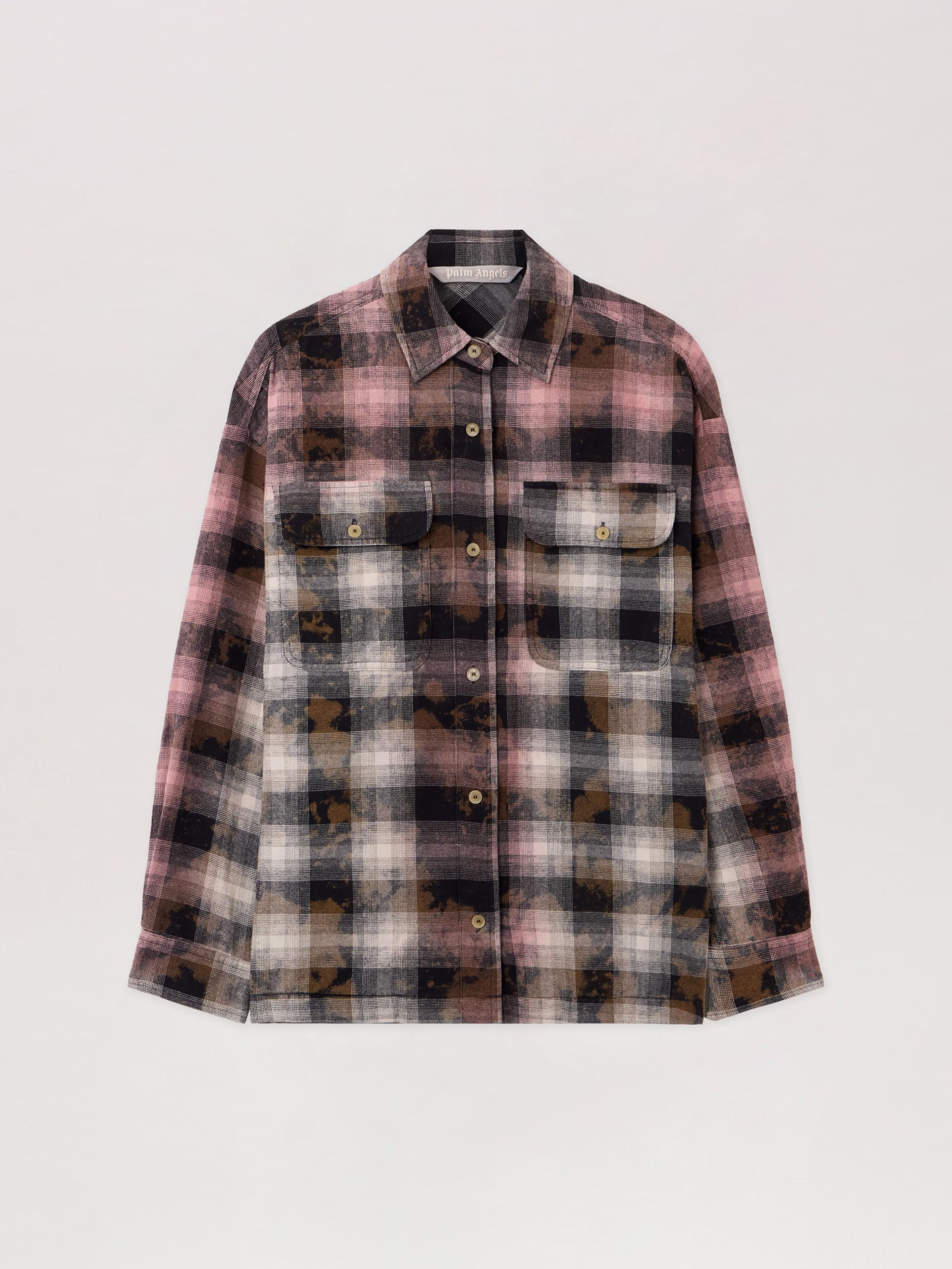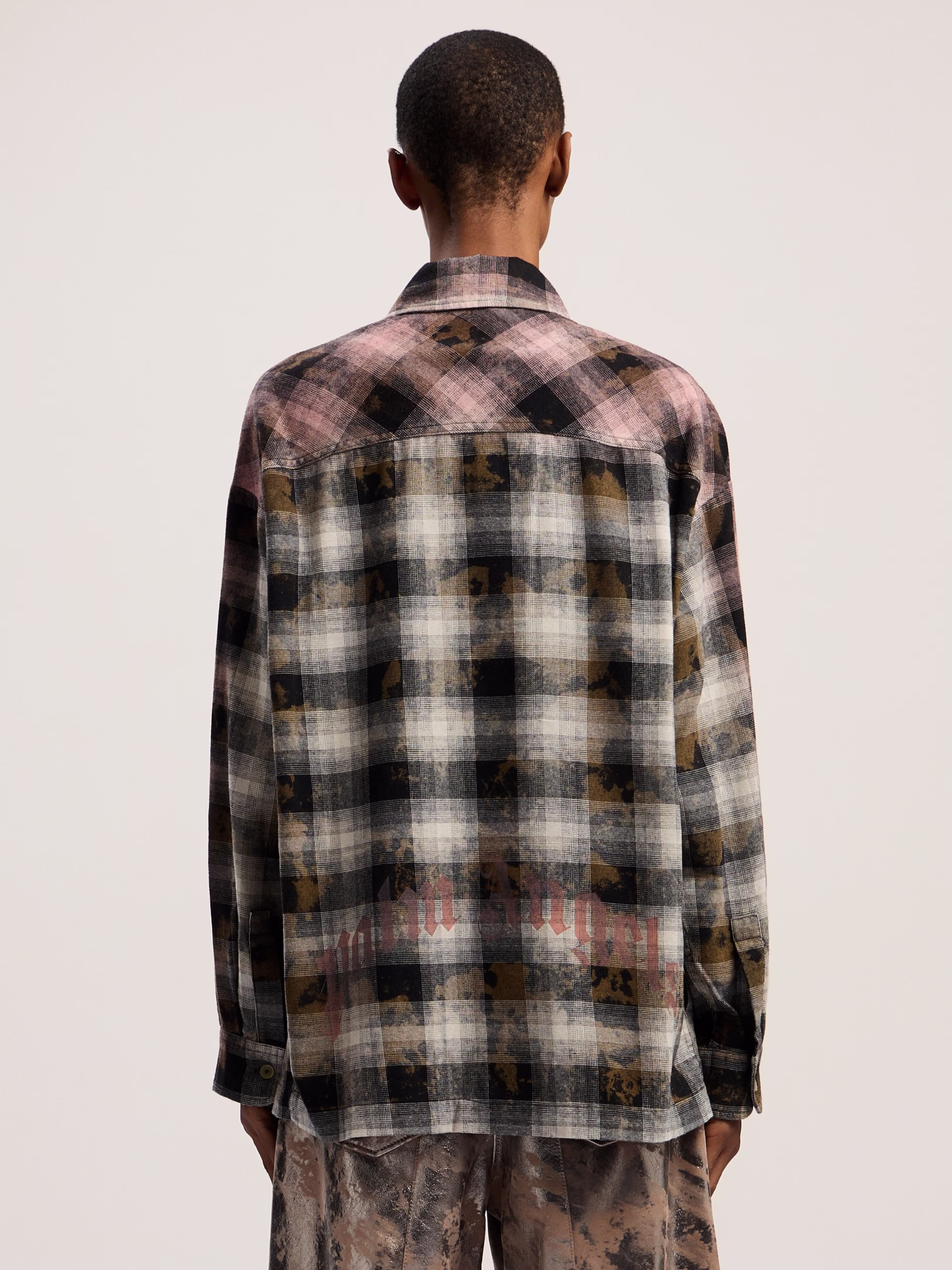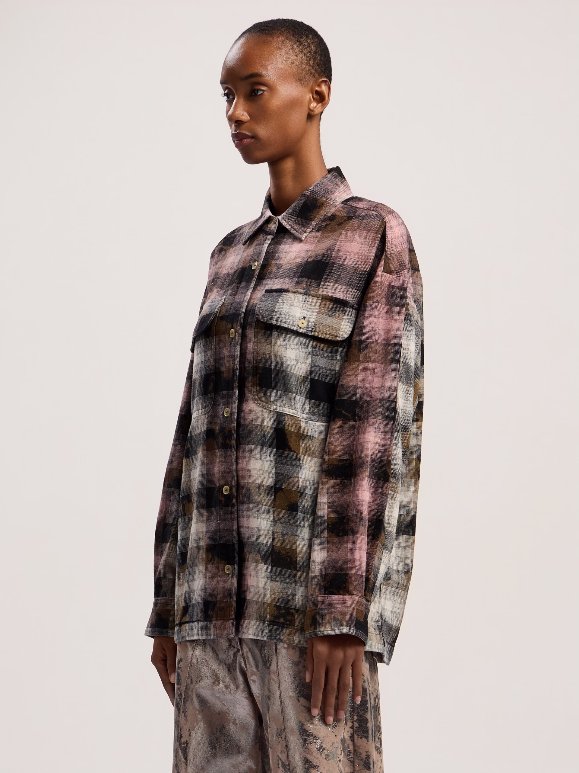 The Curved Logo Coated Checkshirt is an oversized plaid shirt featuring a unique coated finish and signature logo detailing.