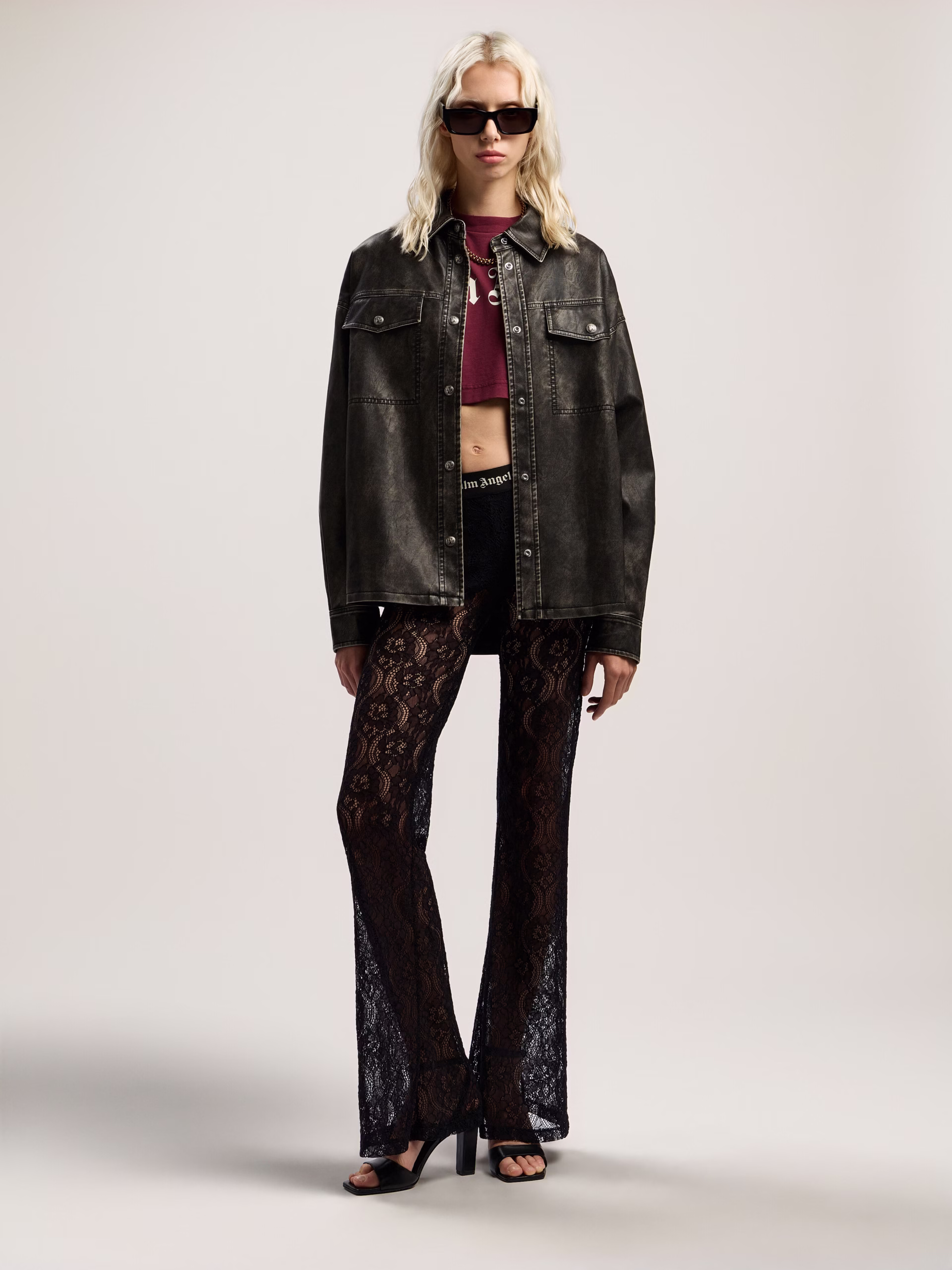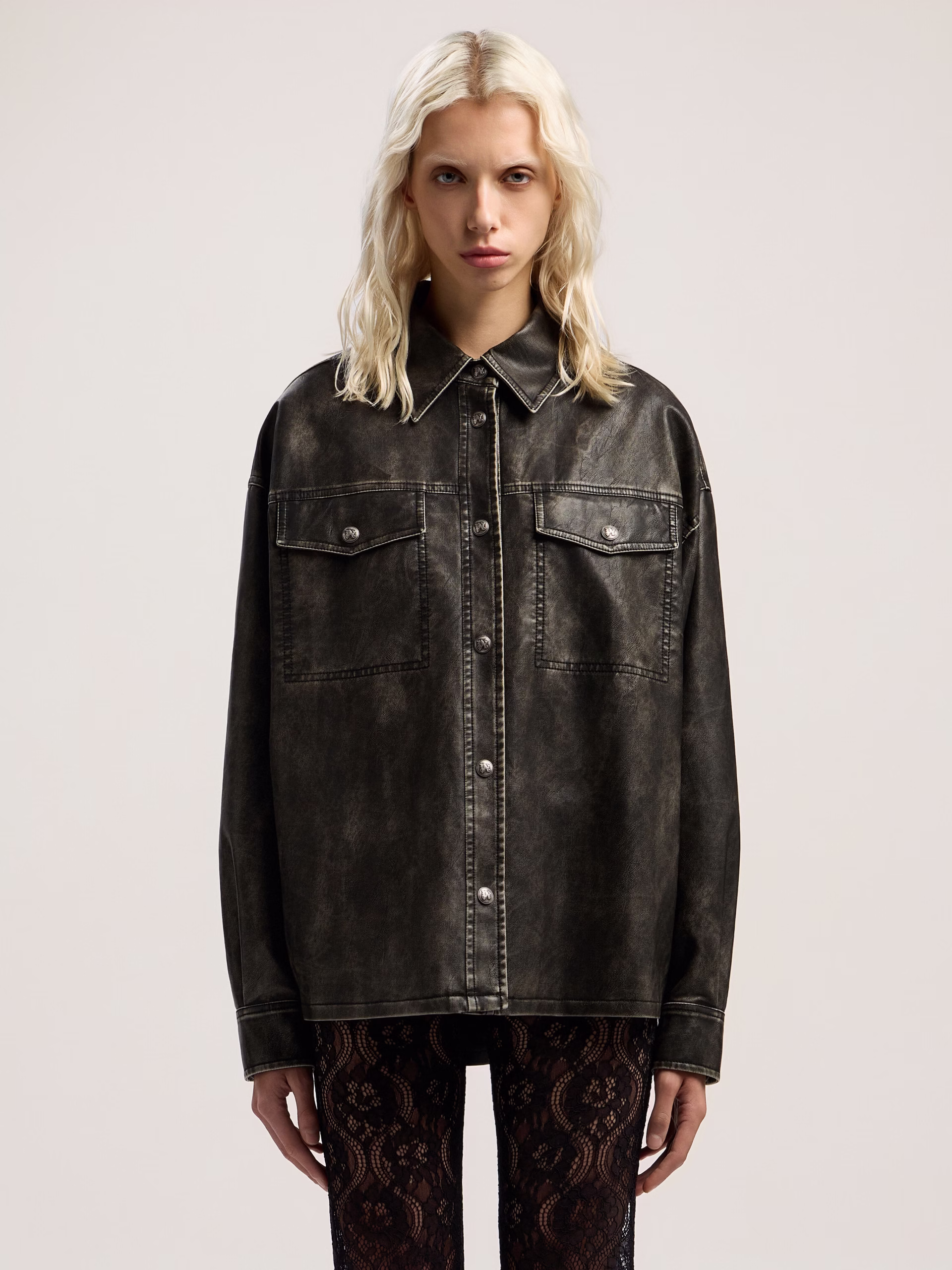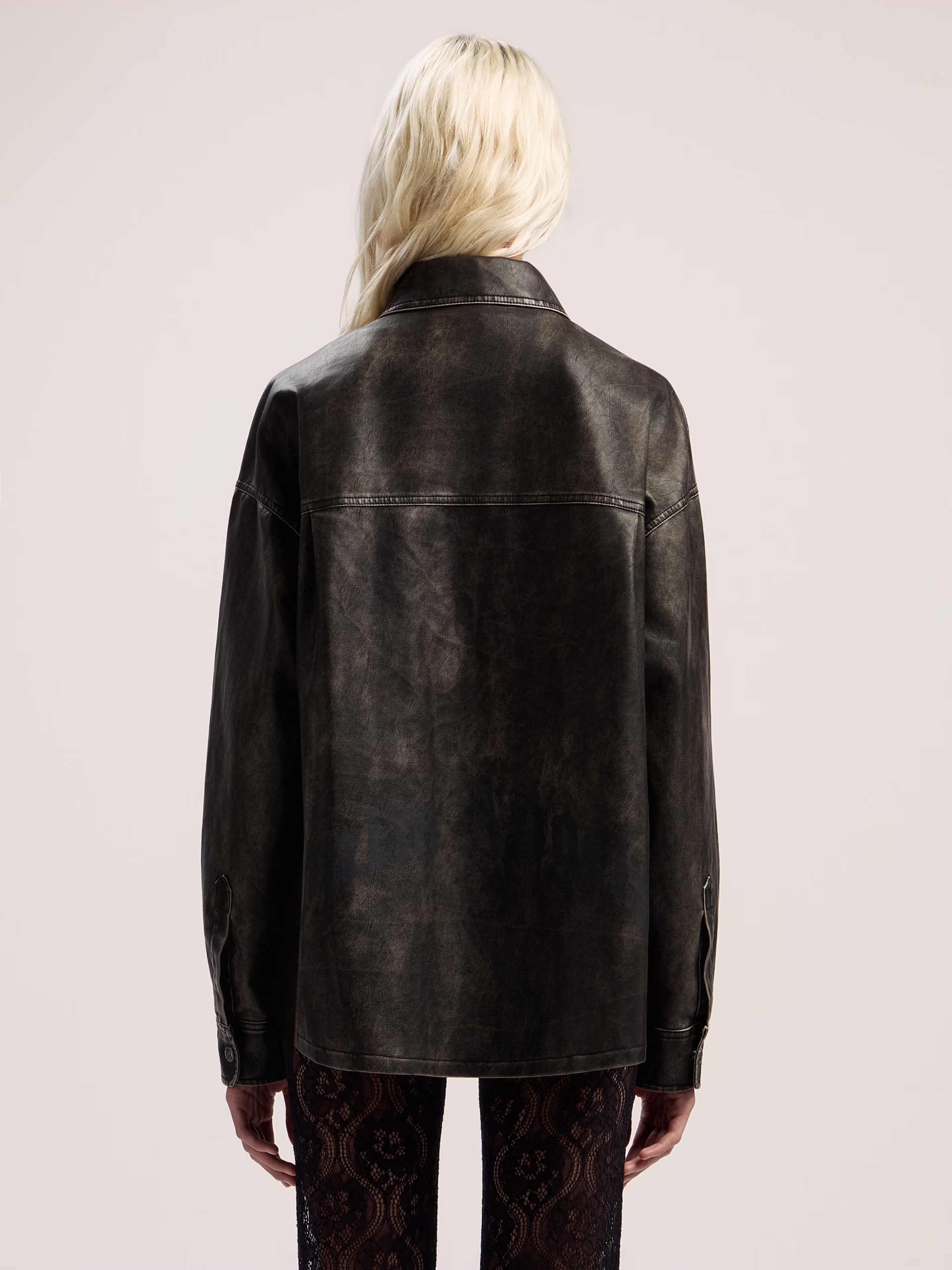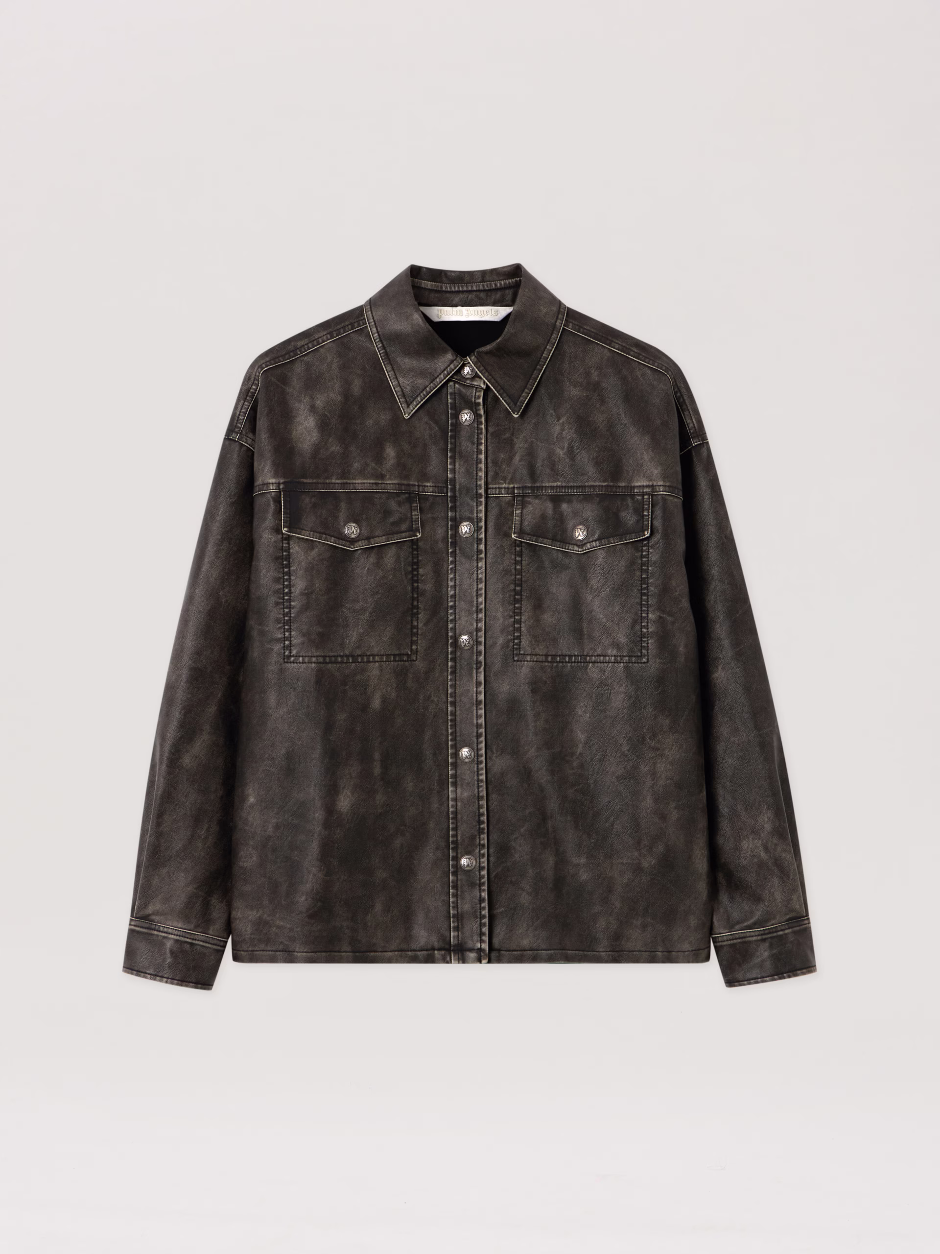Coated overshirt featuring a curved logo design and structured silhouette, offering a refined edge to streetwear fashion.