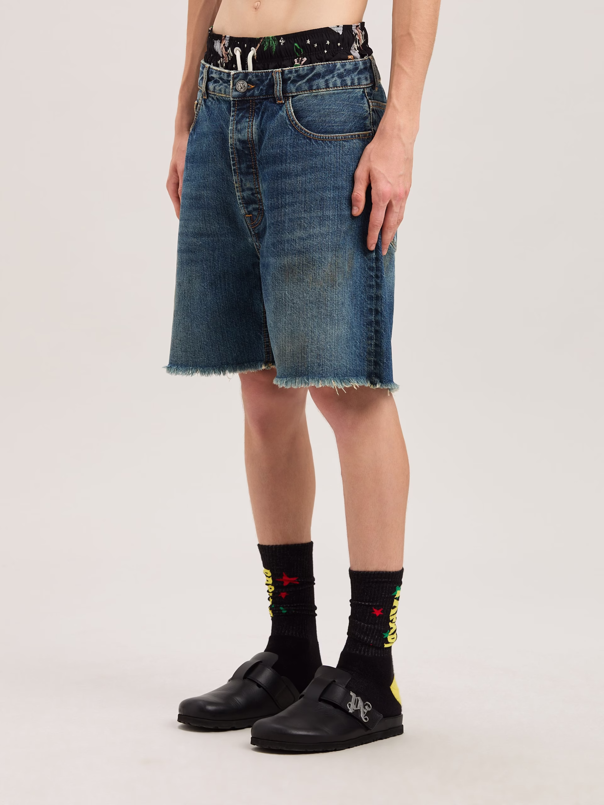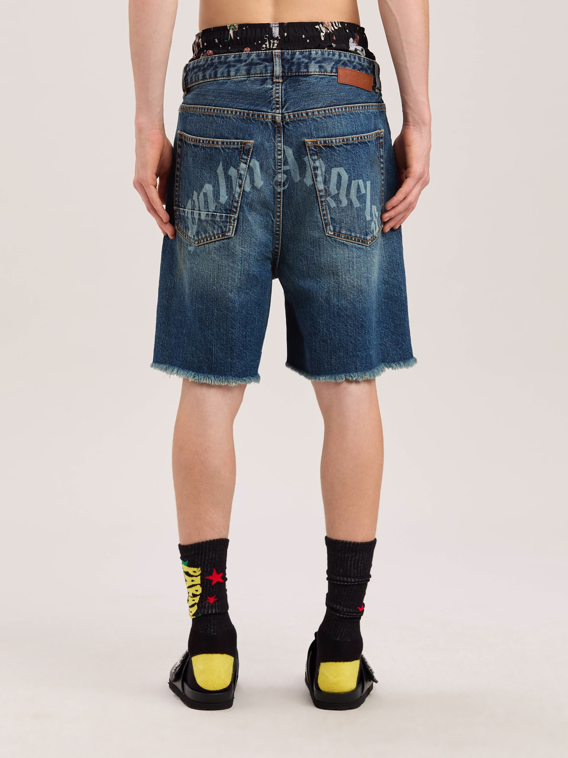 Experience the logo in an ever-changing finish. Men’s blue denim shorts with light blue lasered Curved logo on back.