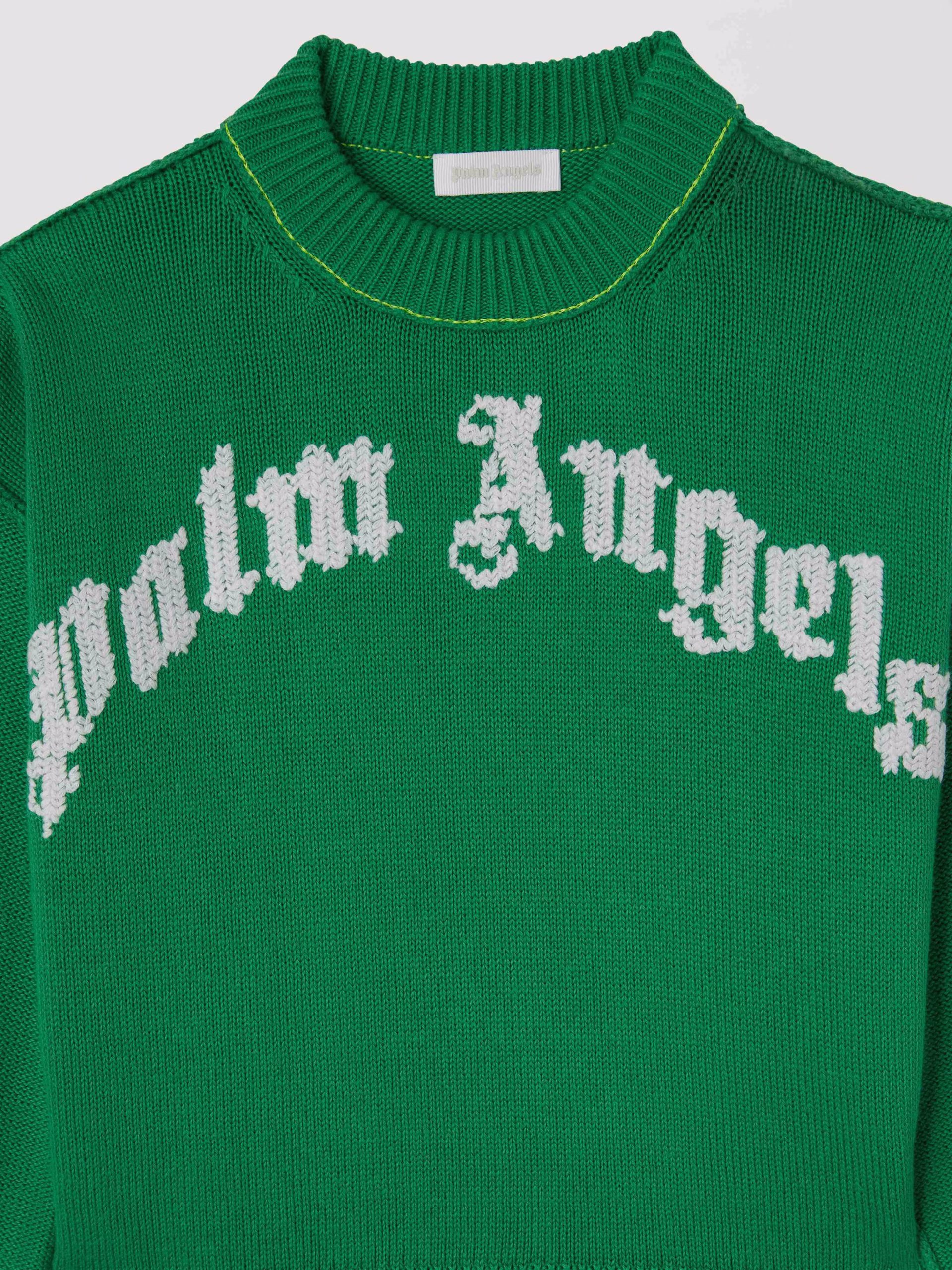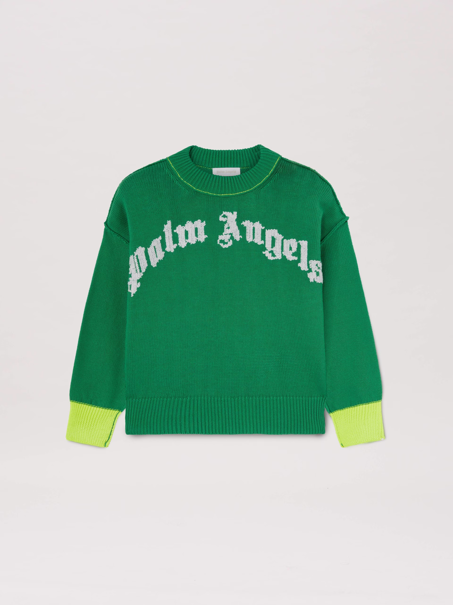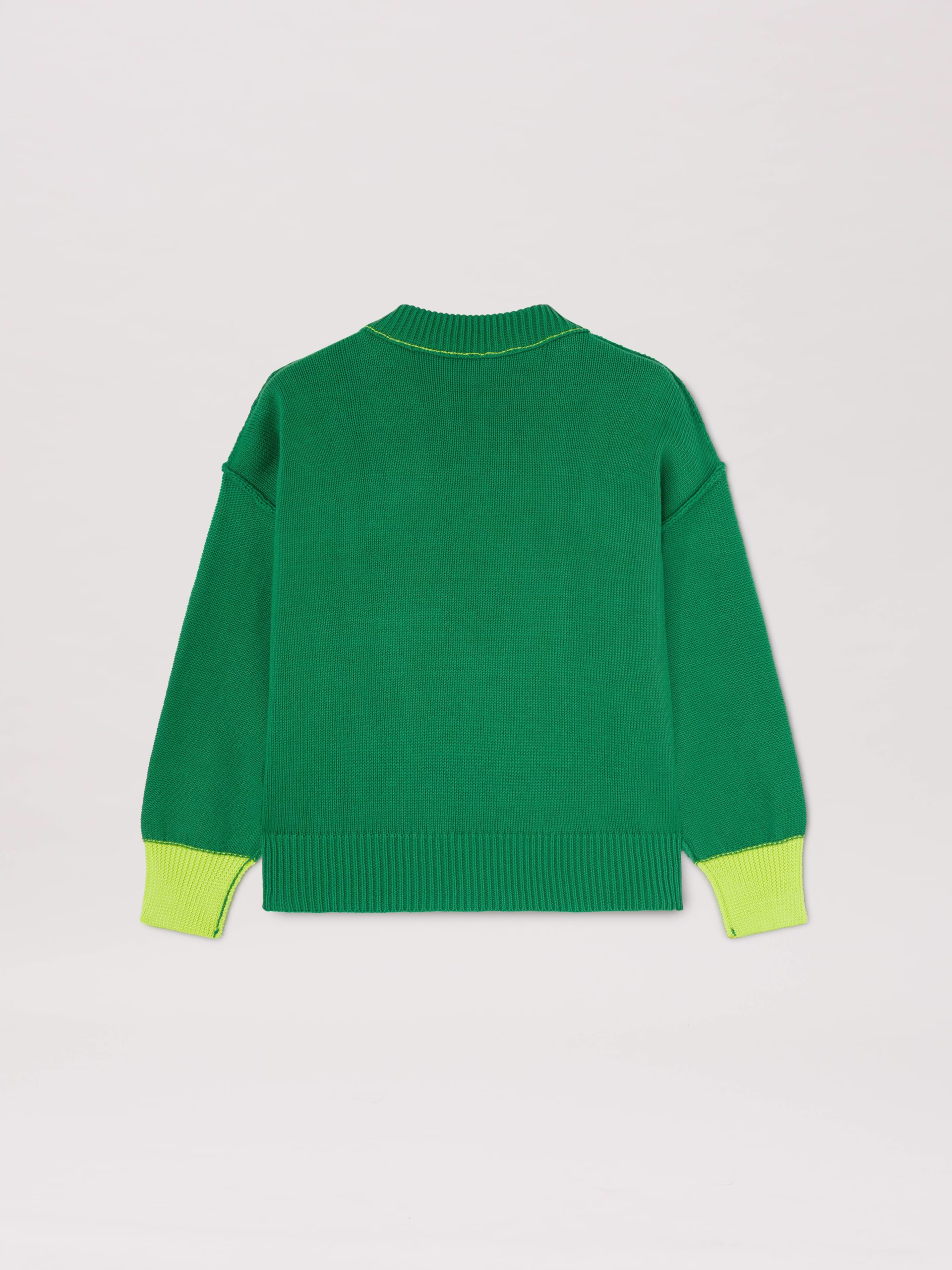 Bold and comfortable with a handmade touch. Boy’s green crewneck sweater with neon green ribbed cuffs and Curved logo embroidered