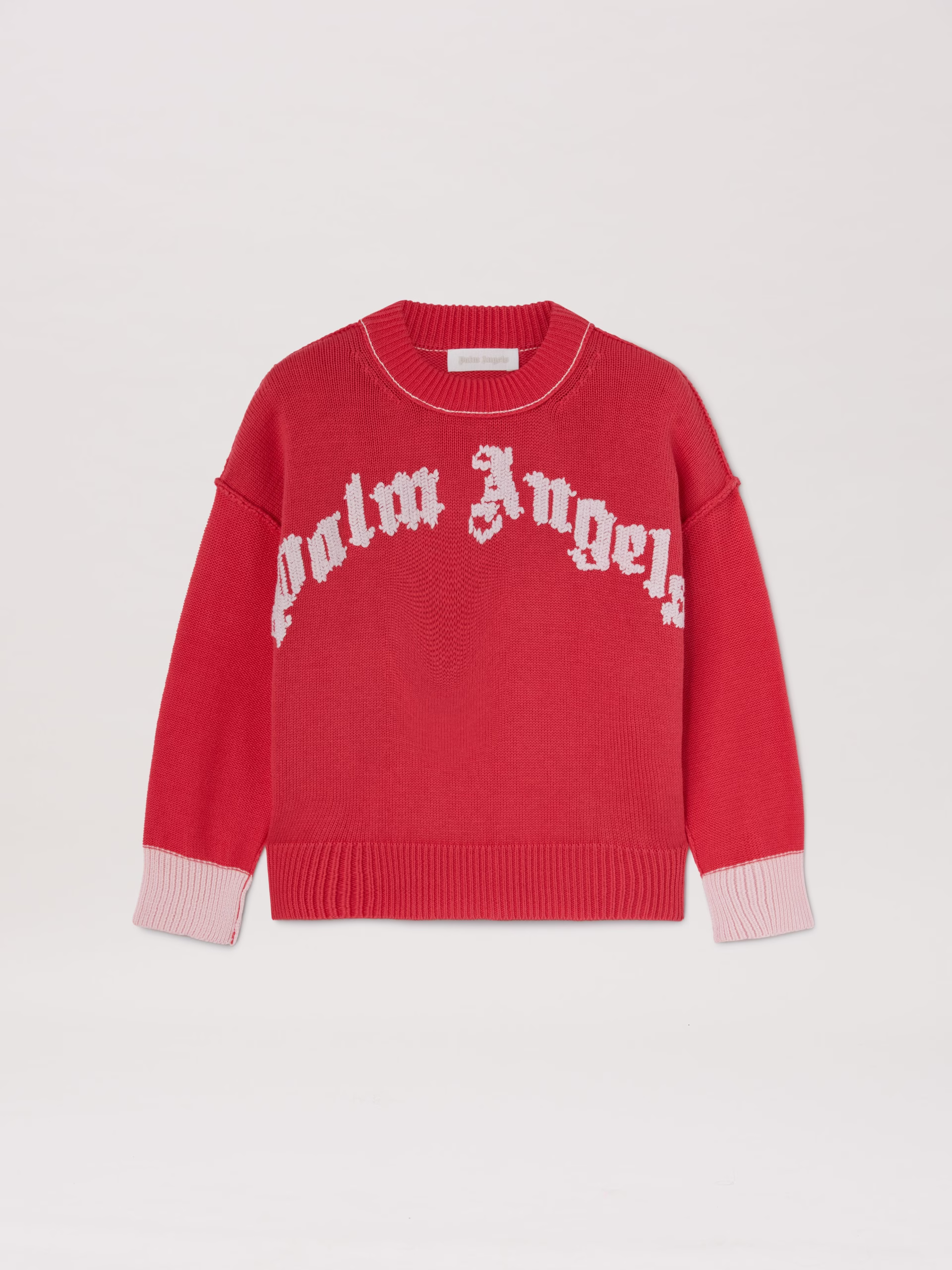 Bold and comfortable with a handmade touch. Girl’s cherry red crewneck sweater with ribbed cuffs and Curved logo embroidered in wh