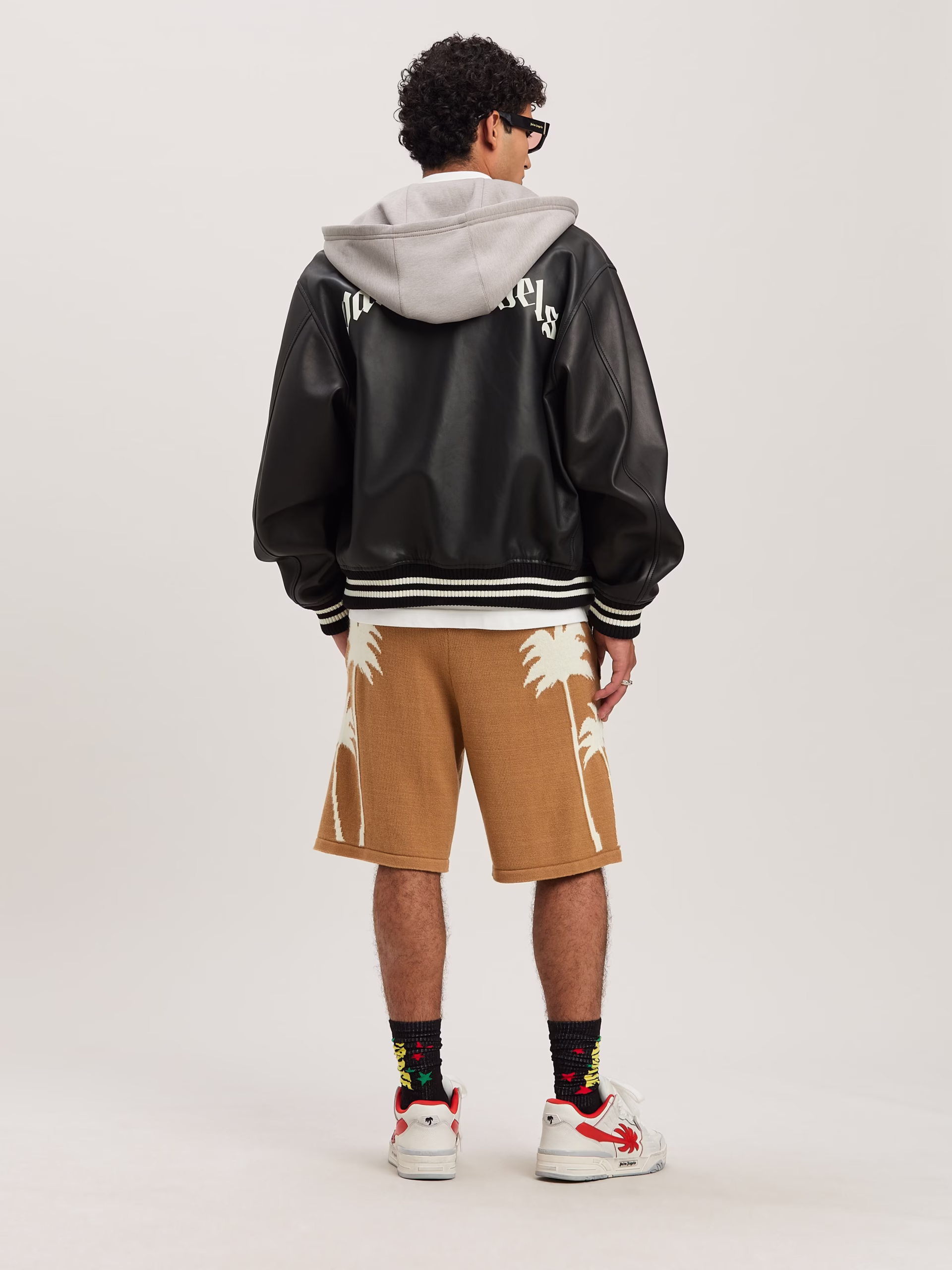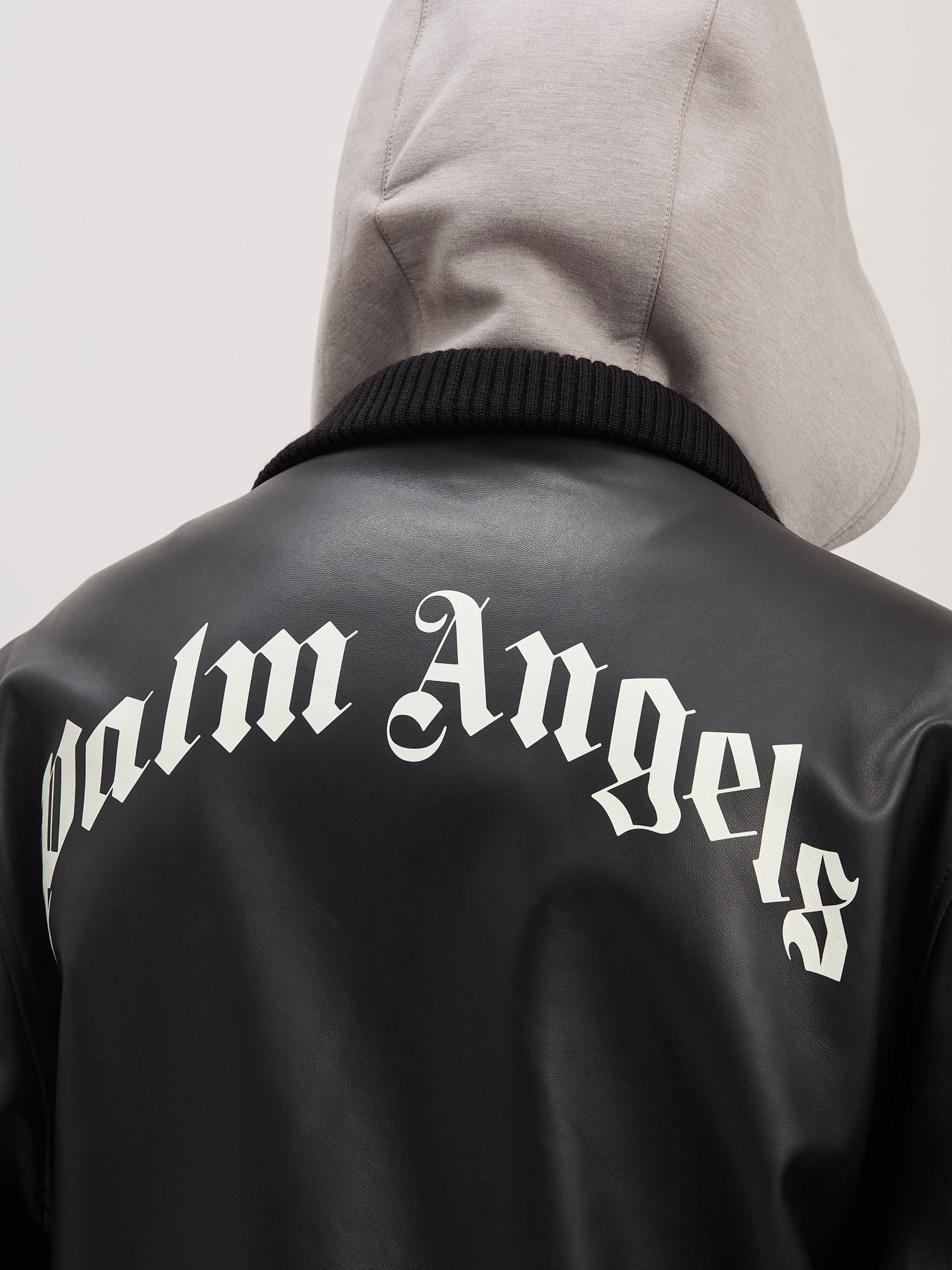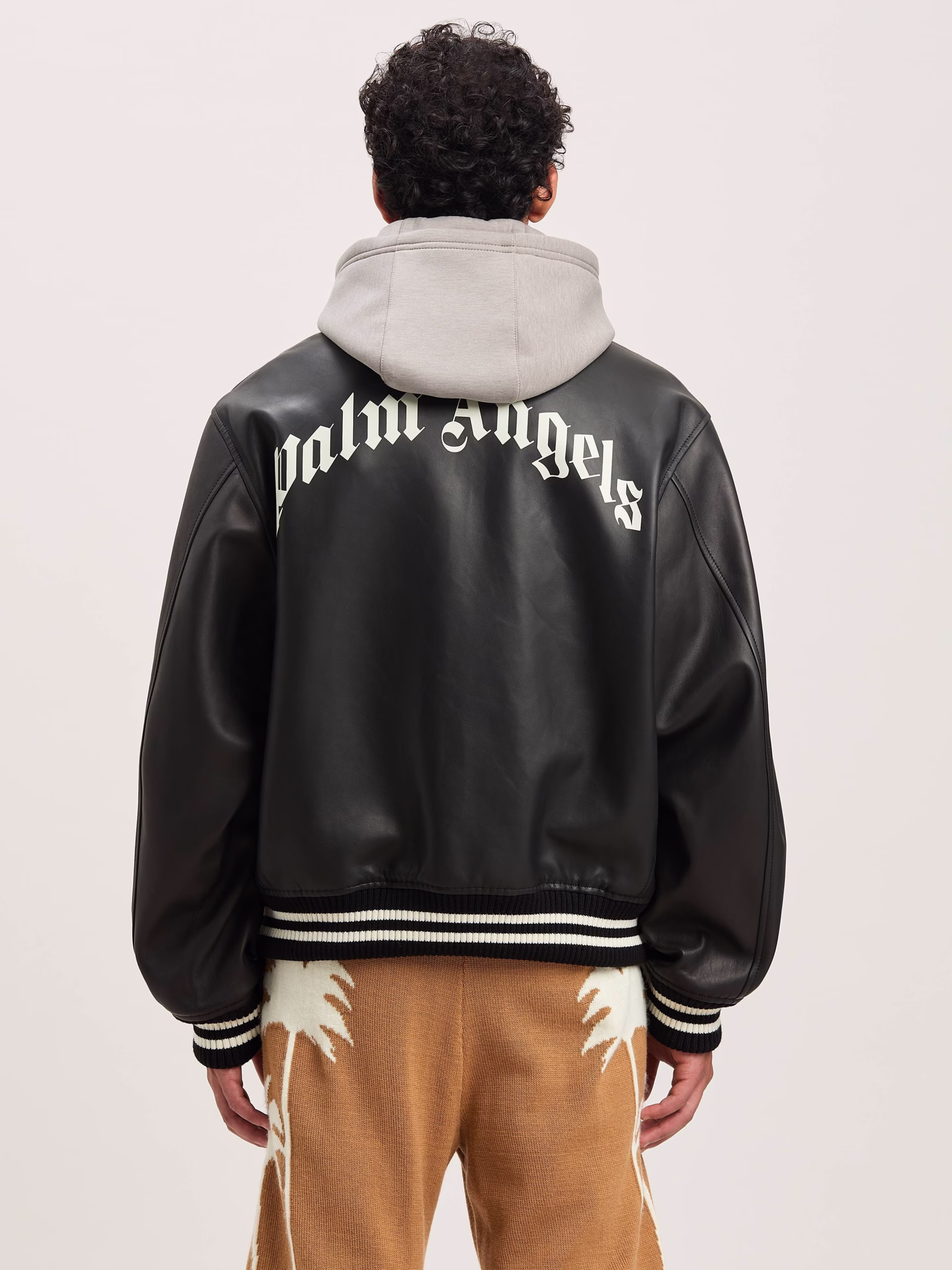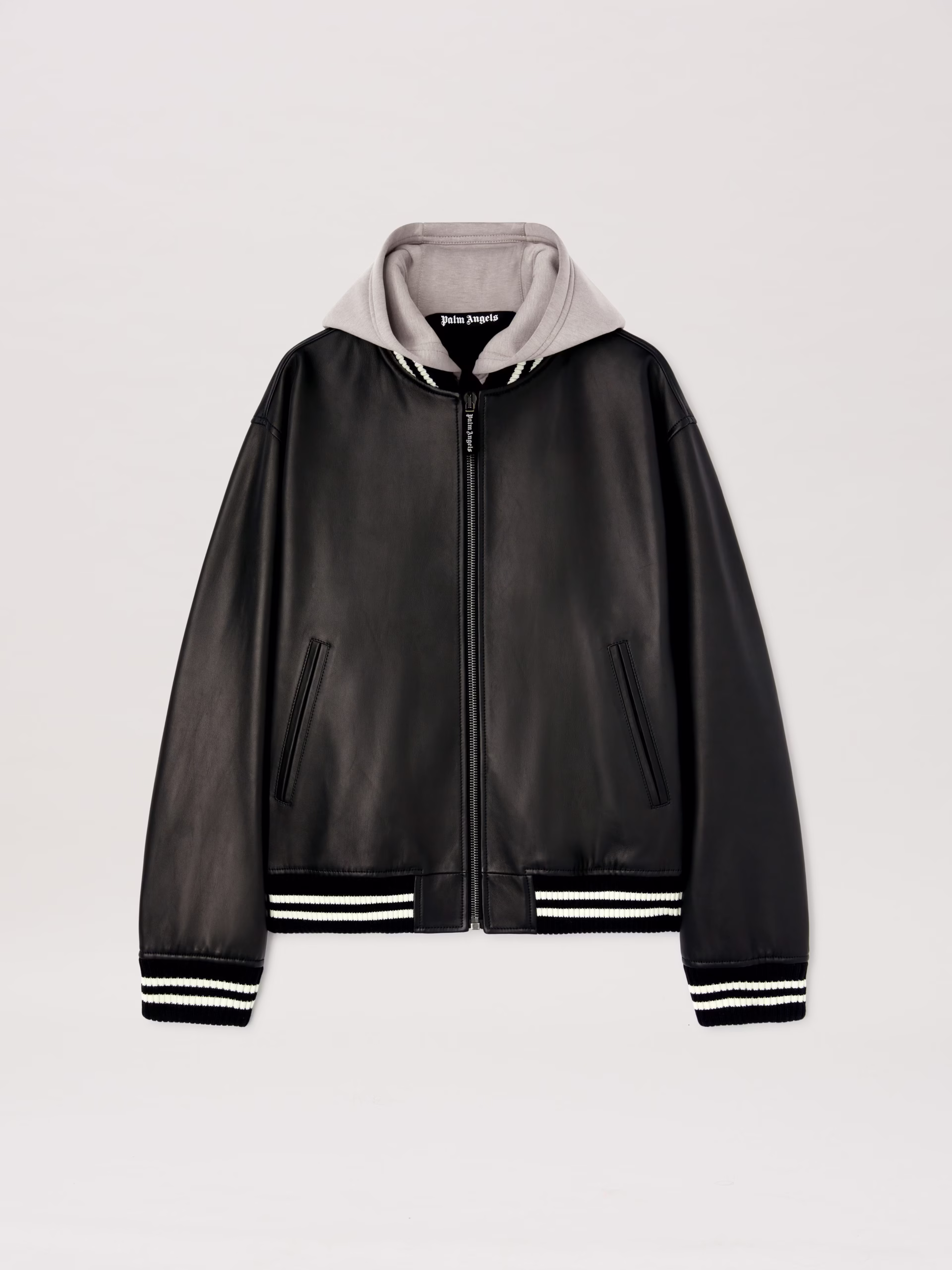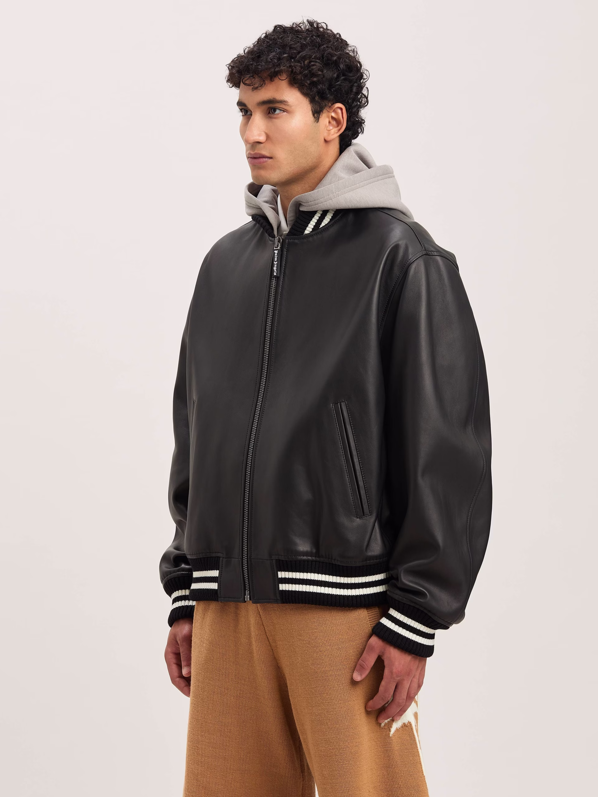 Utility blends with style and the icons of Palm Angels. Men’s black leather bomber with ribbed and striped details, over fit and l