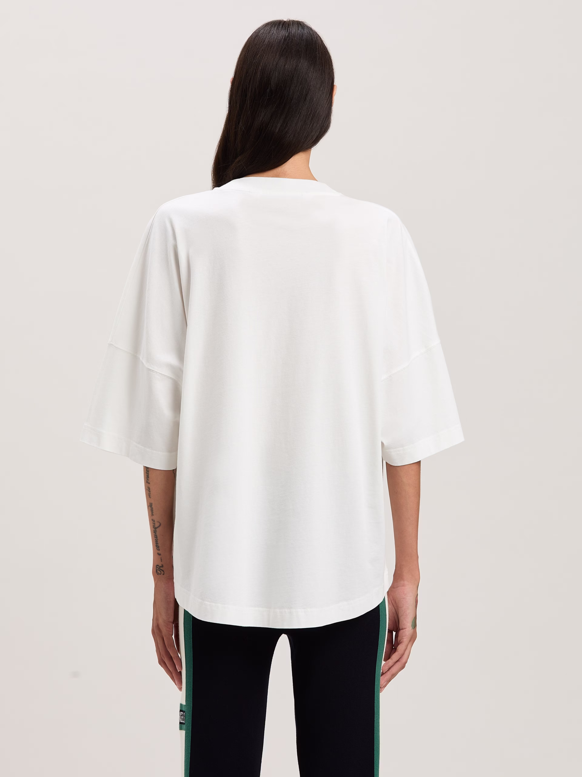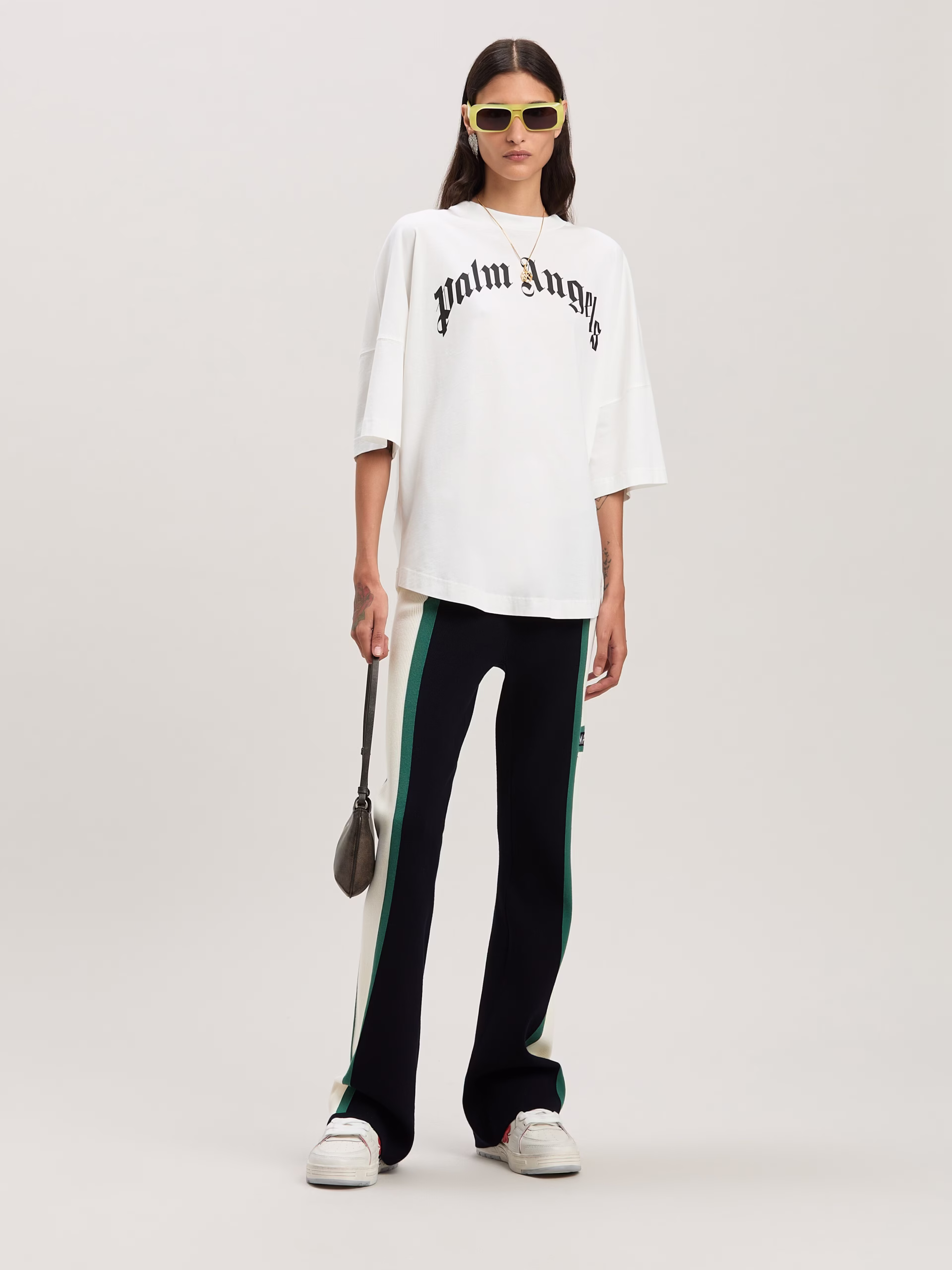 Logo mutations becoming a new graphic element for the season. Women’s white over-fit T-shirt with big Curved logo printed in blac