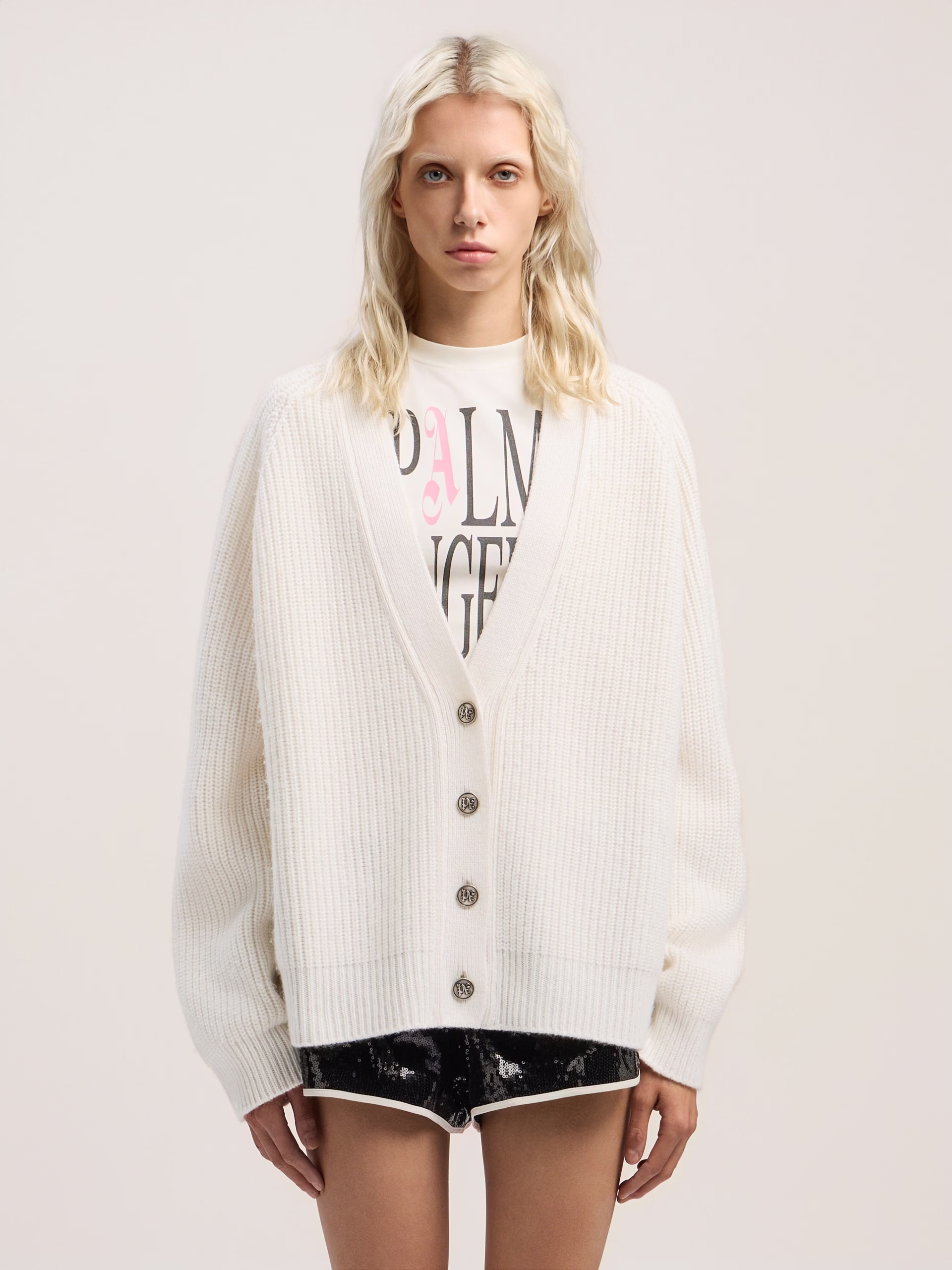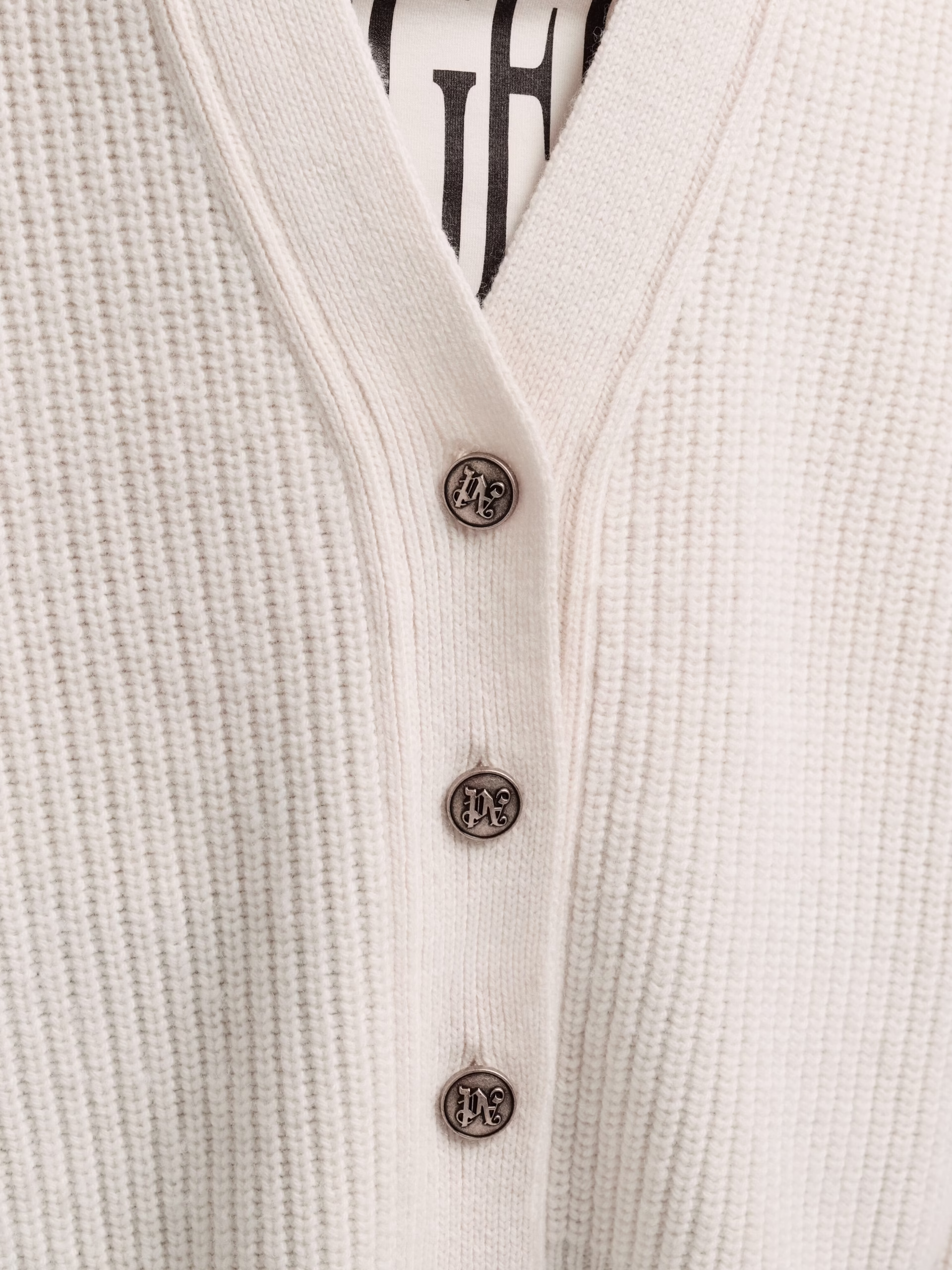 Ribbed knit cardigan featuring a curved logo detail, offering a seamless blend of streetwise flair and refined edge.