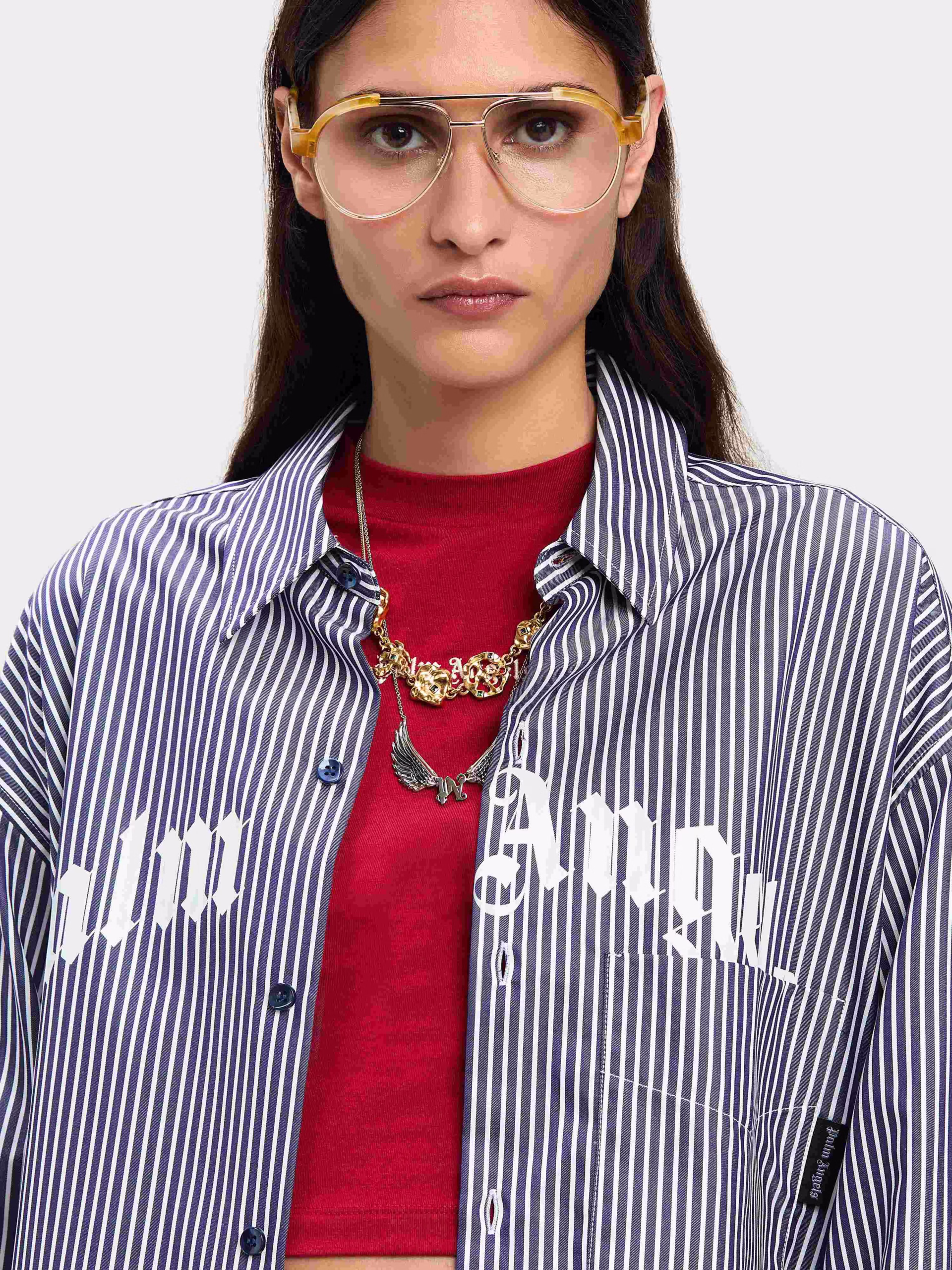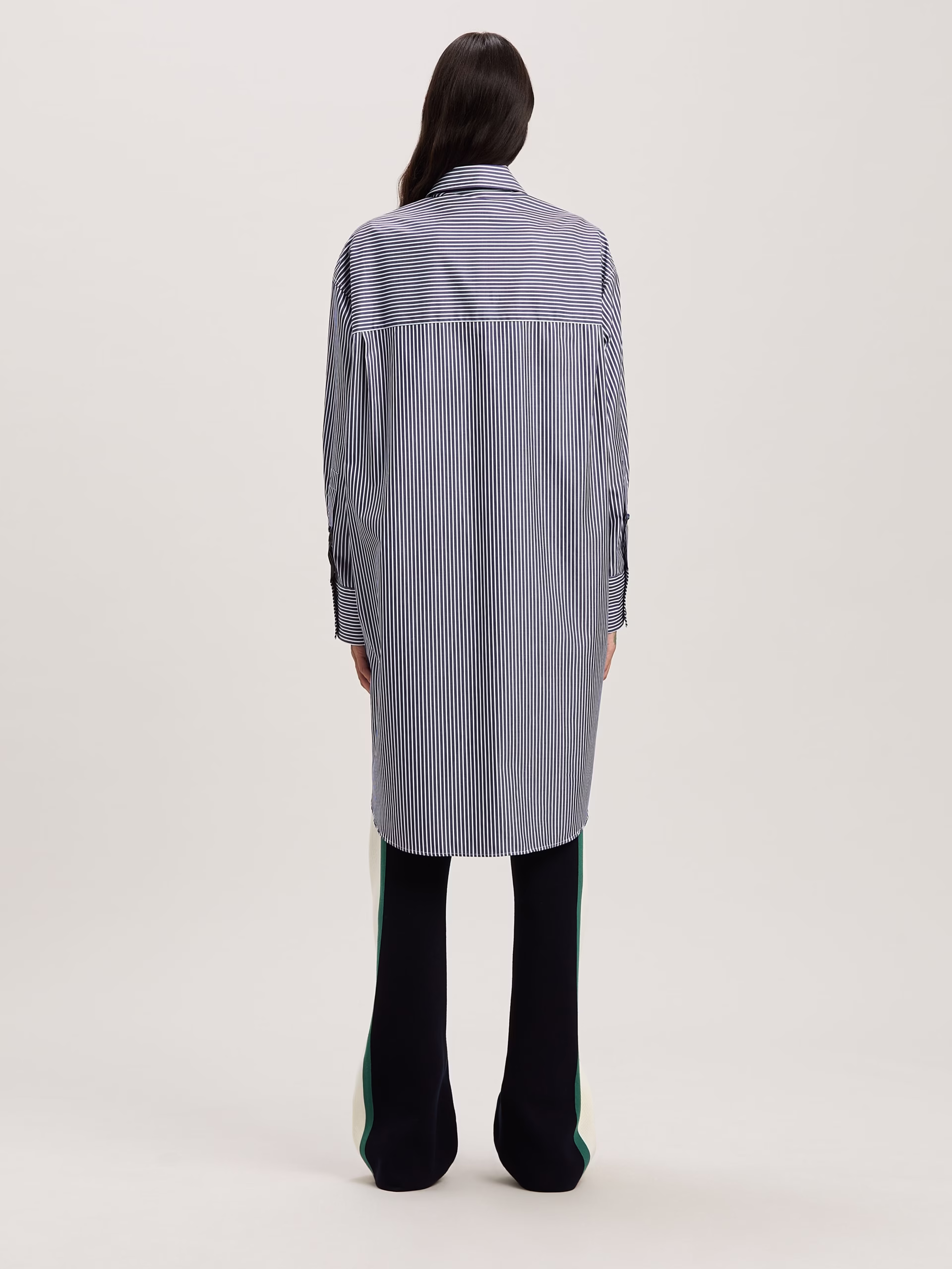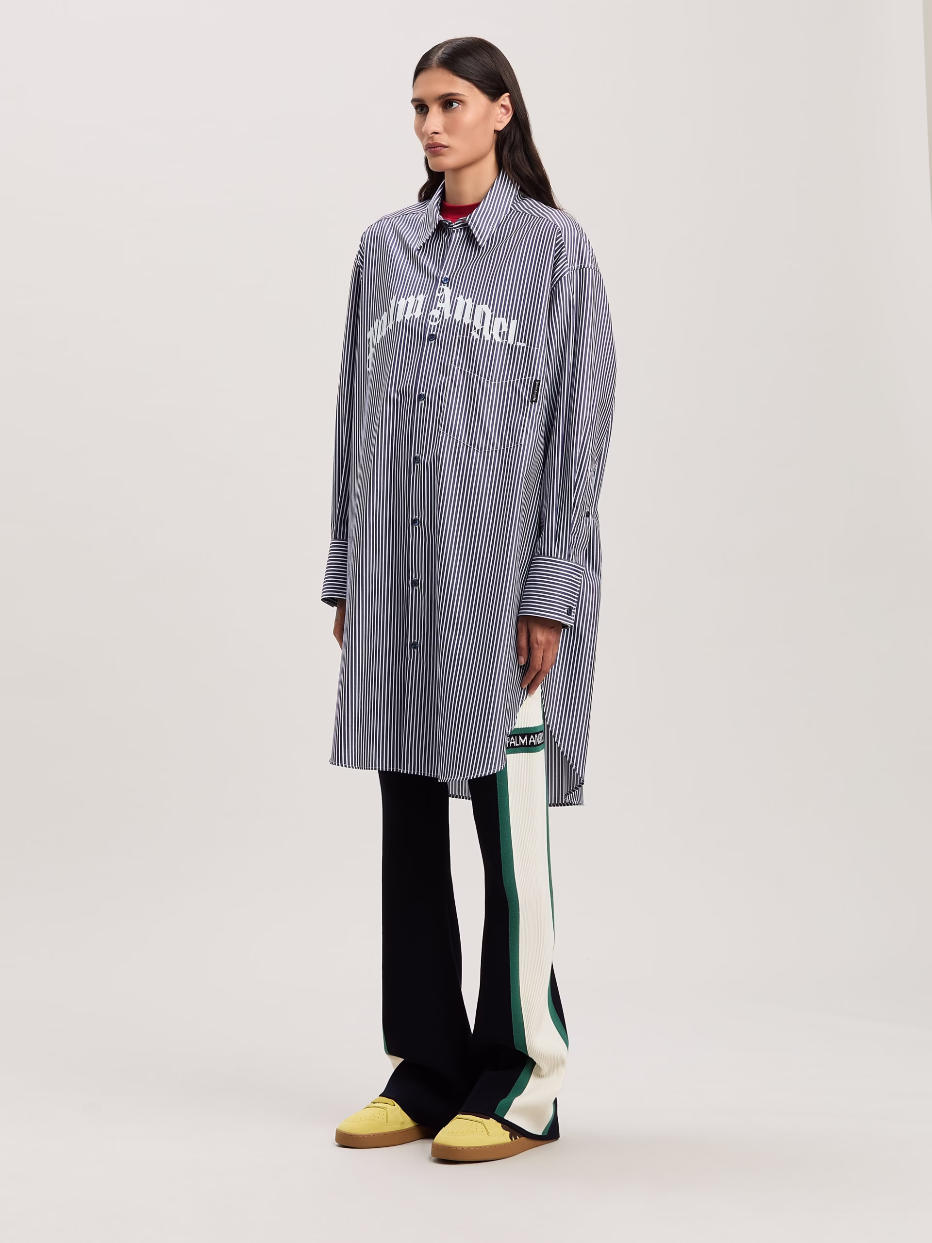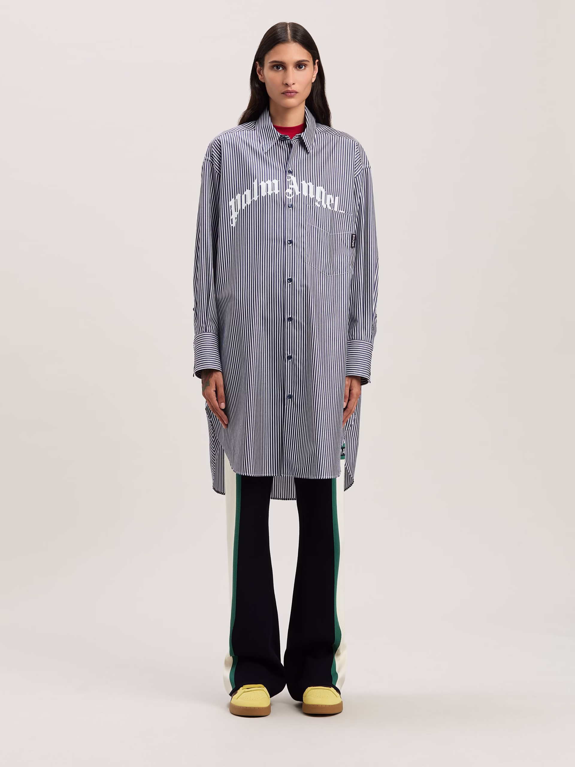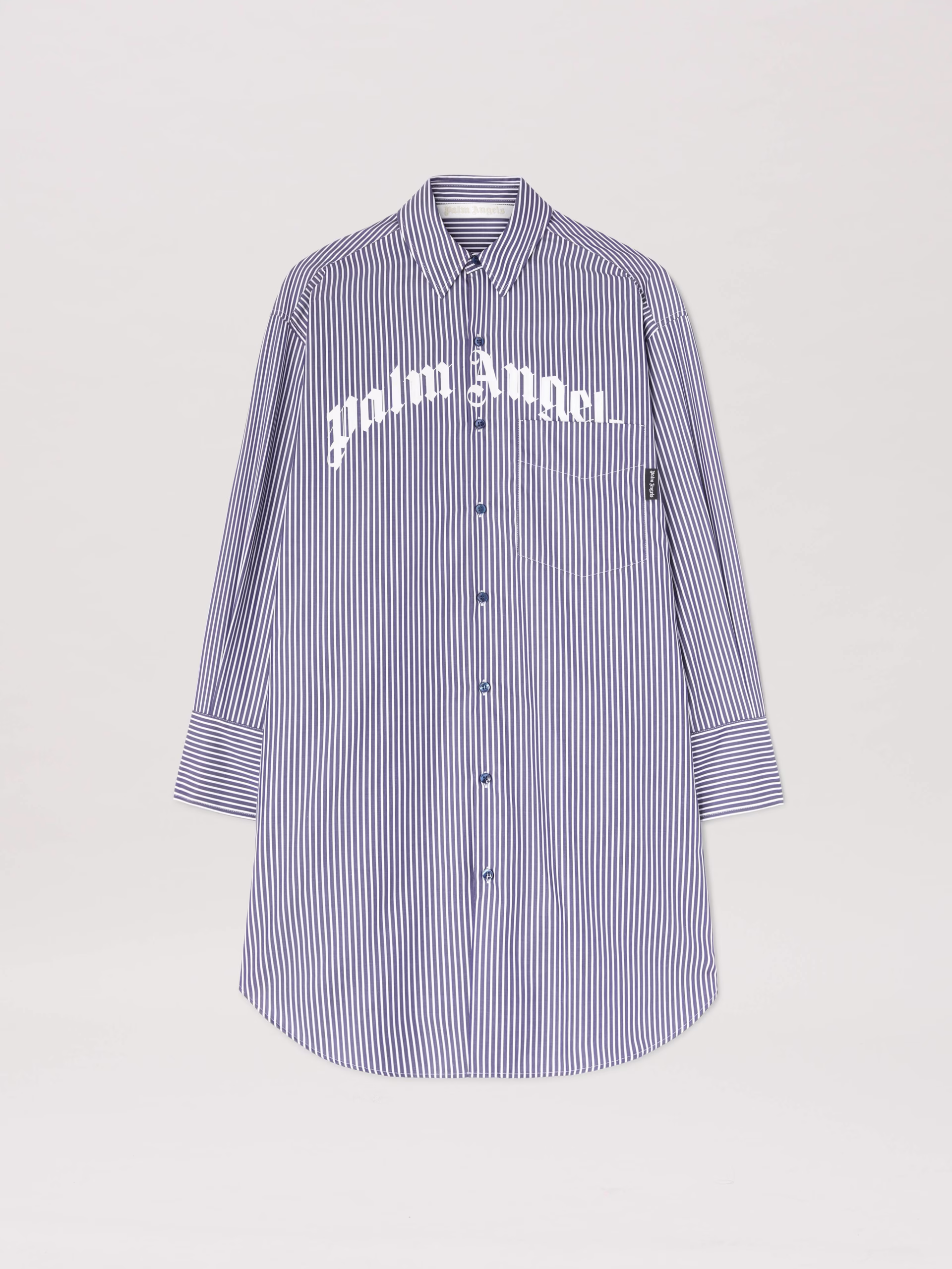 A summer favorite with a sartorial flavor. Women’s blue and white striped shirtdress with button on the front and black Curved log