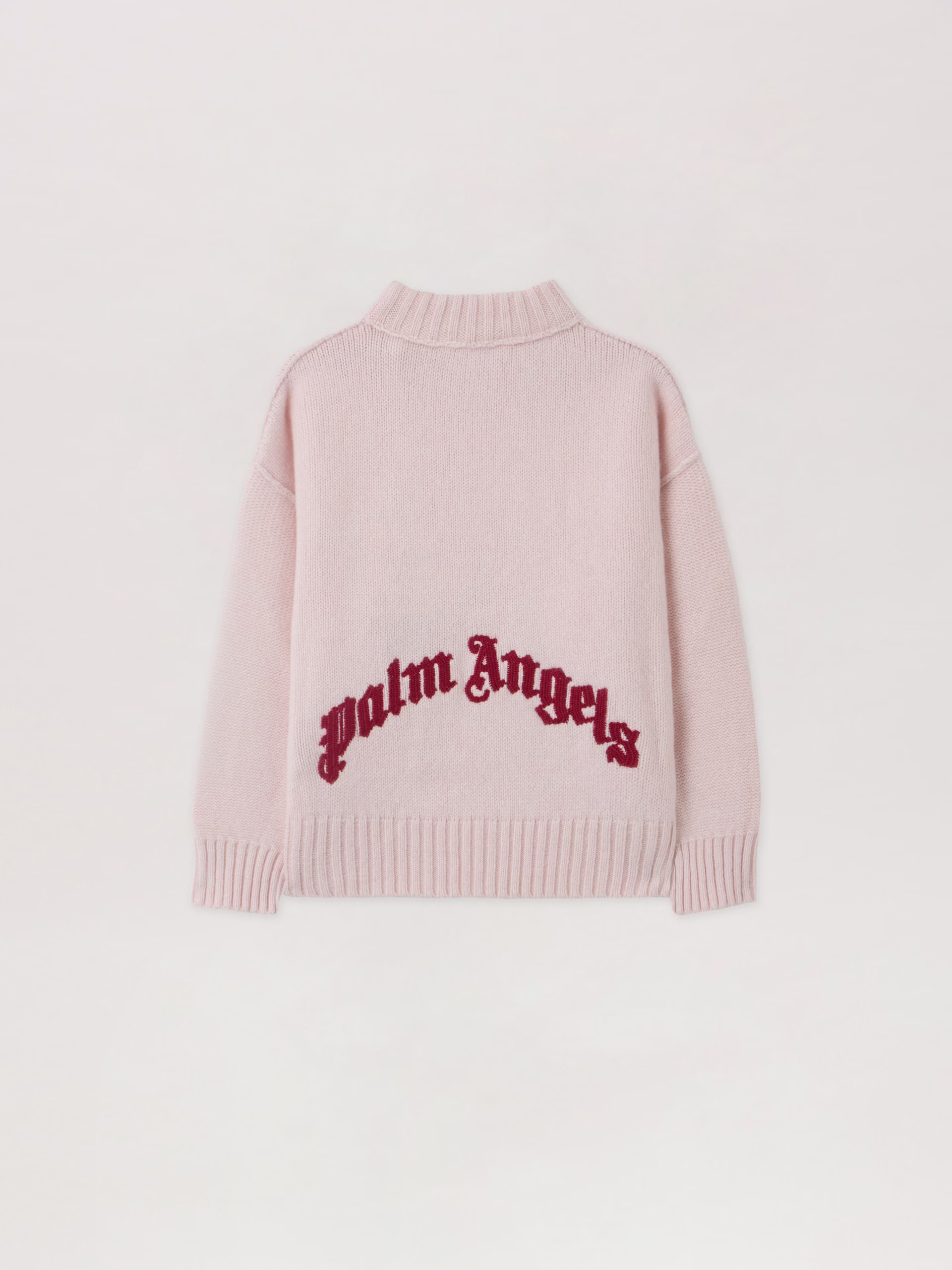 This relaxed knit crewneck features a bold curved logo, merging streetwear aesthetics with refined comfort.