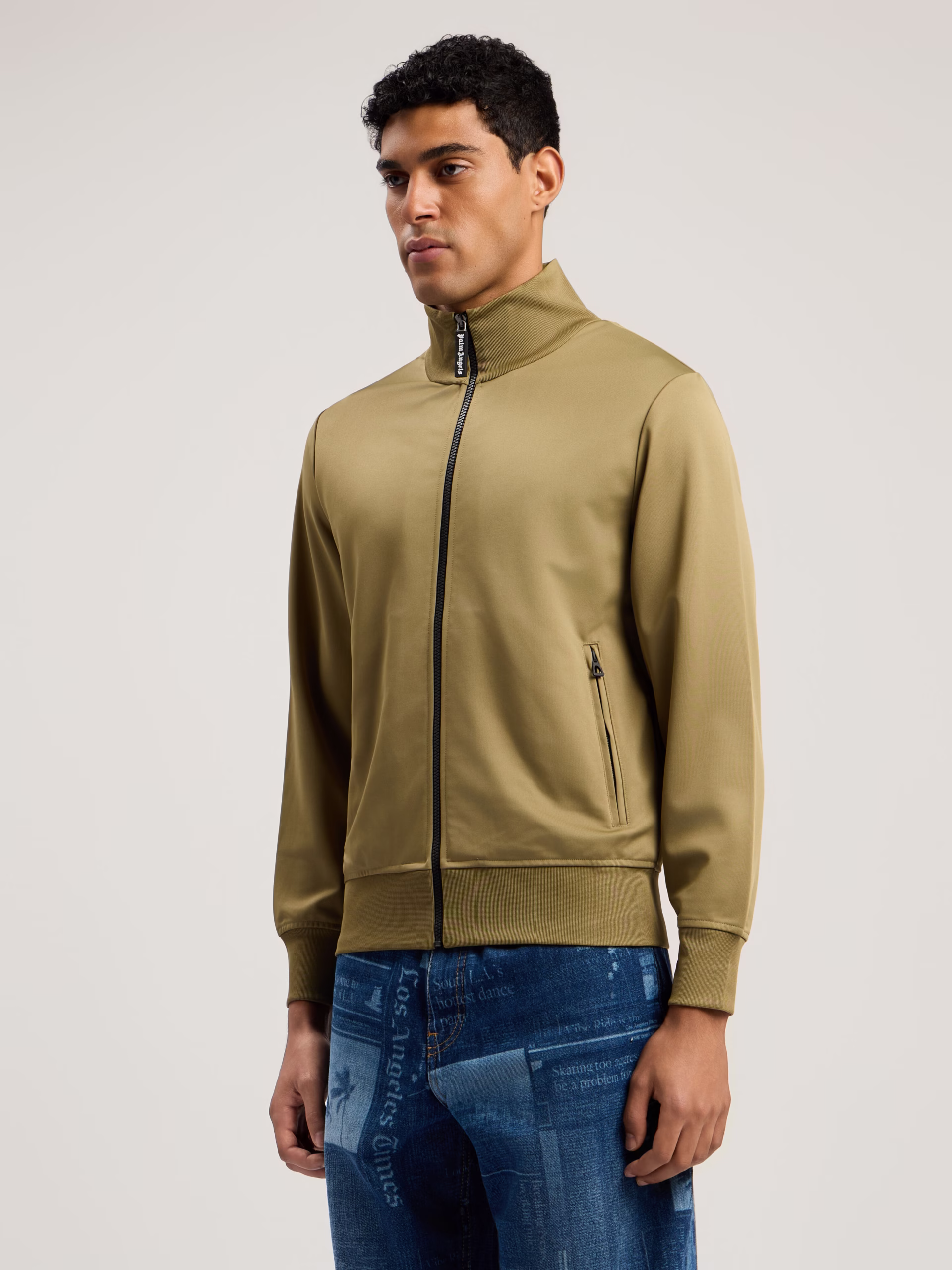 Track jacket featuring a structured design with a stand collar and a distinctive back curved logo.Sta