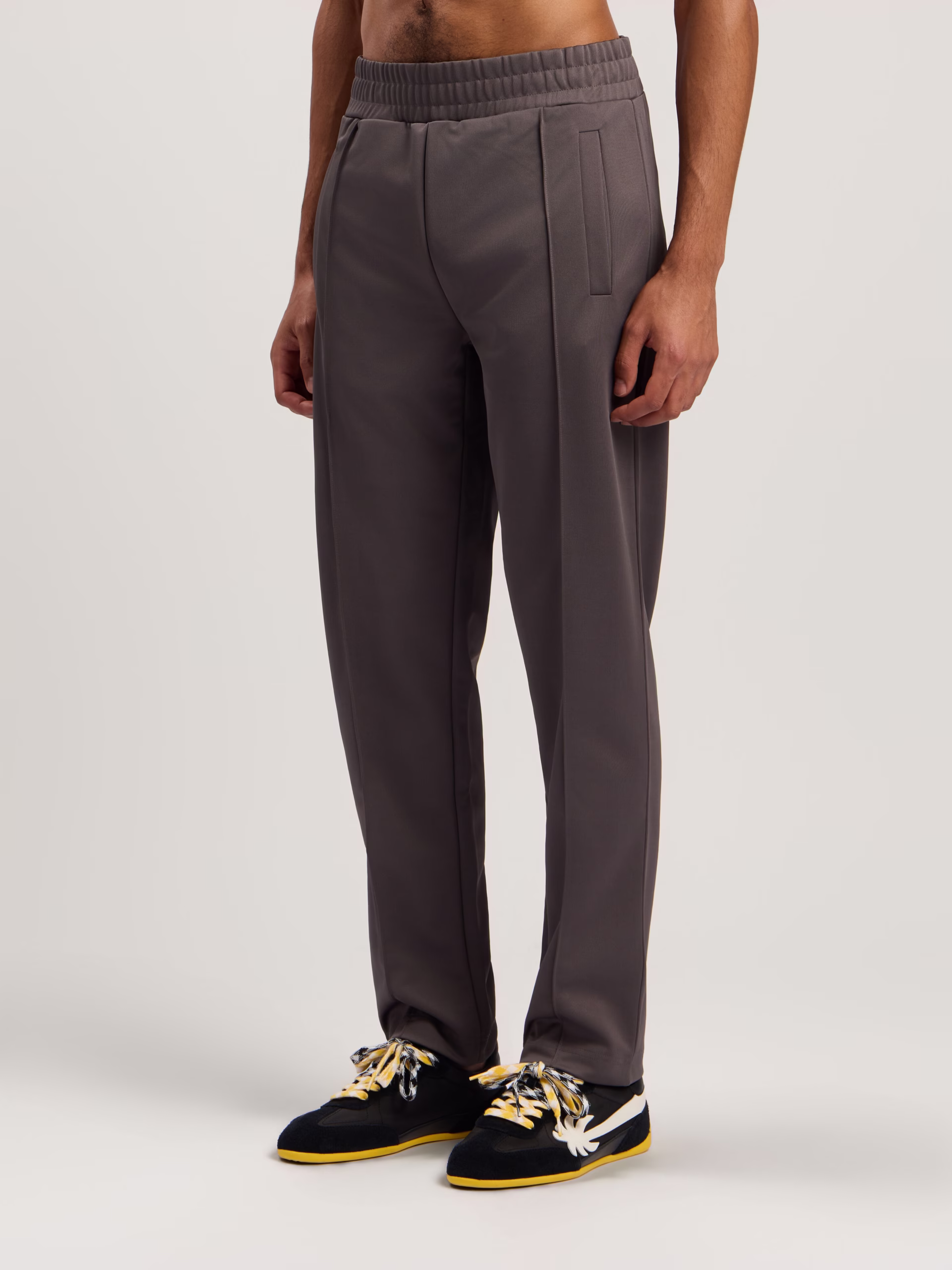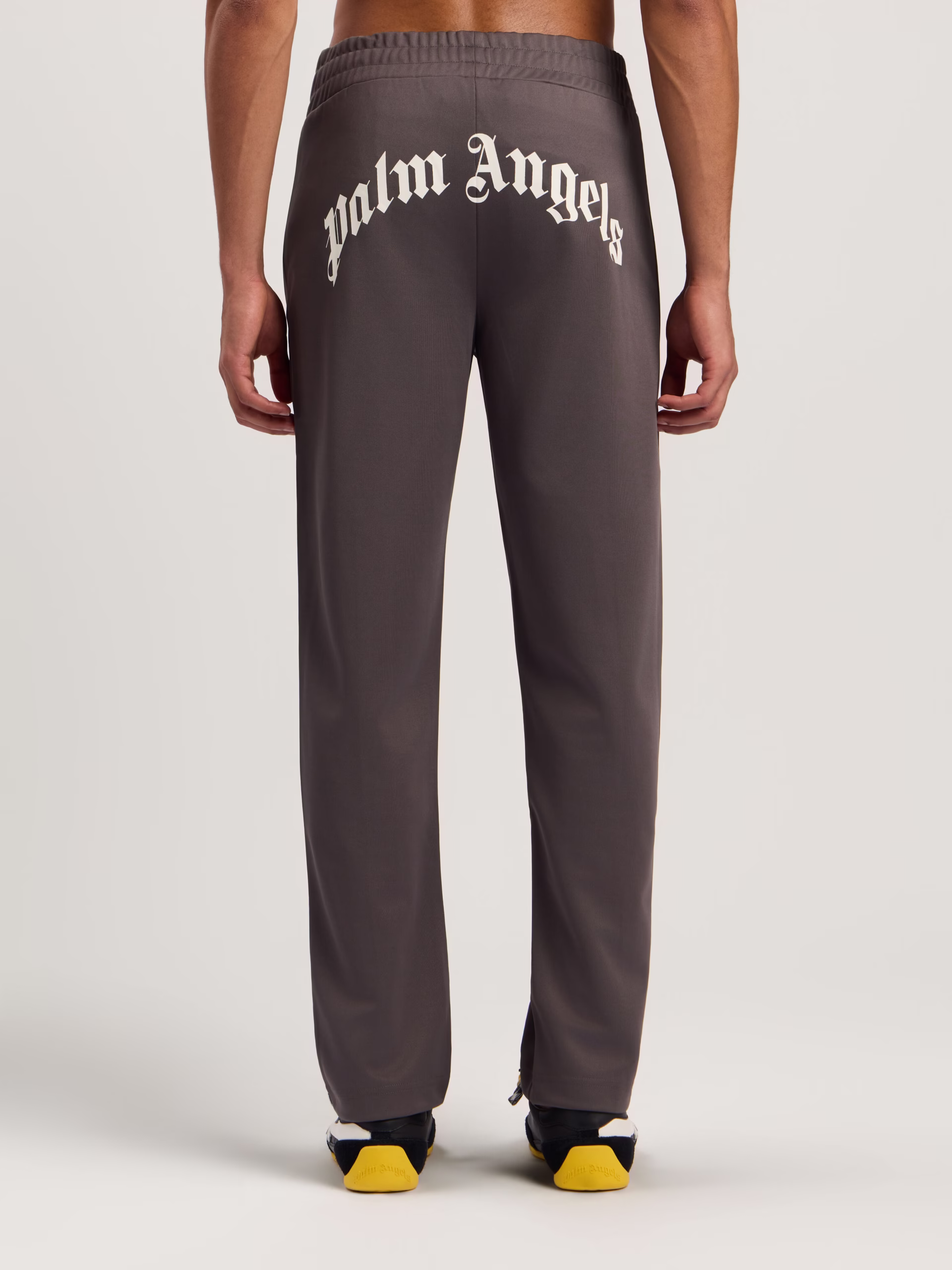 Track pants crafted from smooth fabric featuring a distinctive curved logo at the back.