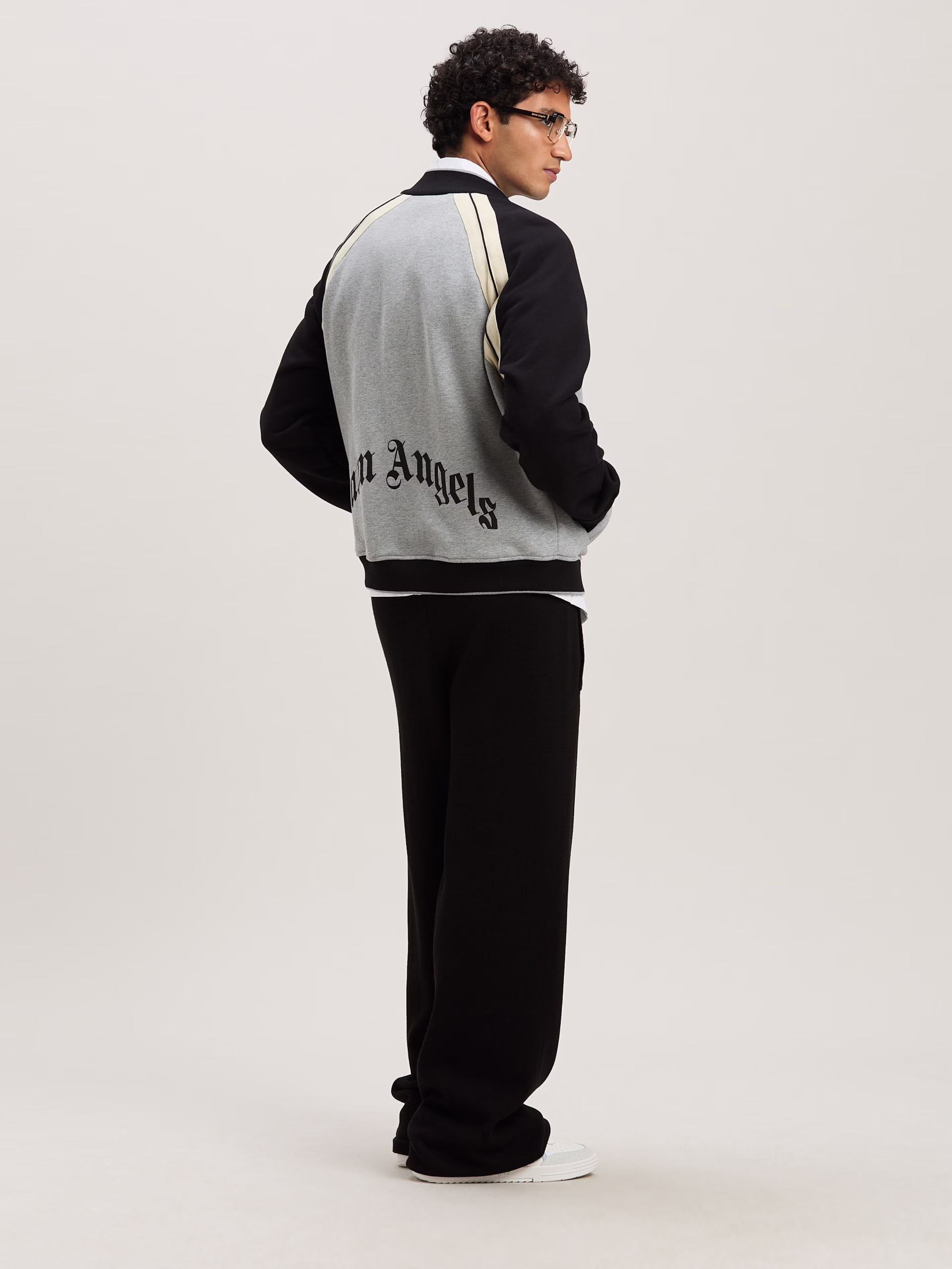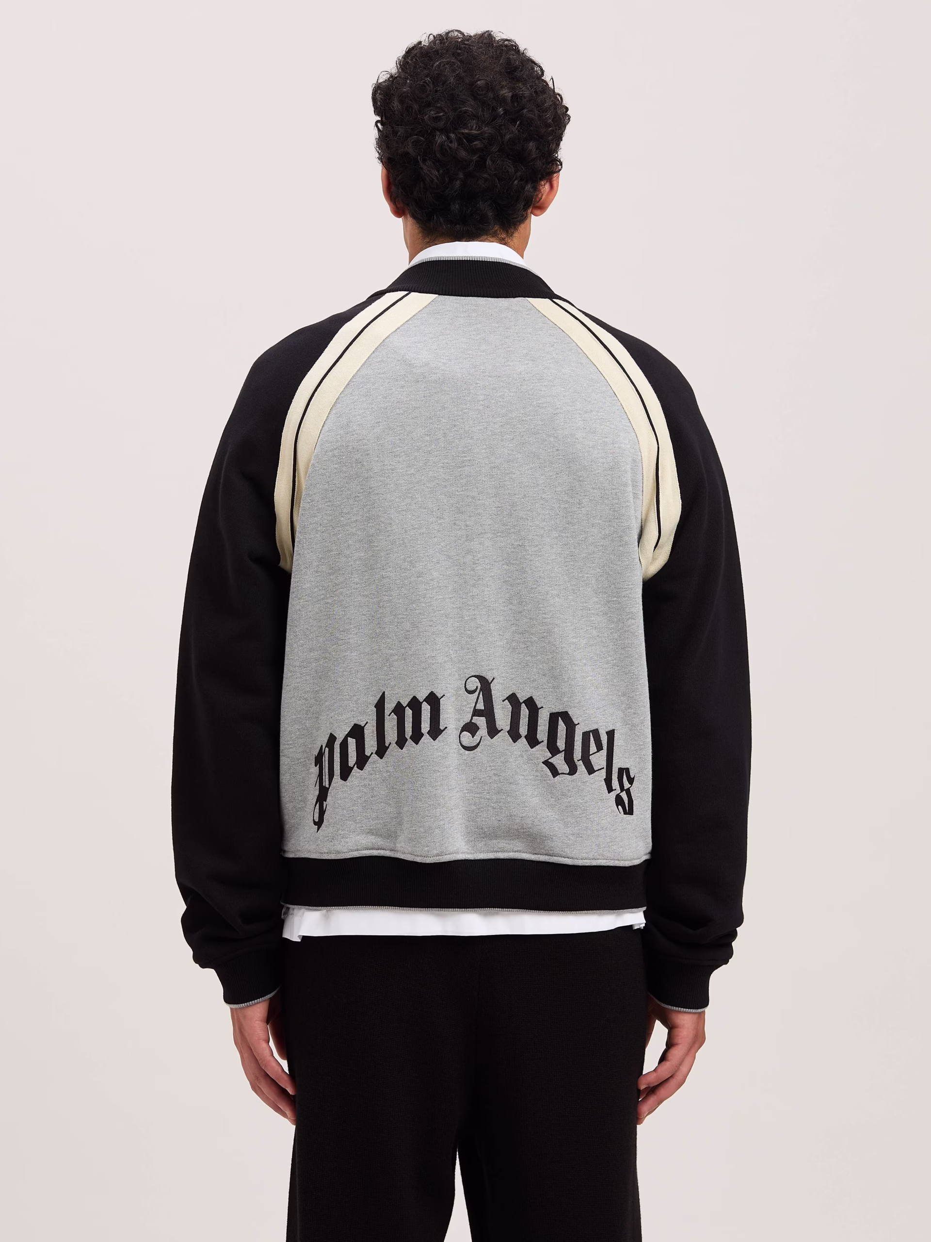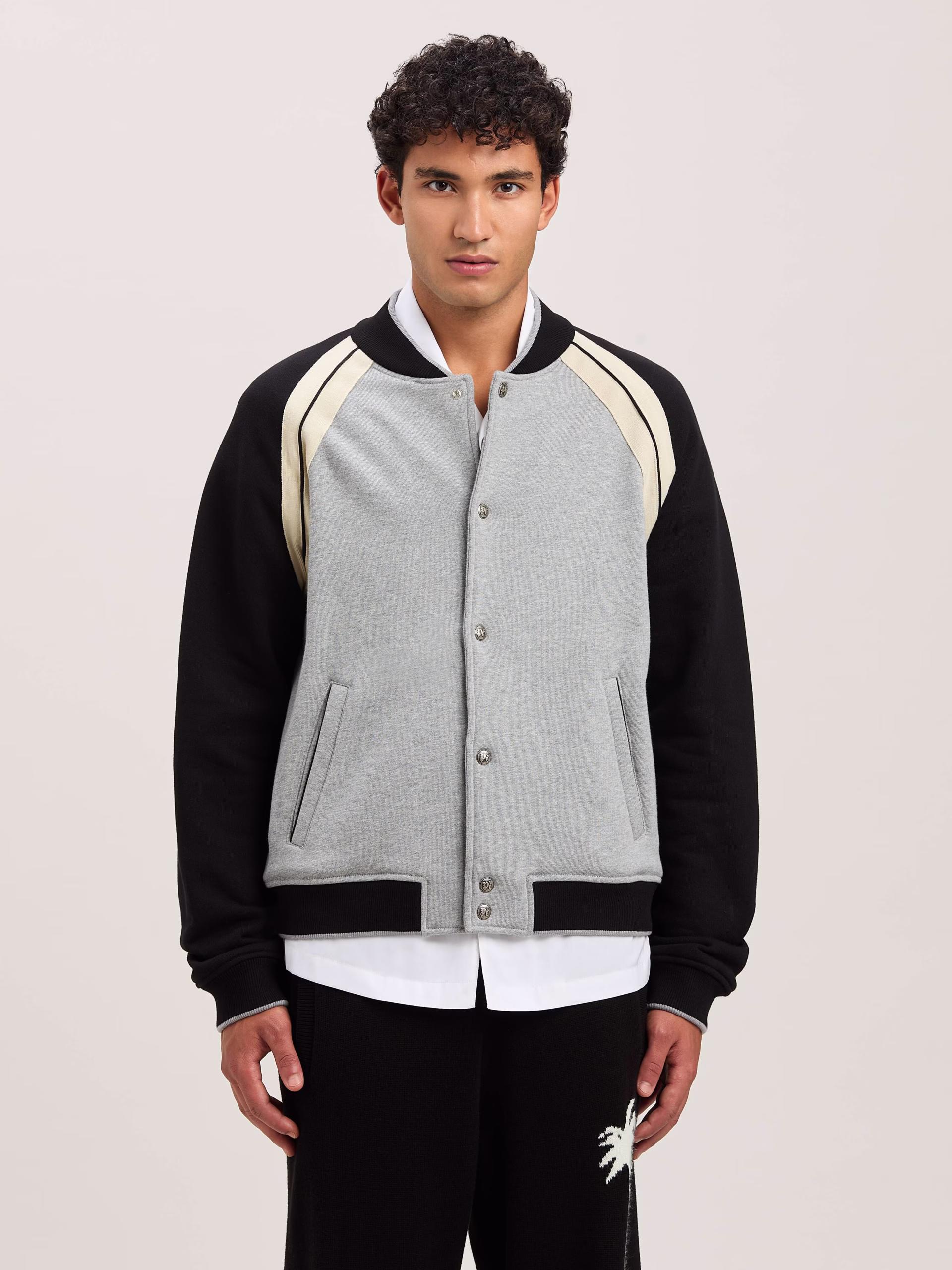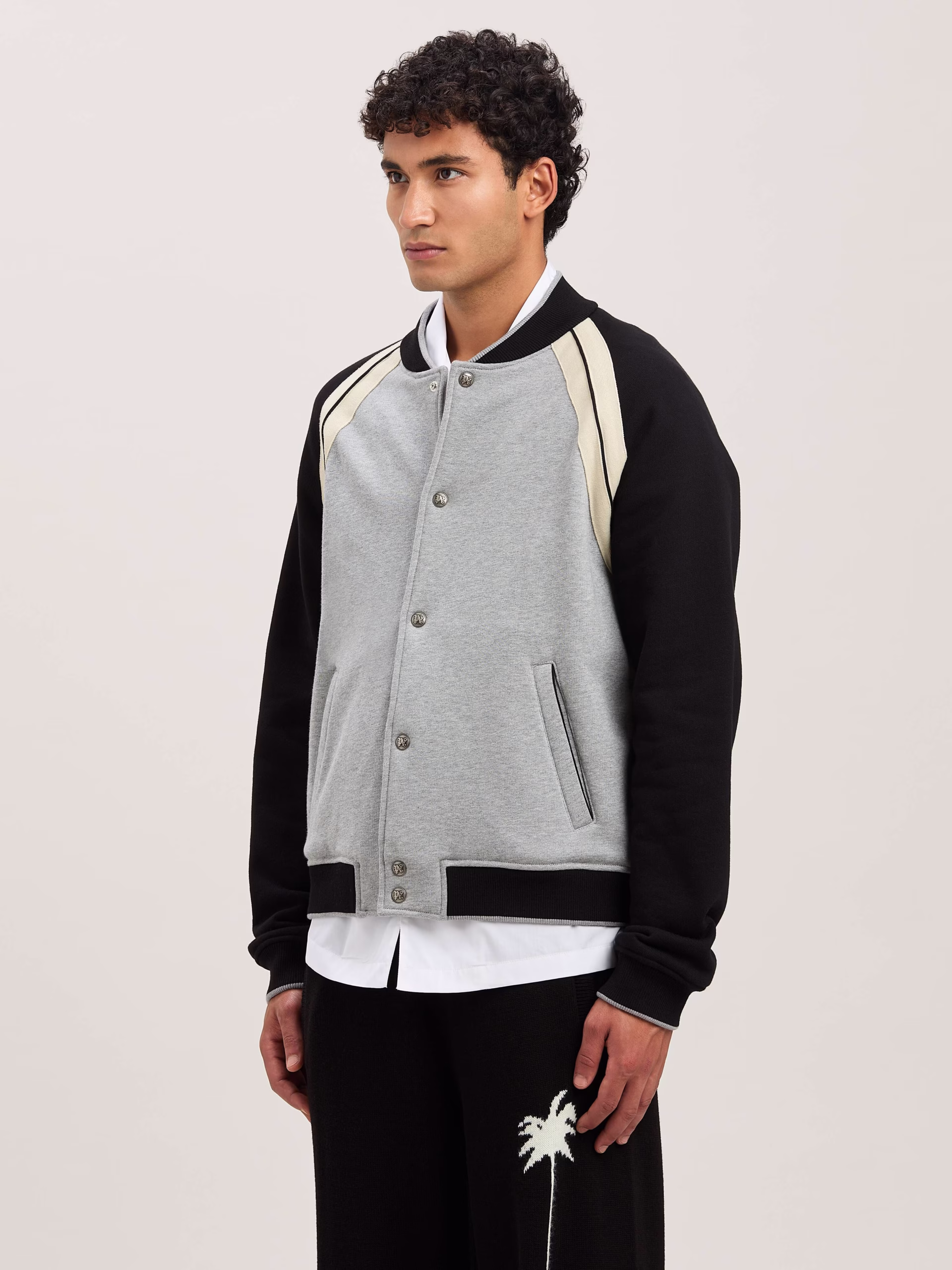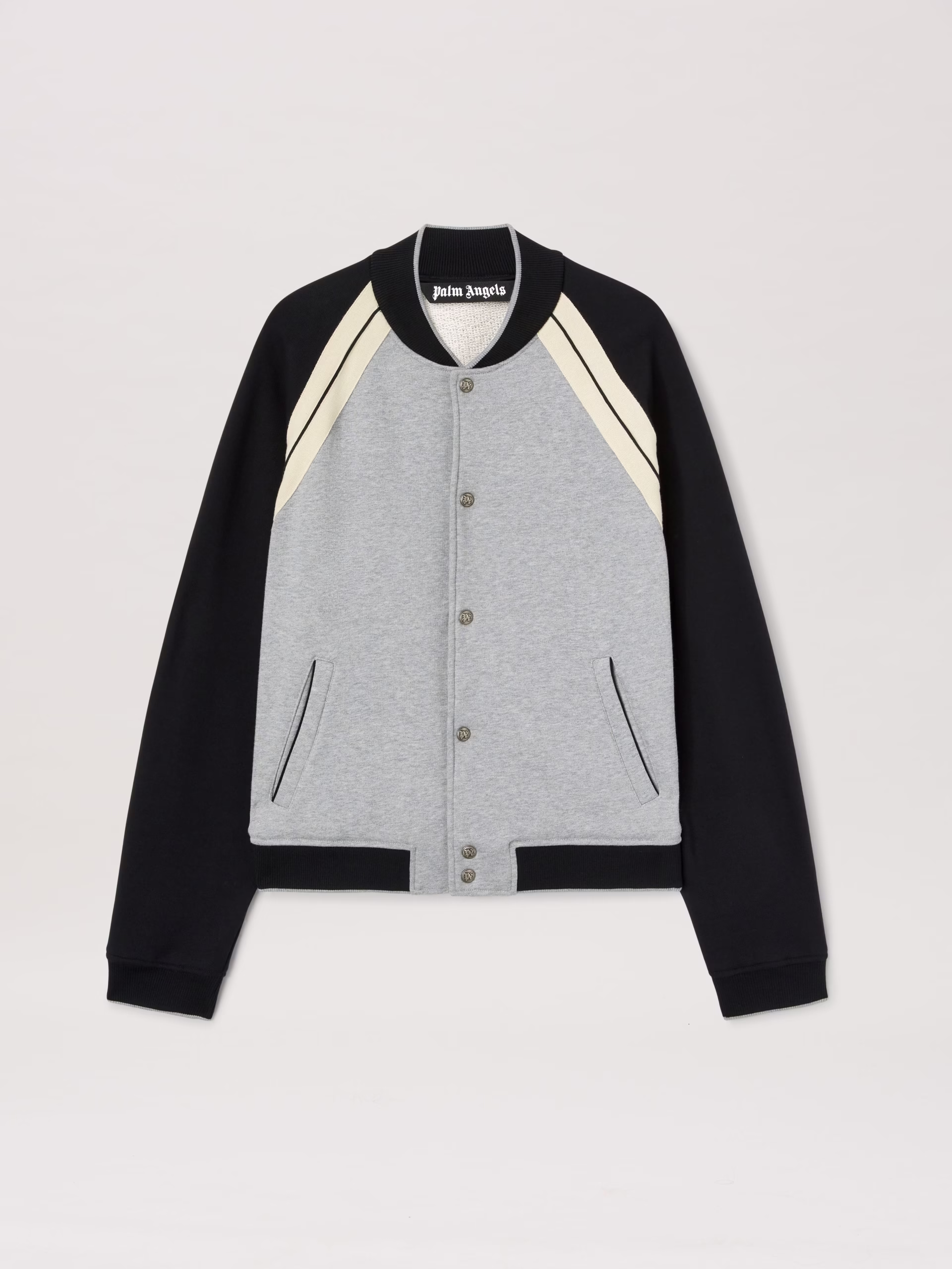 Utility blends with style and the icons of Palm Angels. Men’s Varsity jacket in grey and black, with button closure, iconic Tape i
