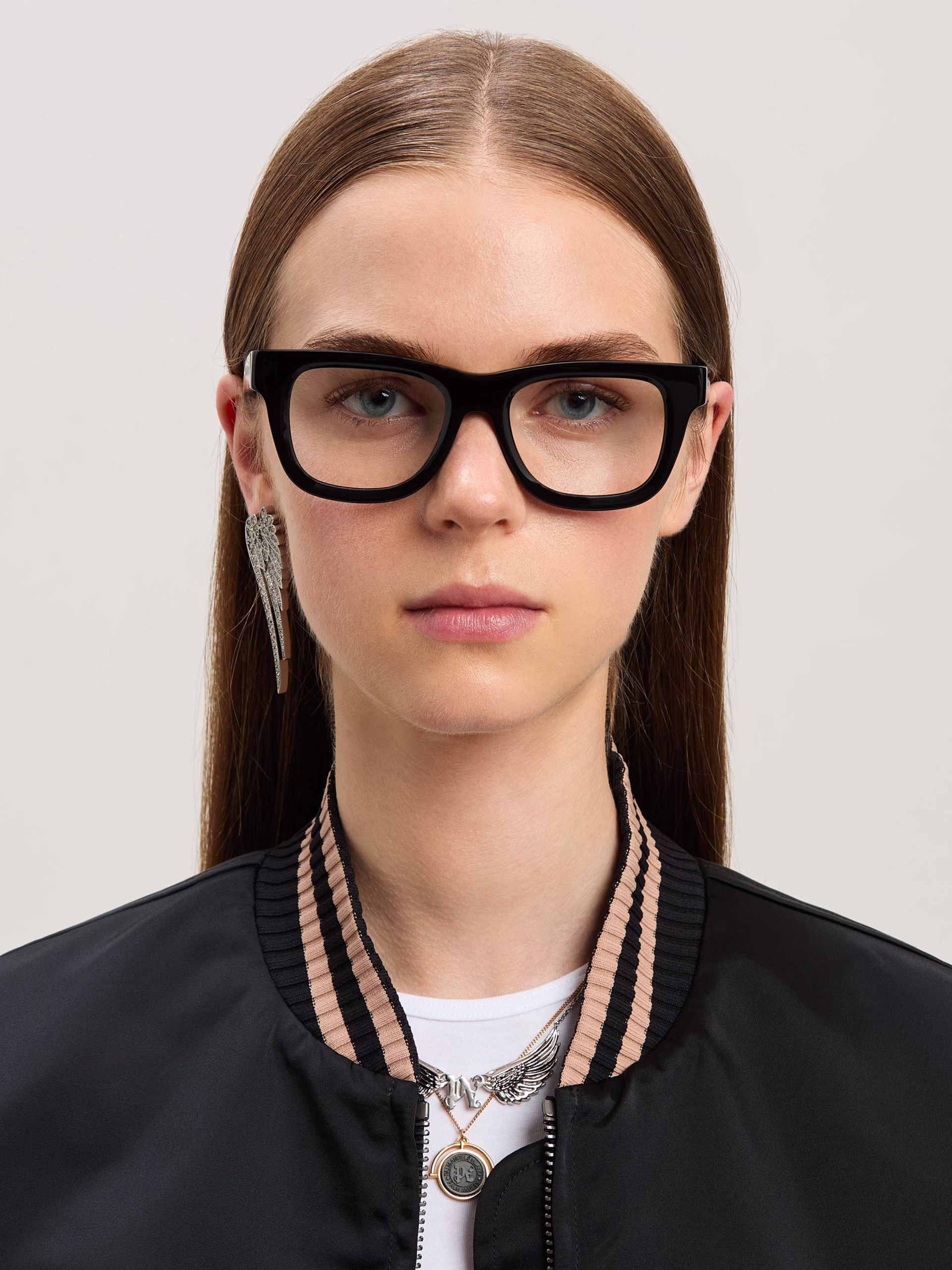 Solid elegance with geometric lines and tapered outer corners. Trapezoidal black acetate frame with elongated upper corners, thin