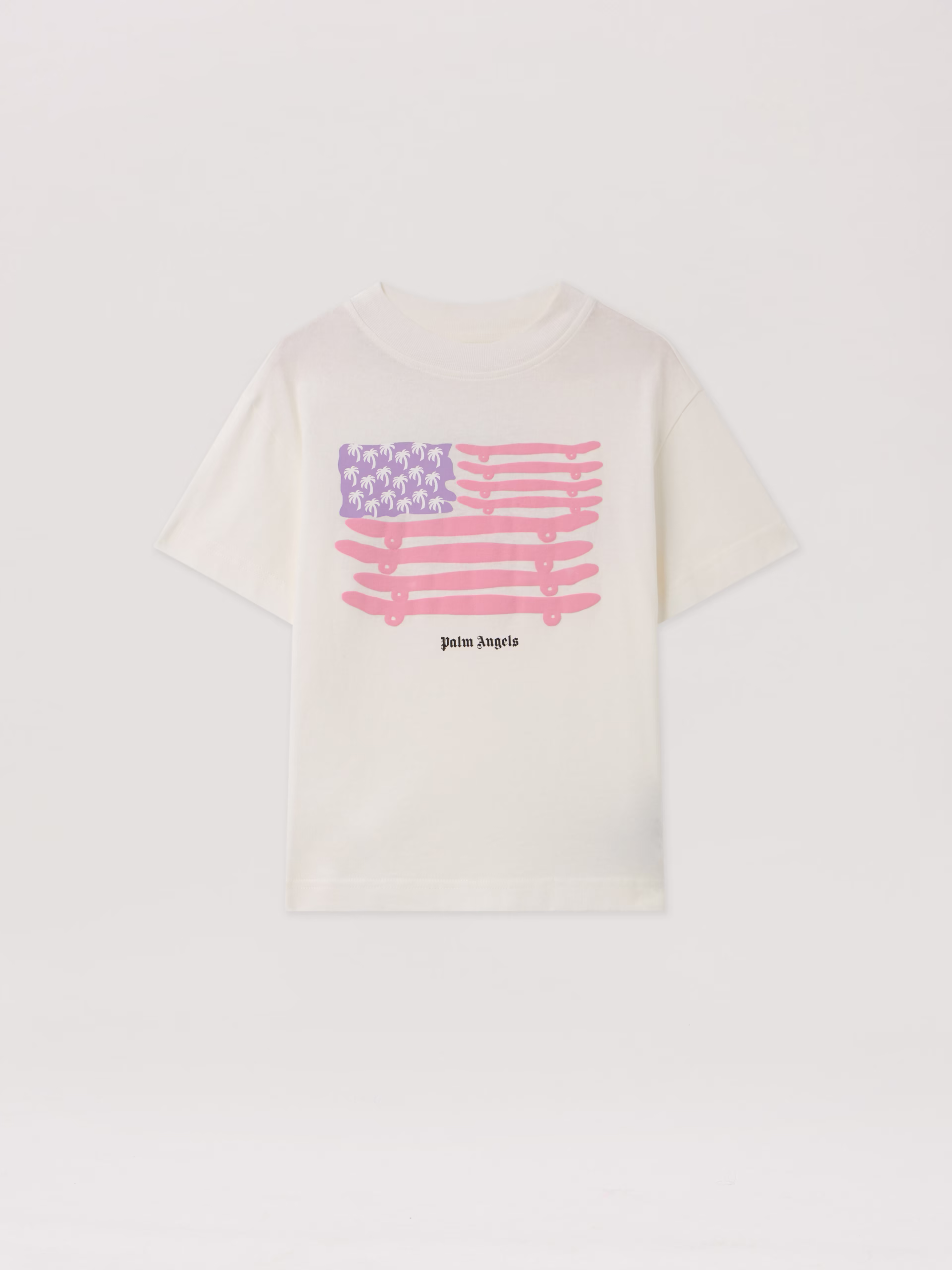 Organic cotton T-shirt featuring a bold flag graphic with palm motifs and a statement back print, embodying streetwise coolnes