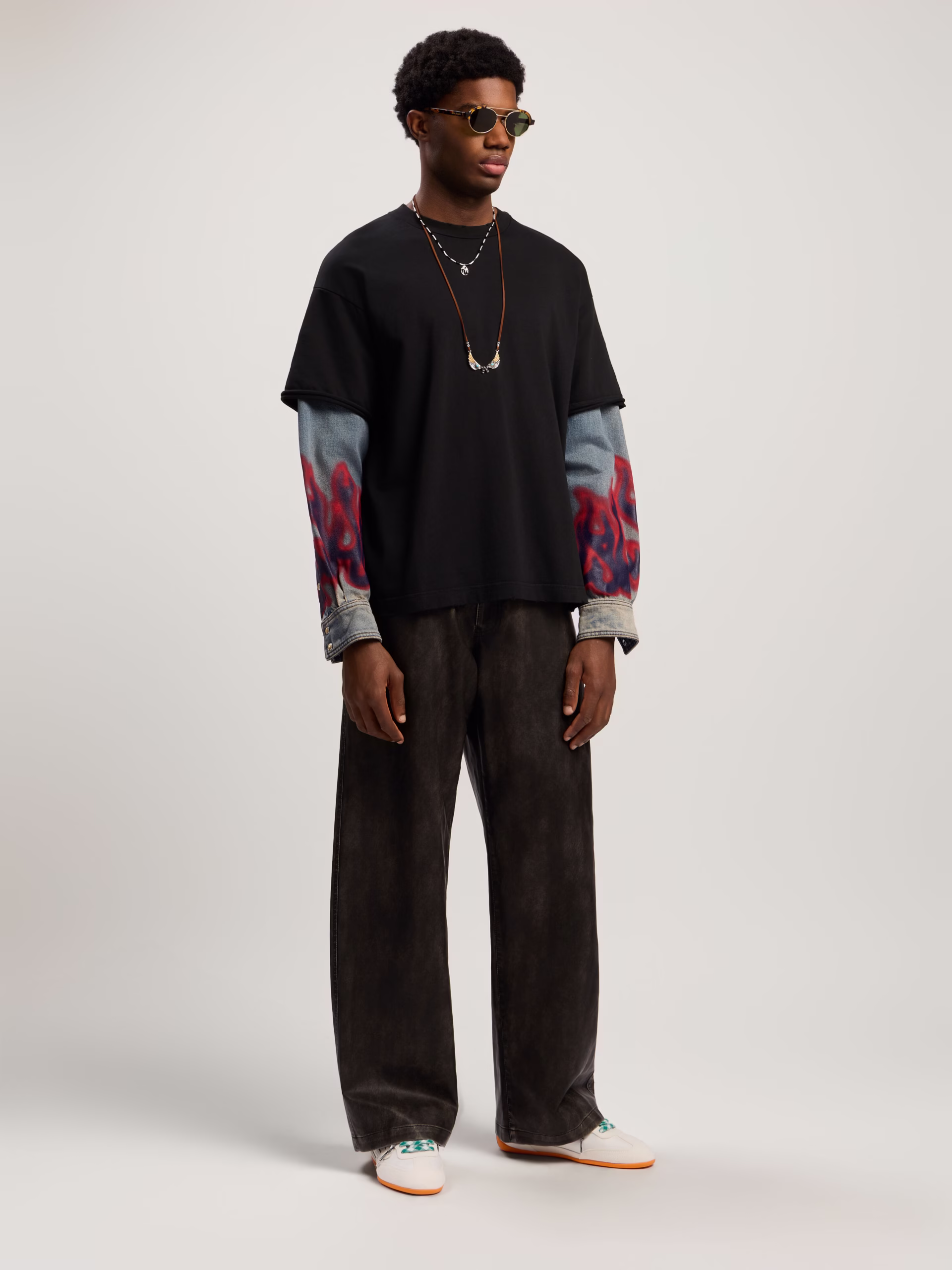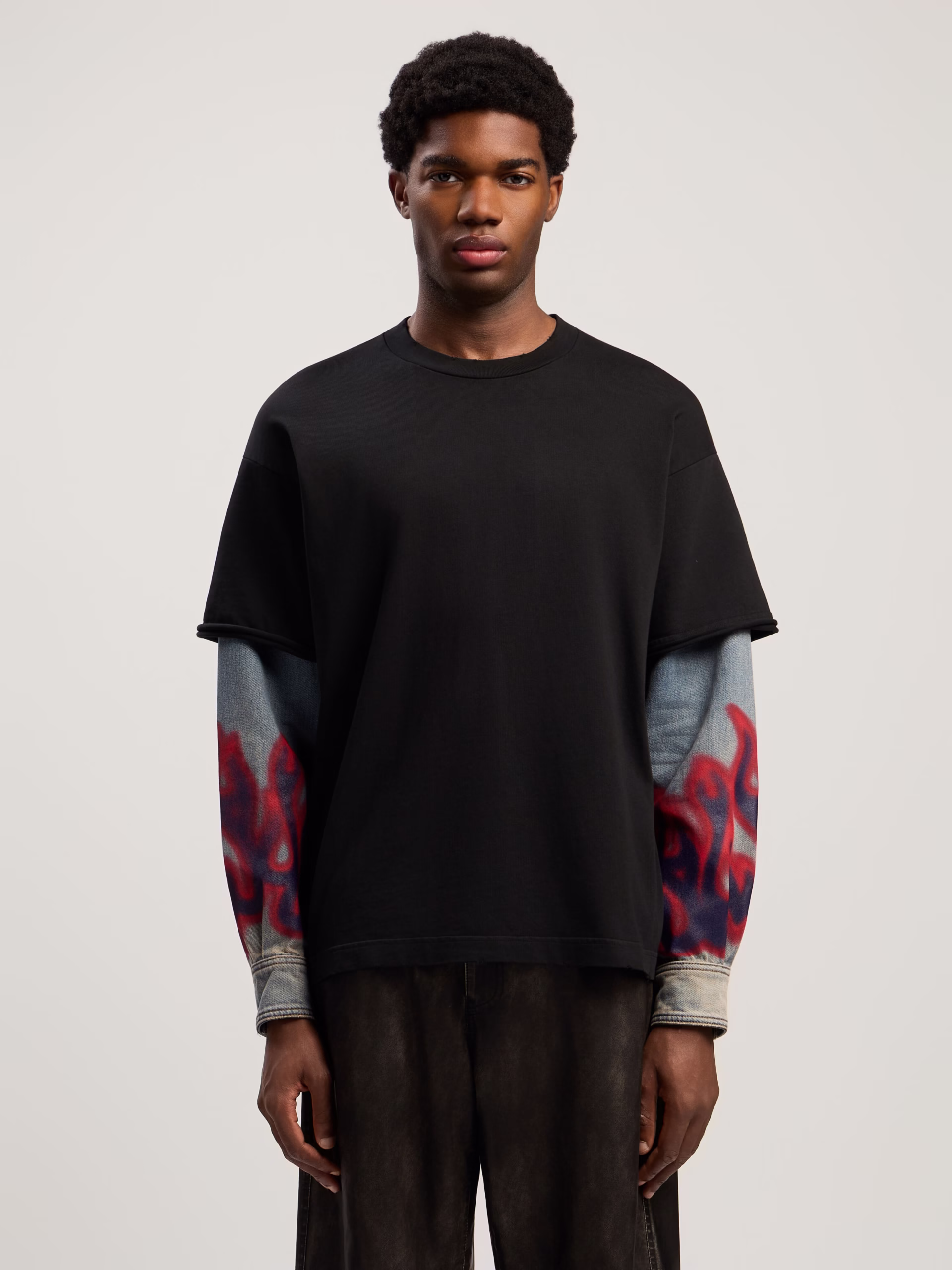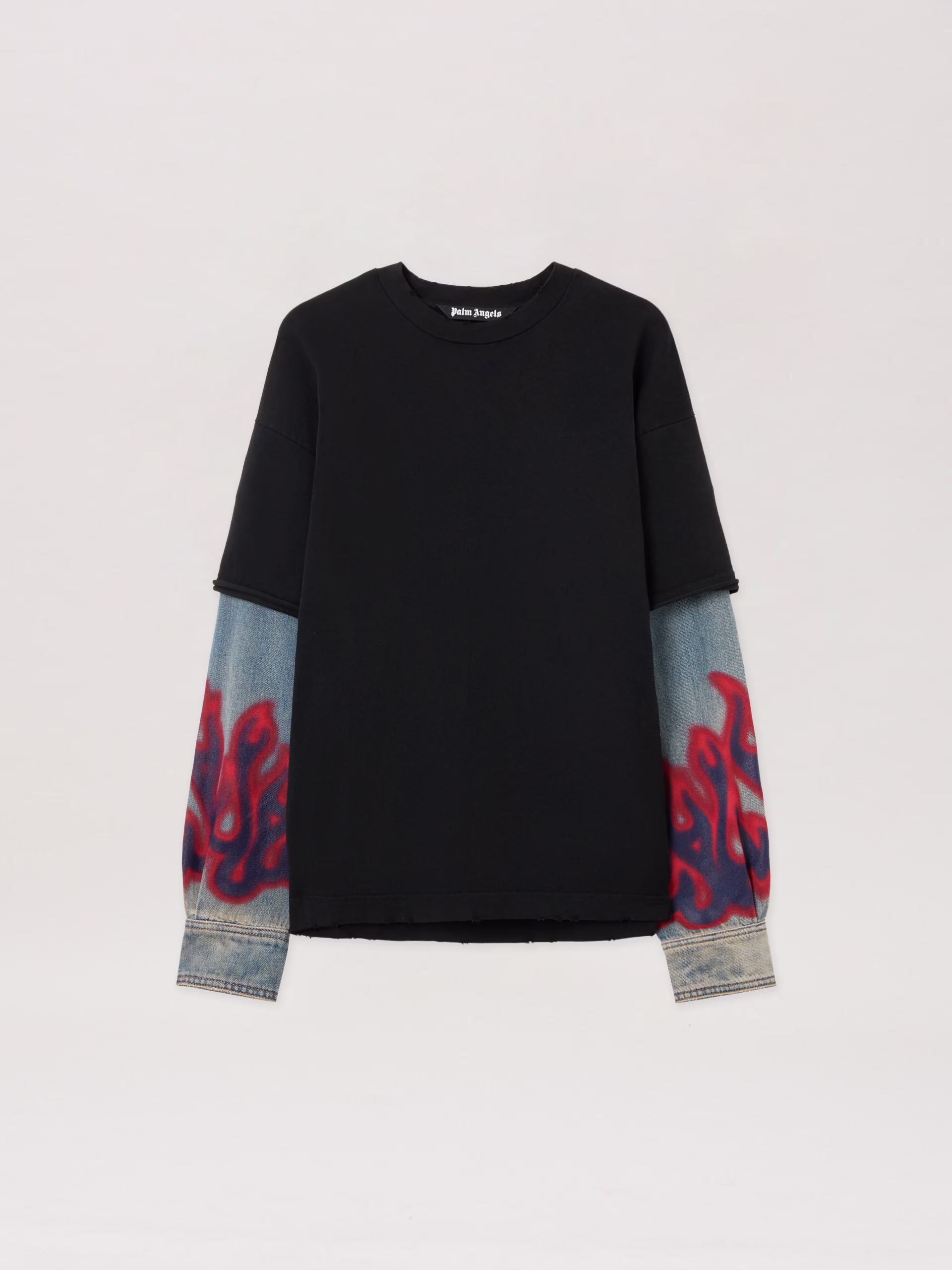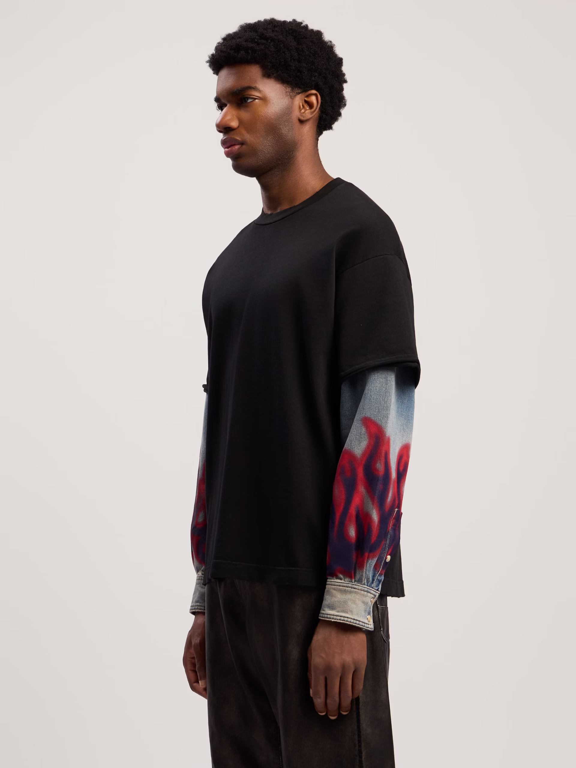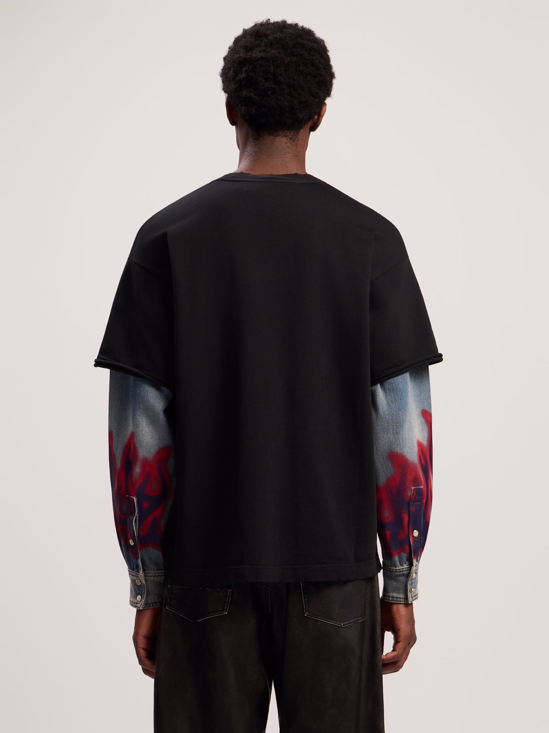 This dynamic long-sleeve shirt merges streetwear aesthetics with a bold flame motif, featuring denim sleeves and a sleek black
