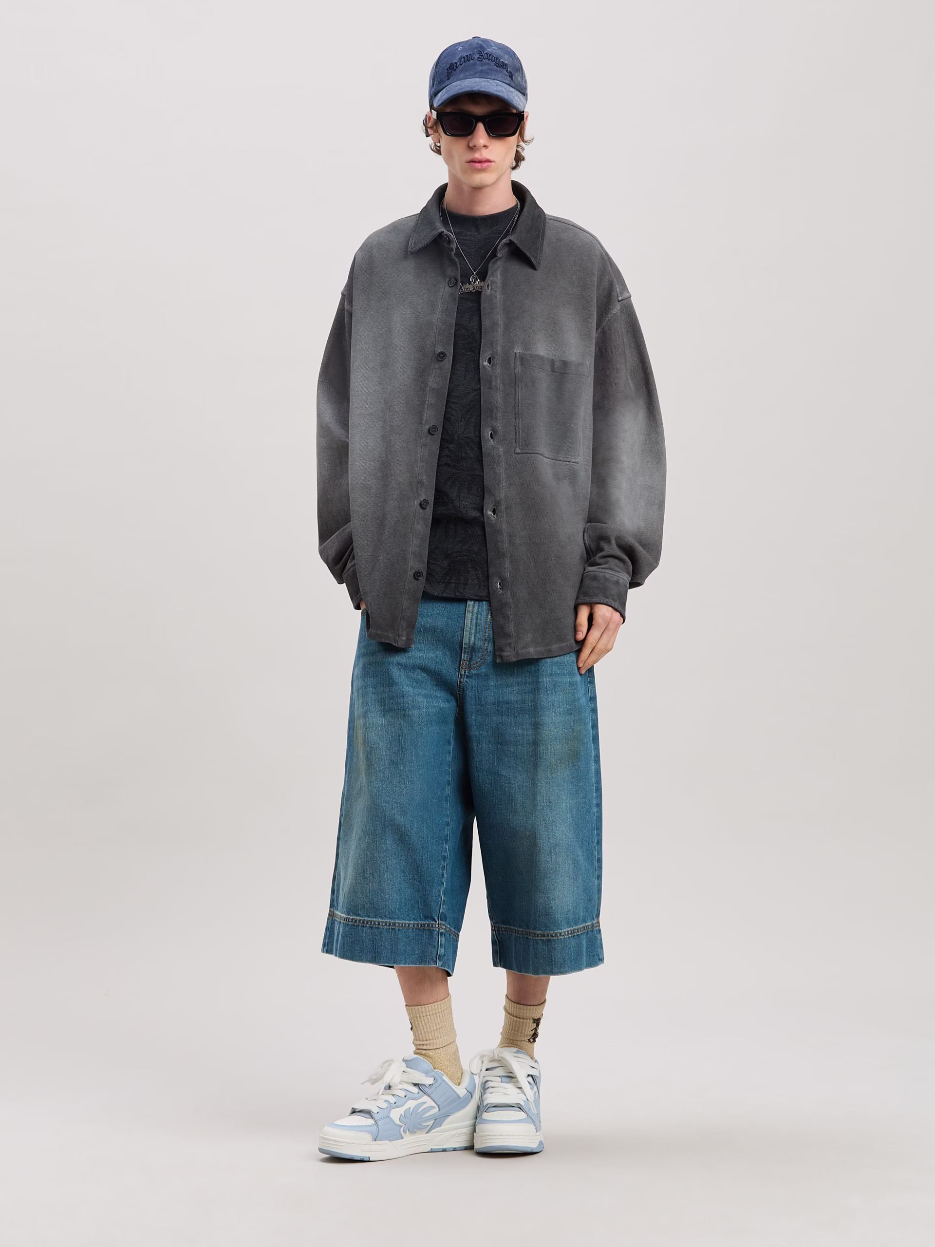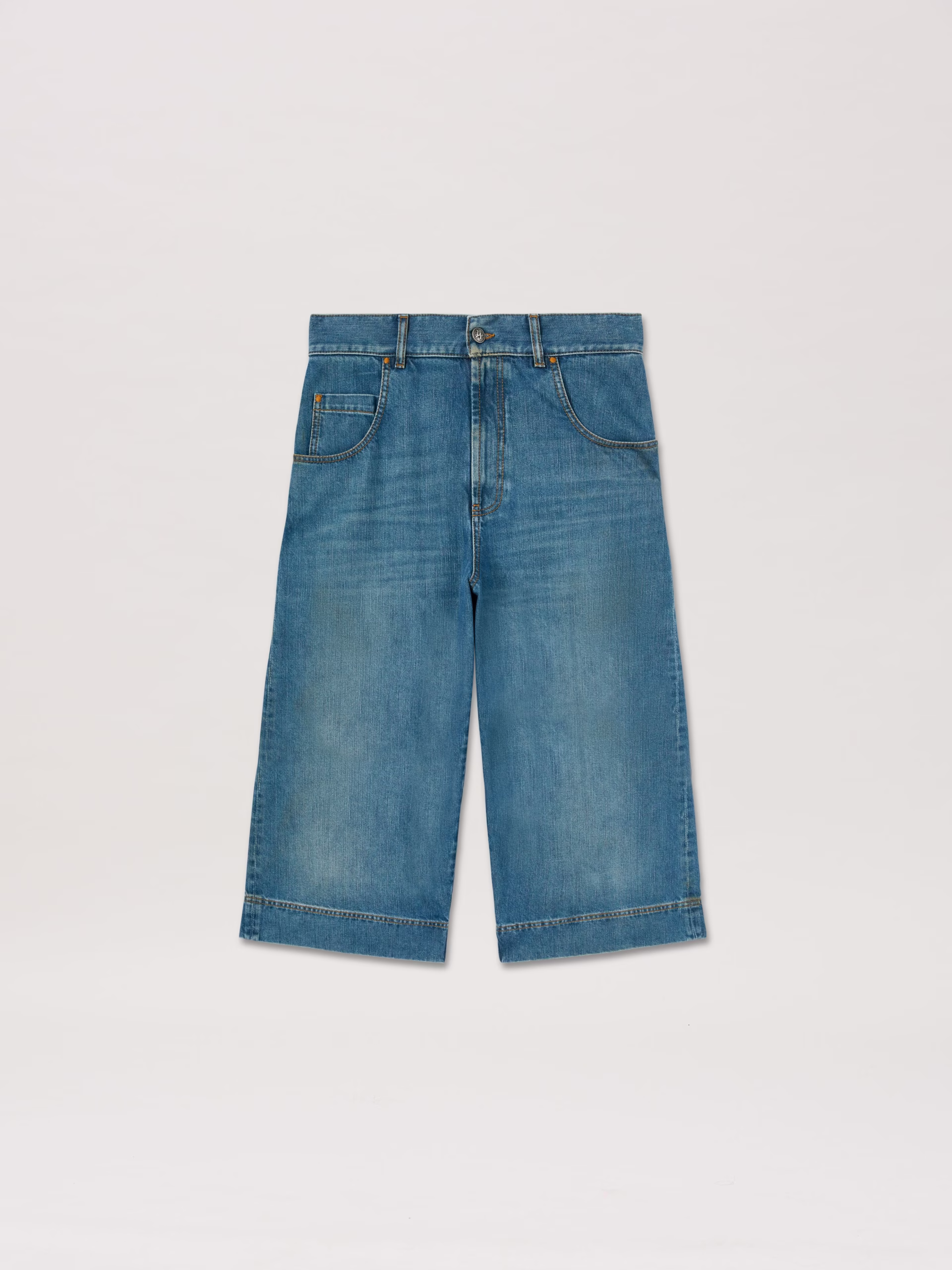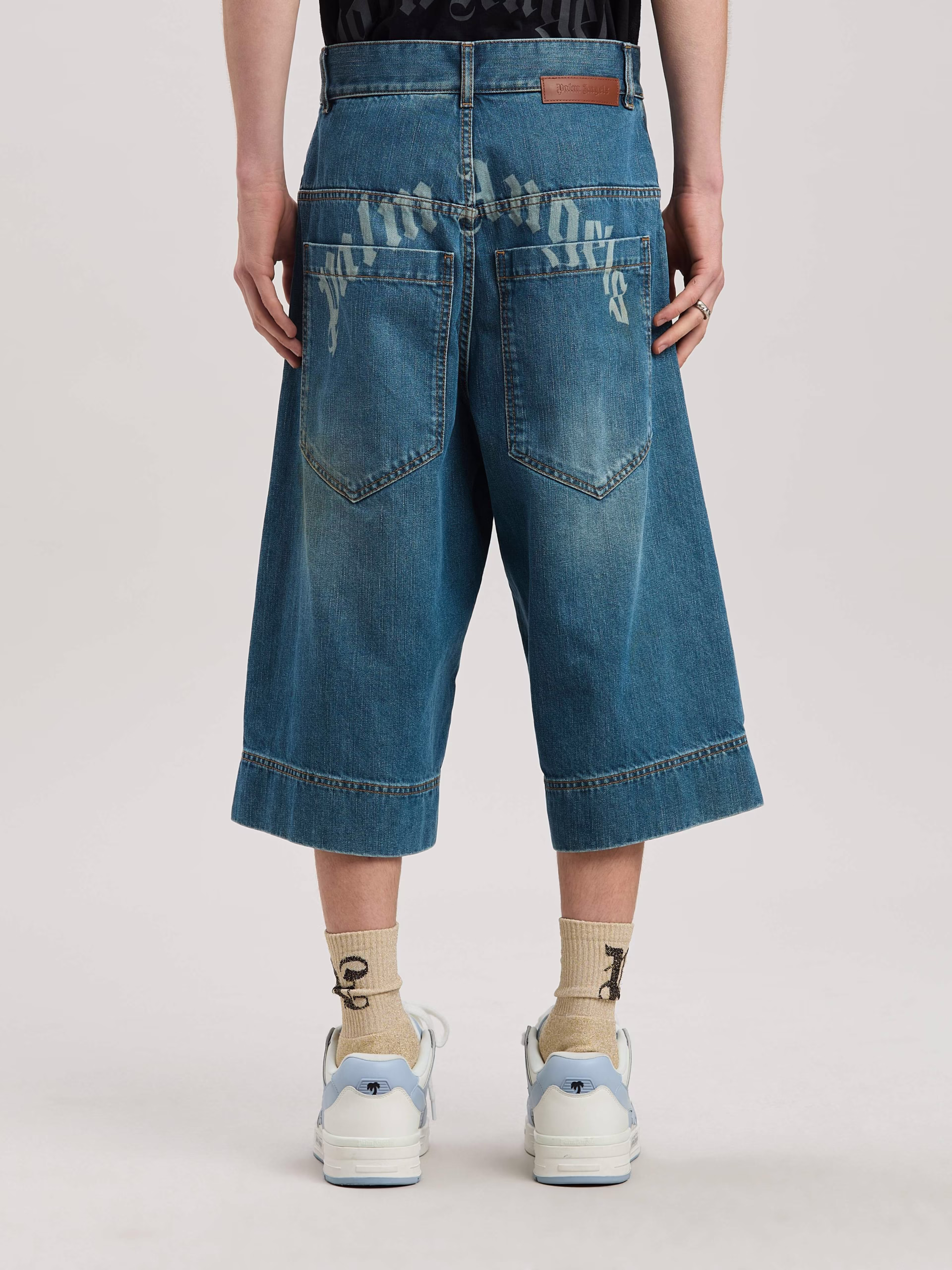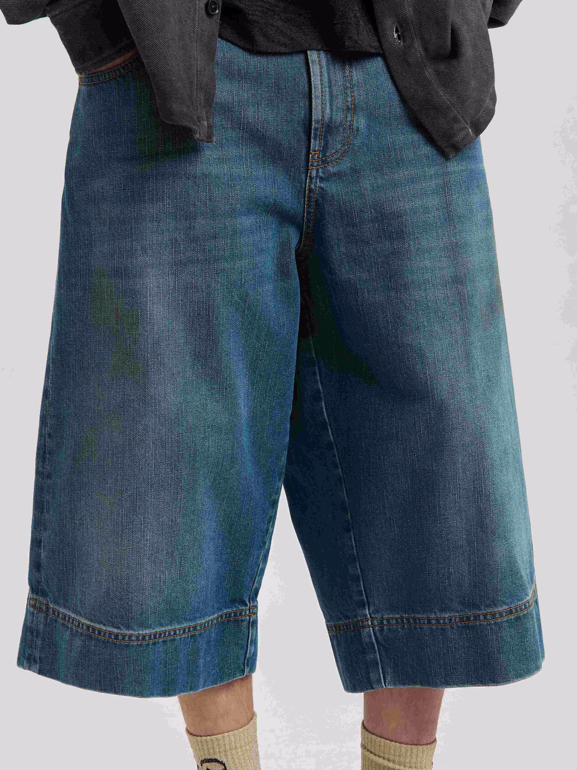 Experience the logo in an ever-changing finish. Men’s blue denim skater bermuda with green lasered Curved logo on back.