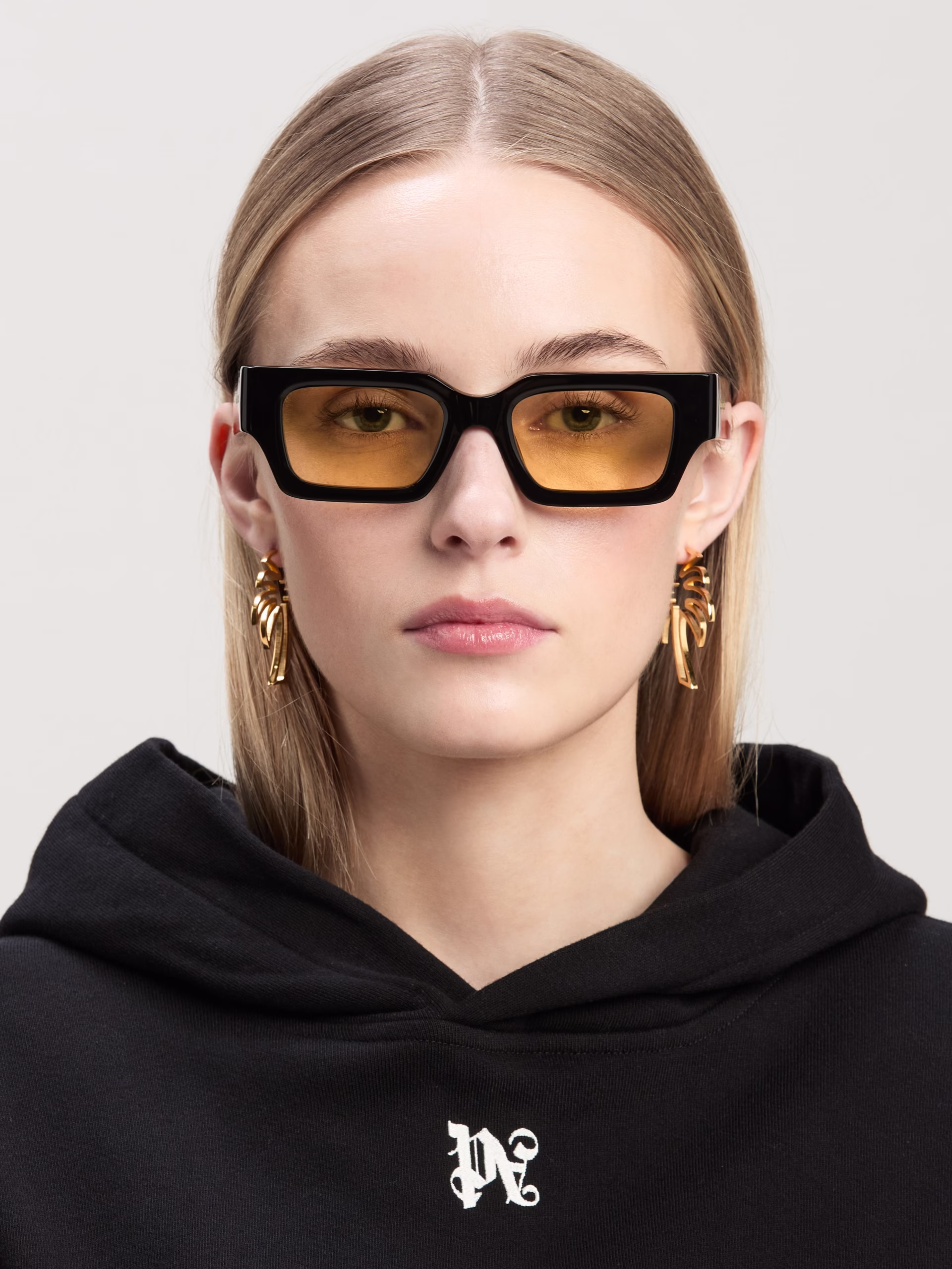 A solid frame complemented by fine metal details. Black geometric sunglasses with yellow lenses and thick temples with metal detai