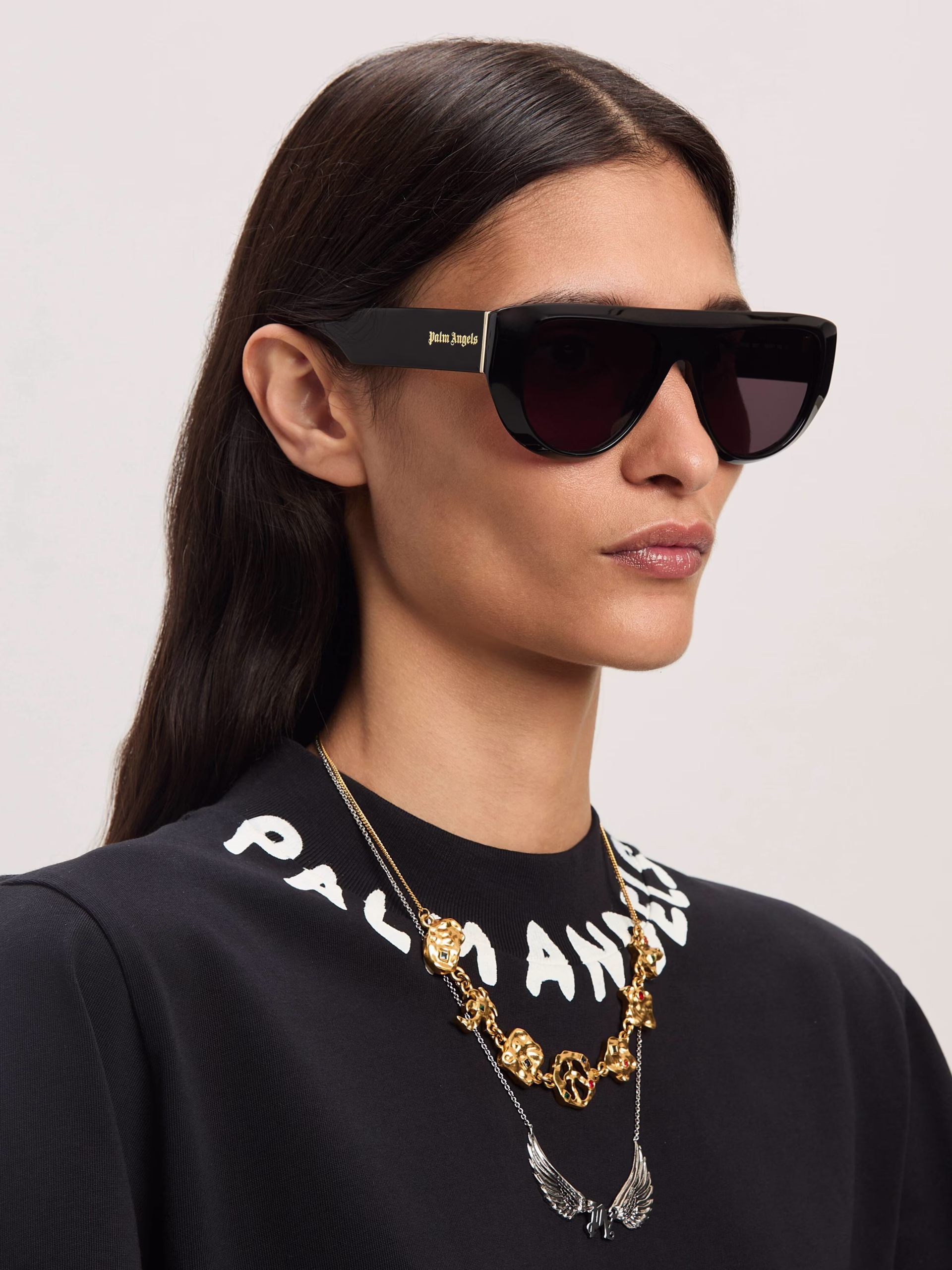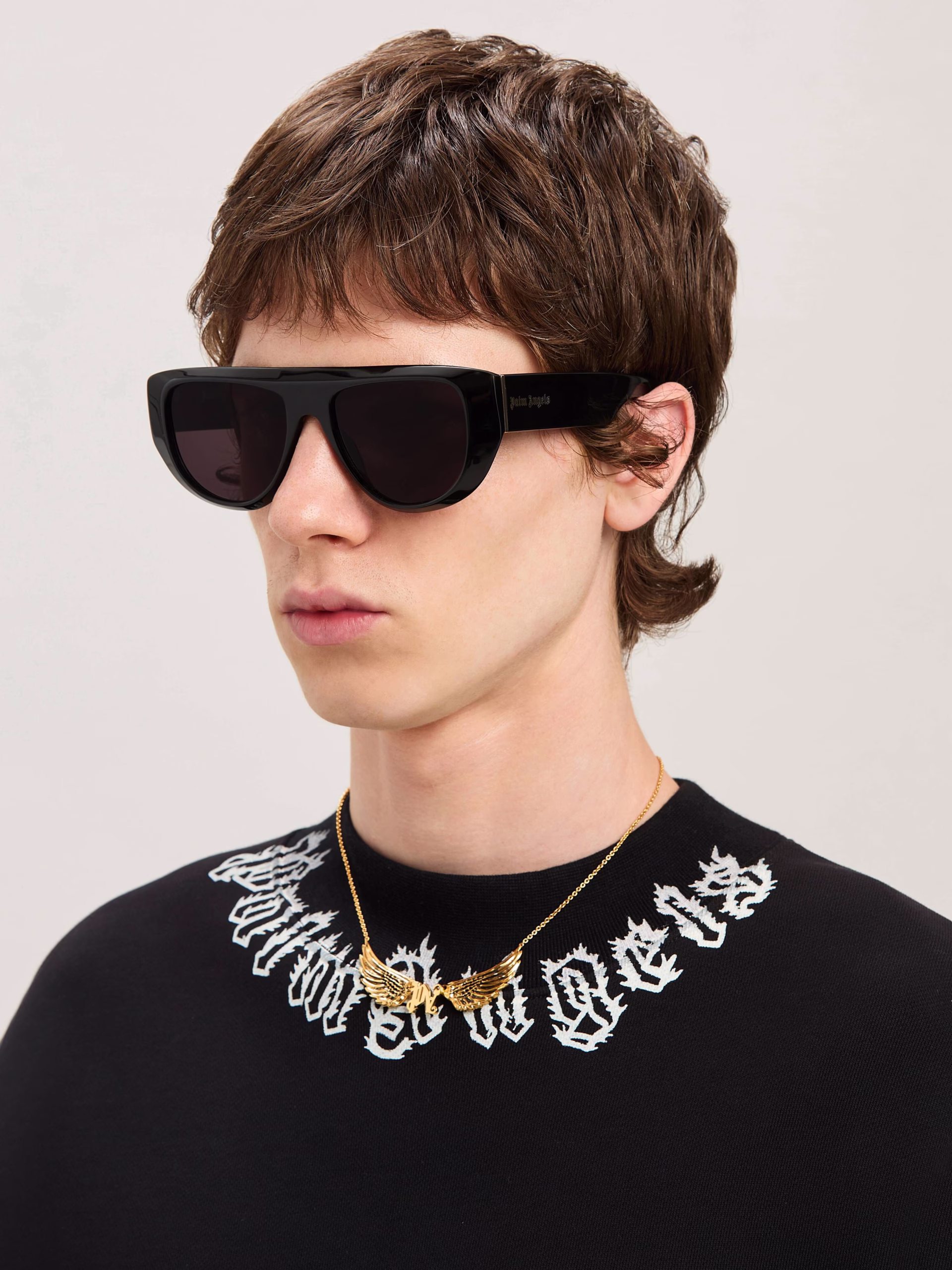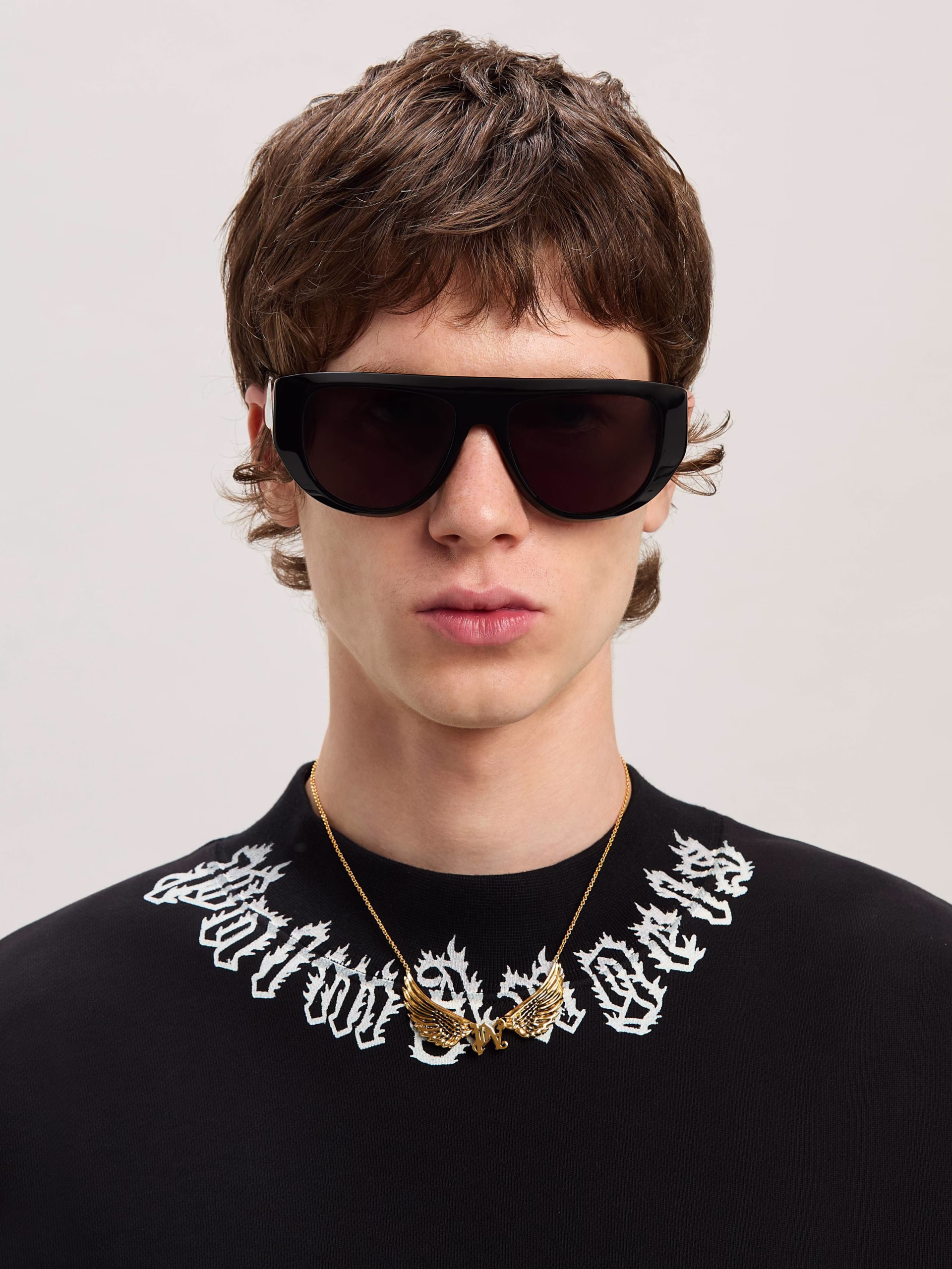 Redefining the mask frame through slim fit and round lenses. Black mask-shaped frame with single top bar, dark grey lenses and ton