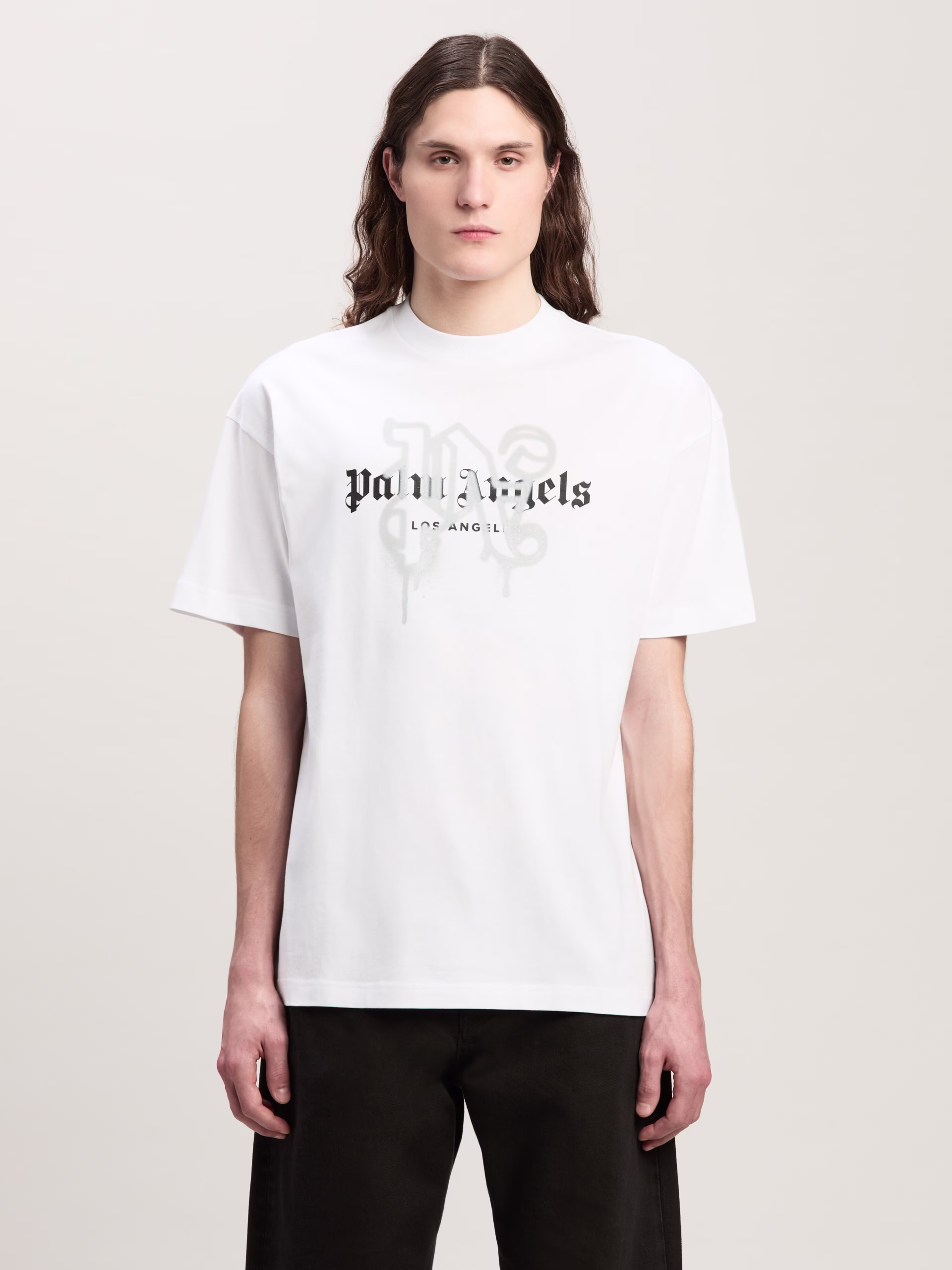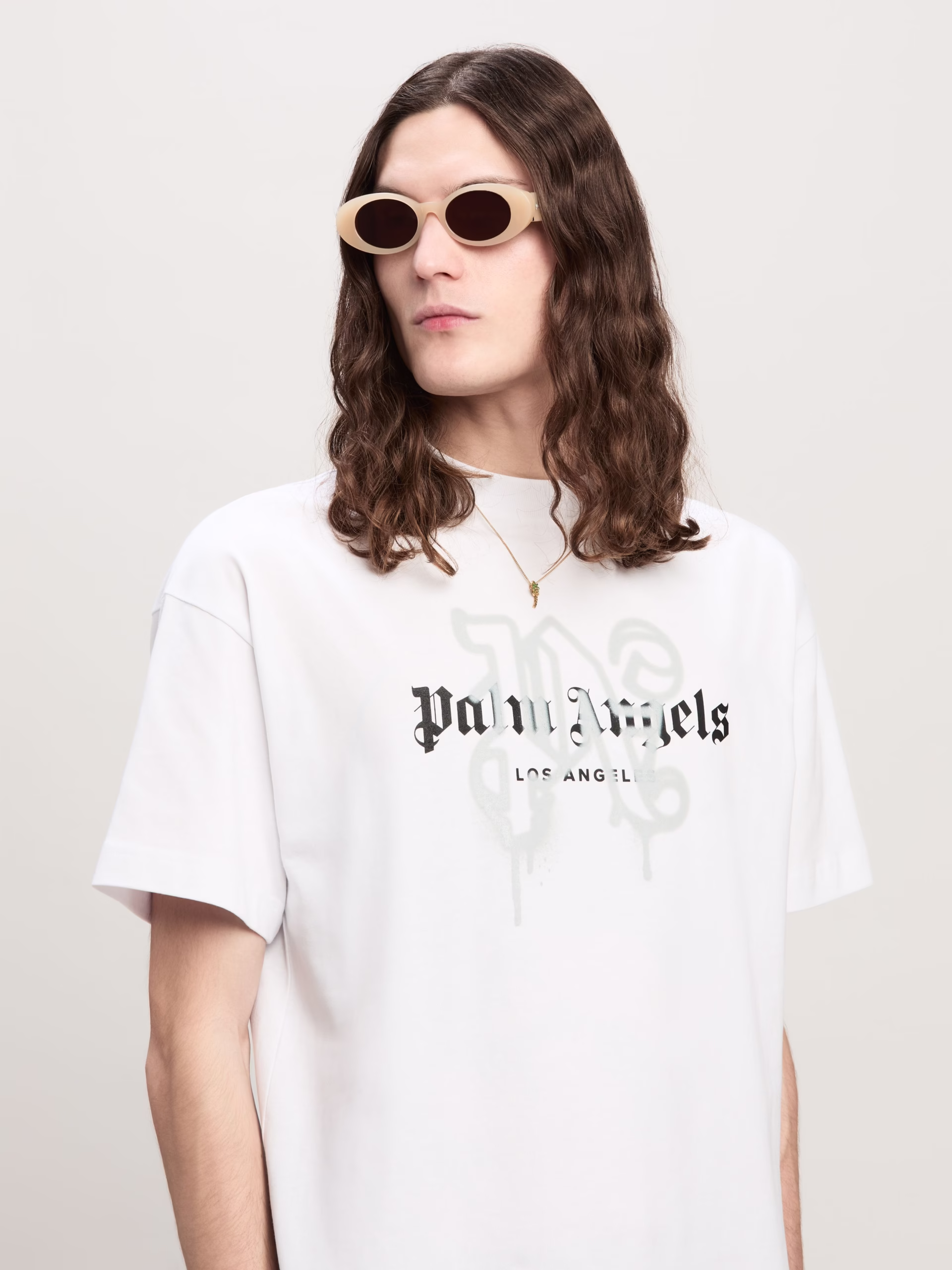 A timeless icon updates its style, the new Spray City T-shirt. Men’s white T-shirt with Palm Angels logo and Los Angeles letterin