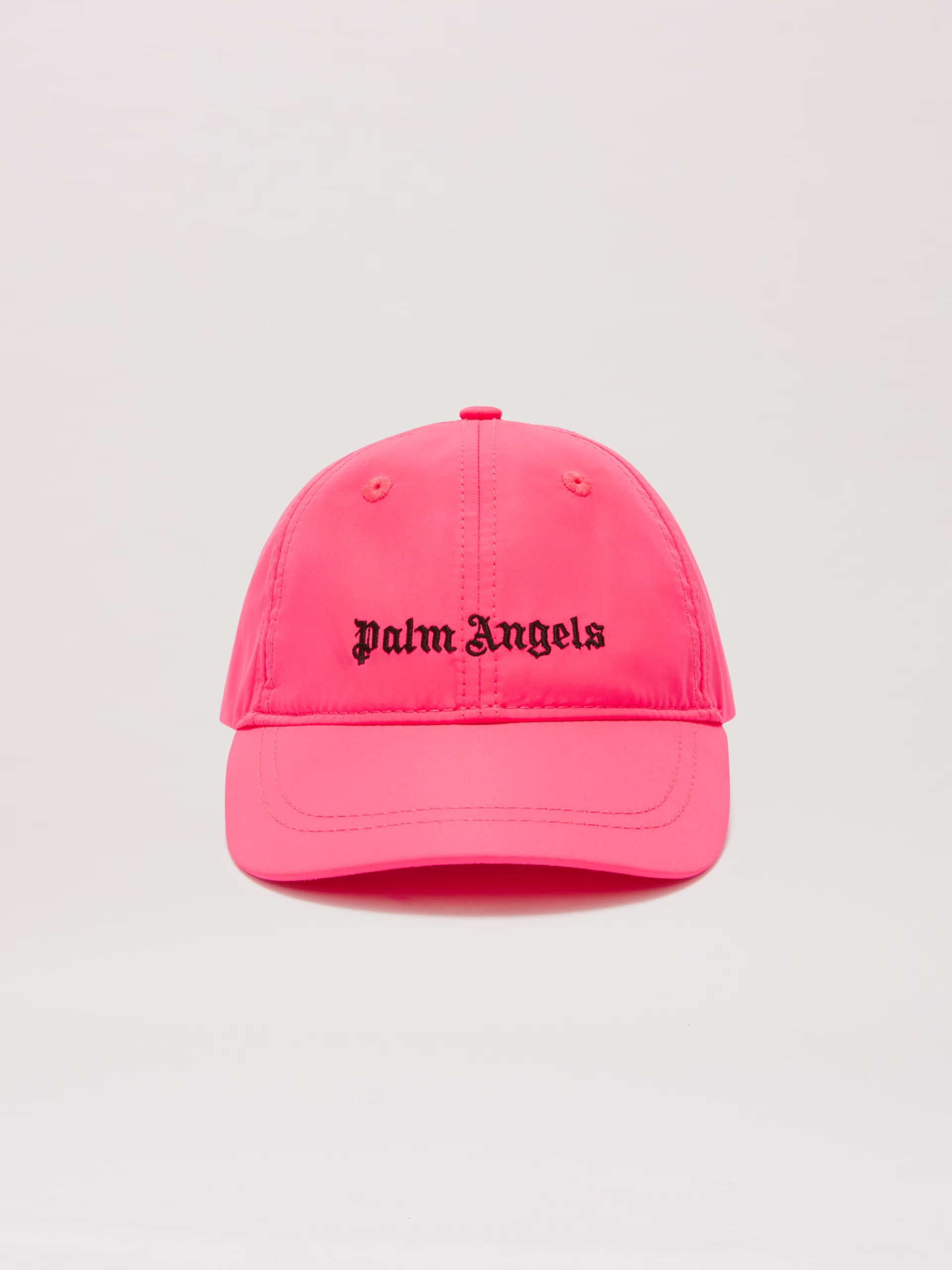 Building your everyday outfit from top down. Girl’s fuchsia fluo baseball cap with Palm Angels logo fully embroidered in black on