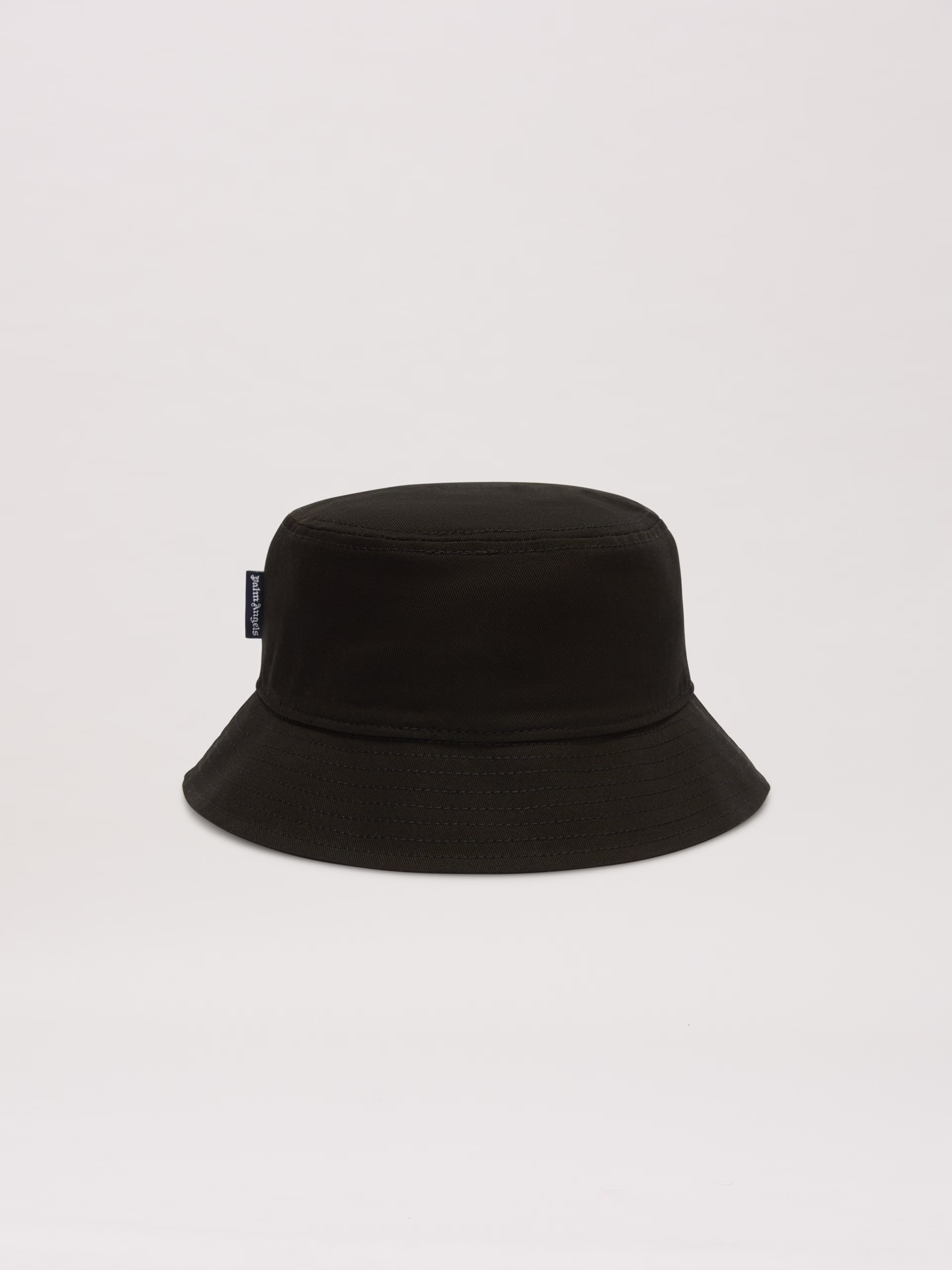 Building your everyday outfit from top down. Boy’s black bucket hat with Palm Angels logo embroidered in white on the front.