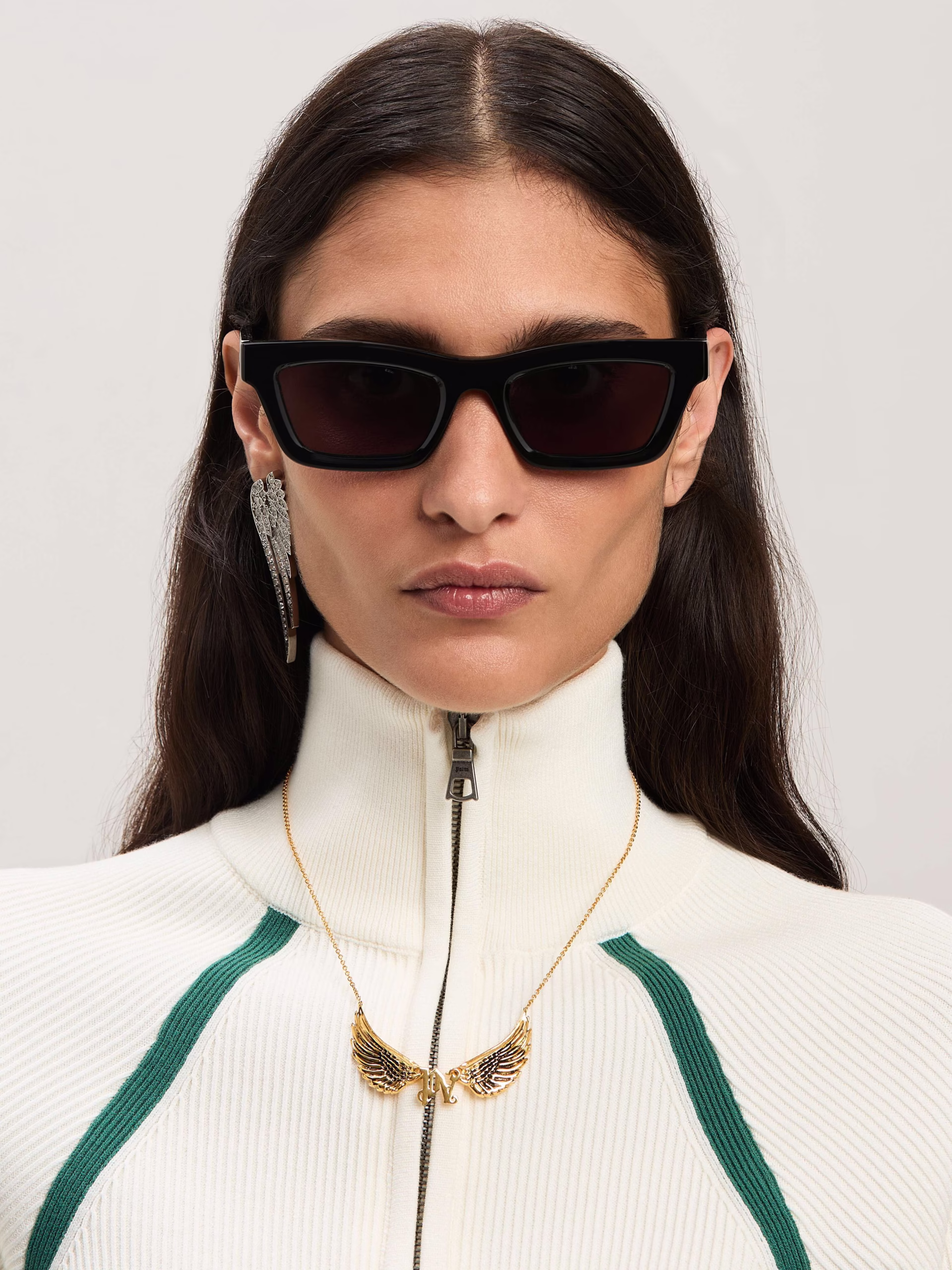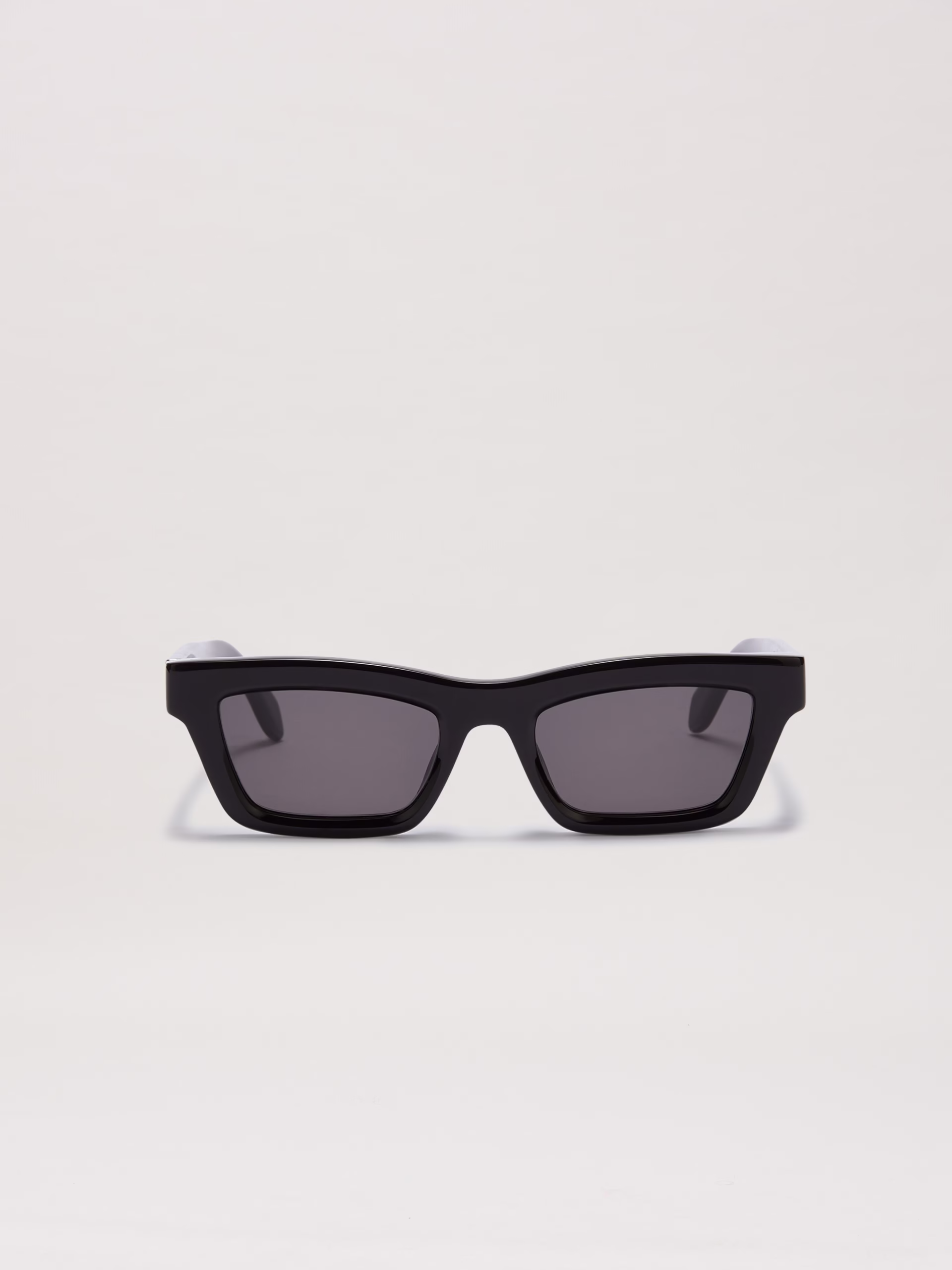 Solid grace, with geometric lines and upswept outer edges. Black rectangular frame with cat-eye corners, dark grey lenses and Pal