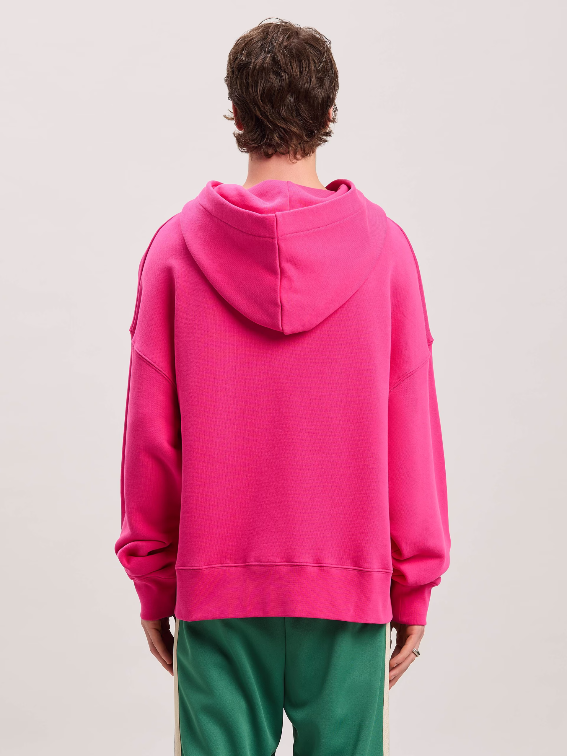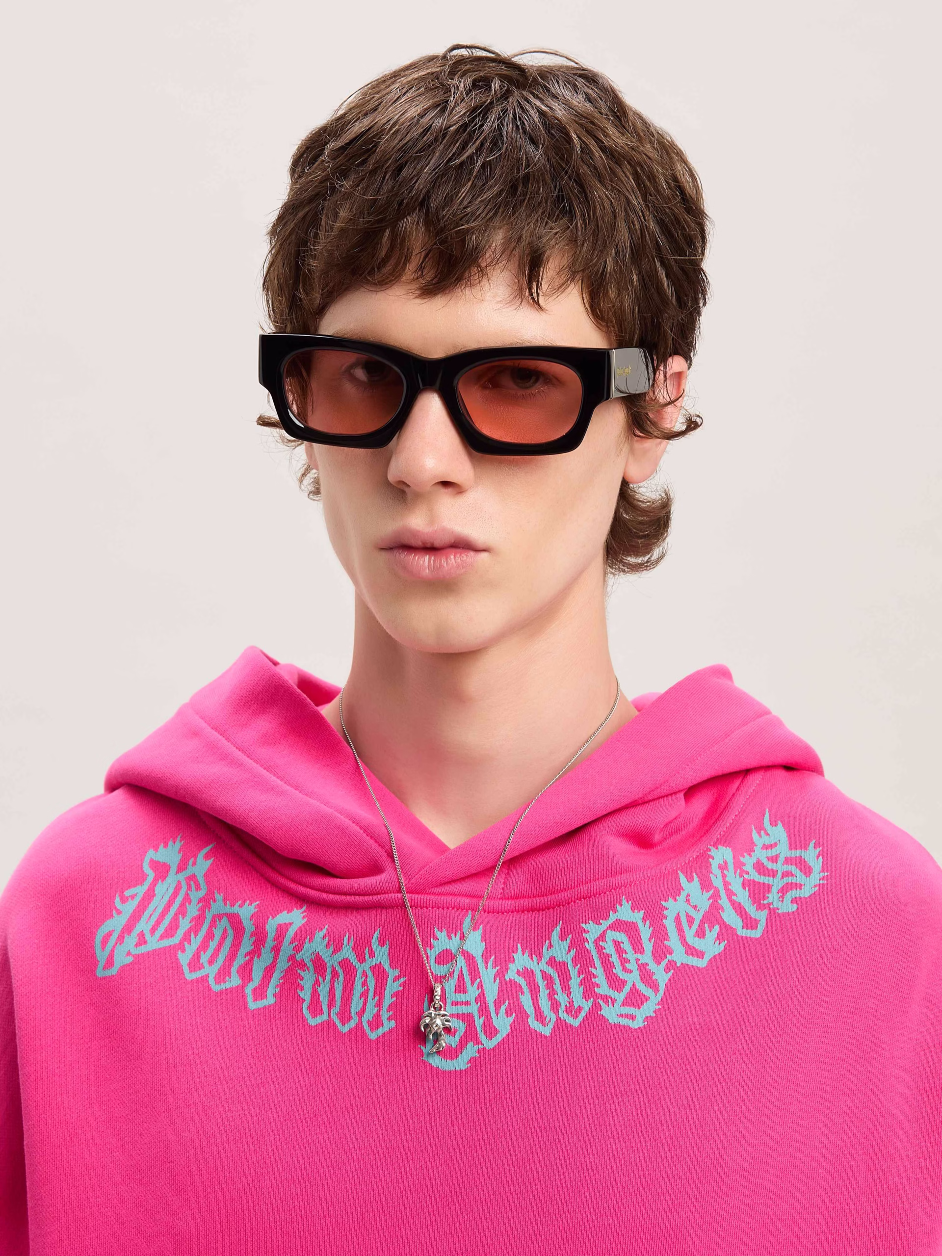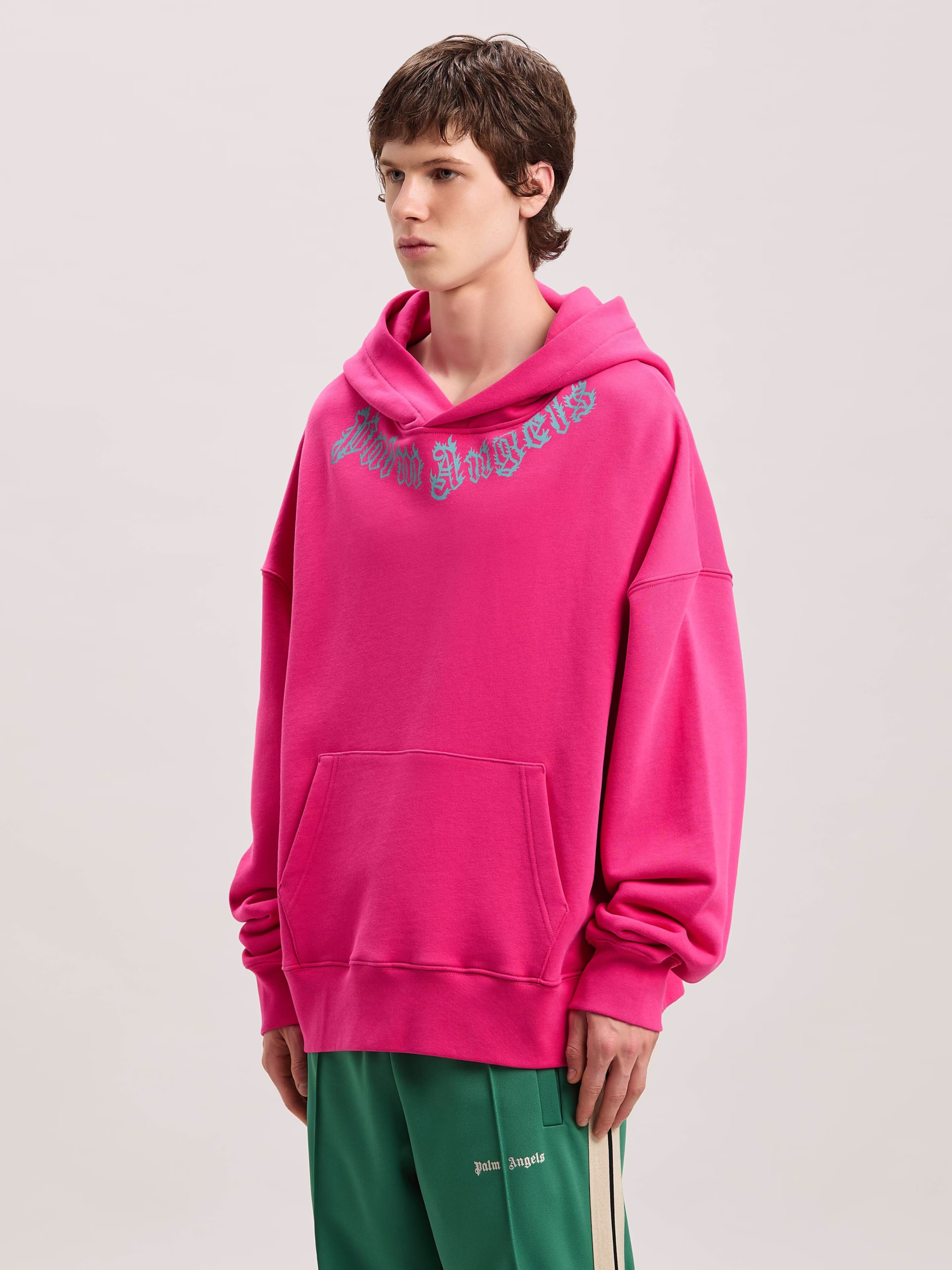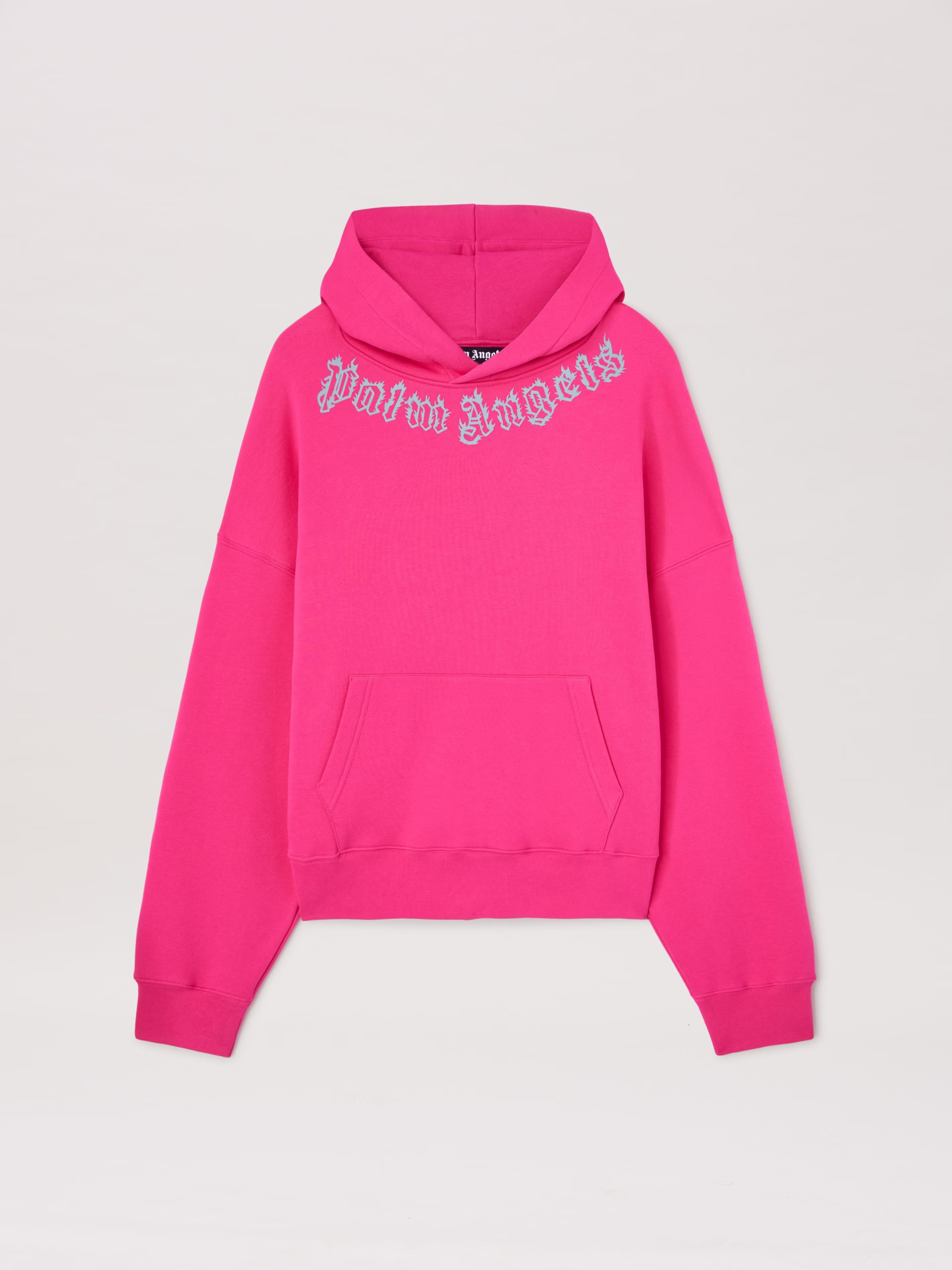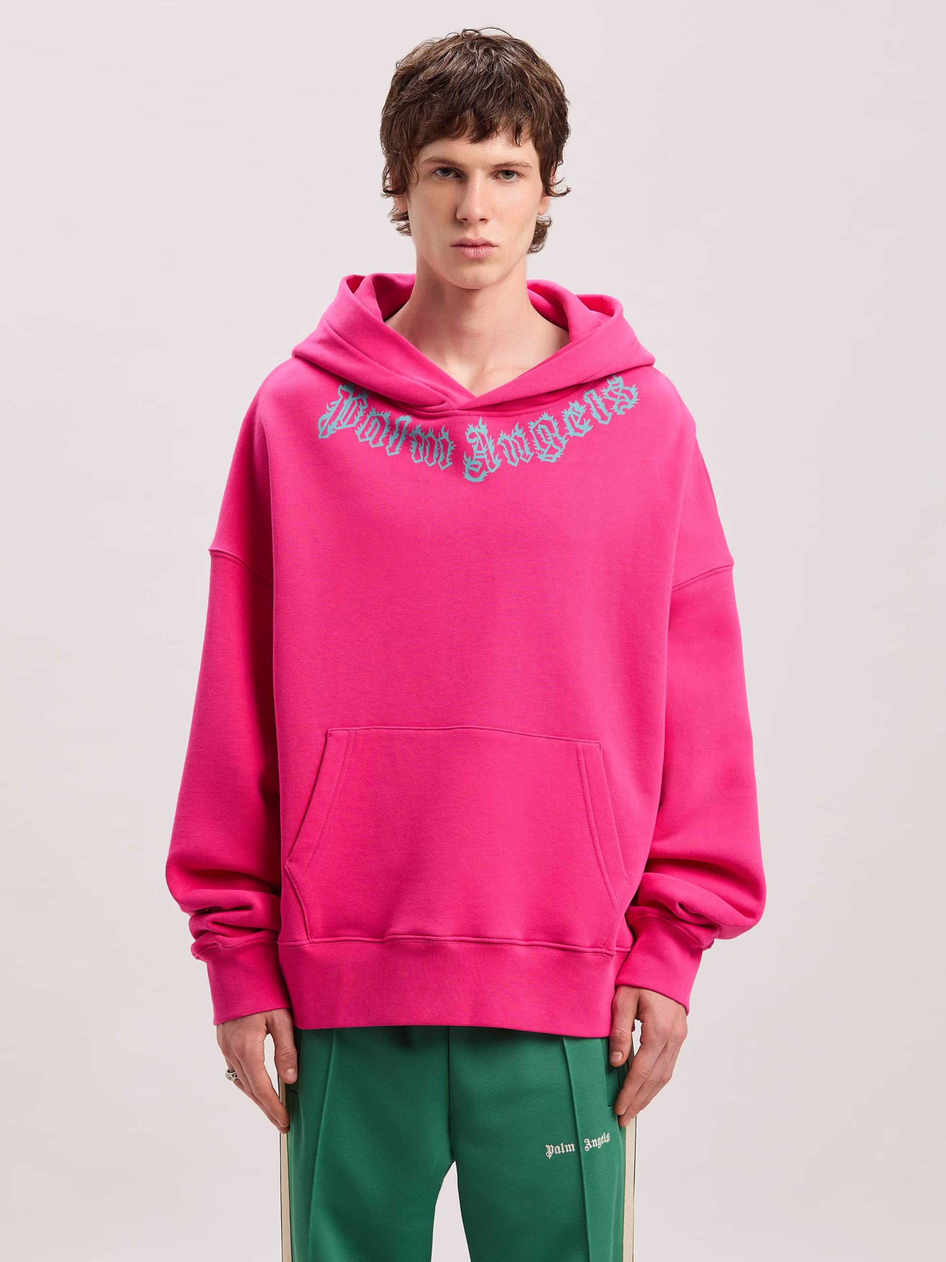 A new version of the Neck logo, with gothic letters augmented by spiky flames. Men’s fuchsia hoodie with logo wrapped in tongues o