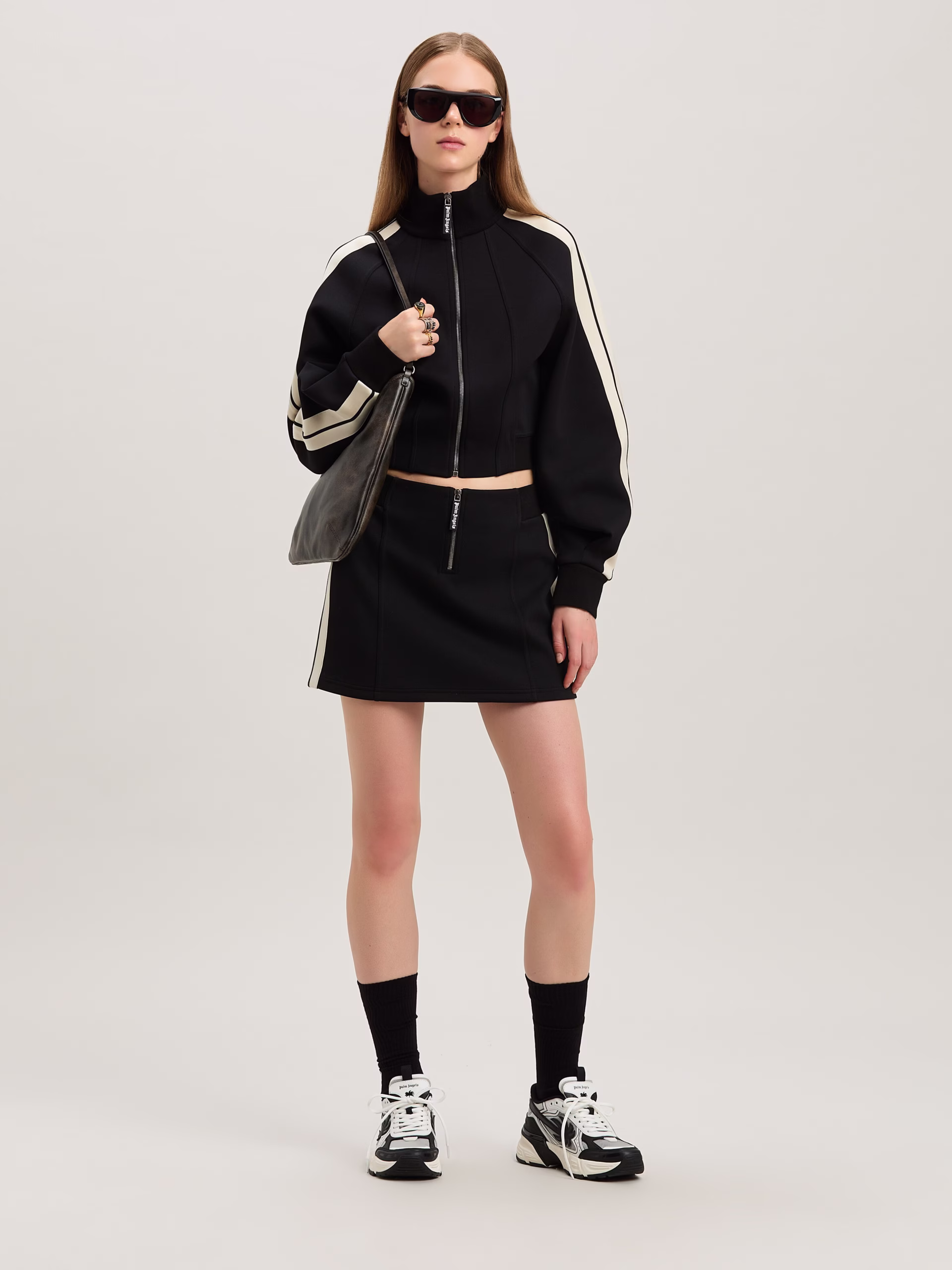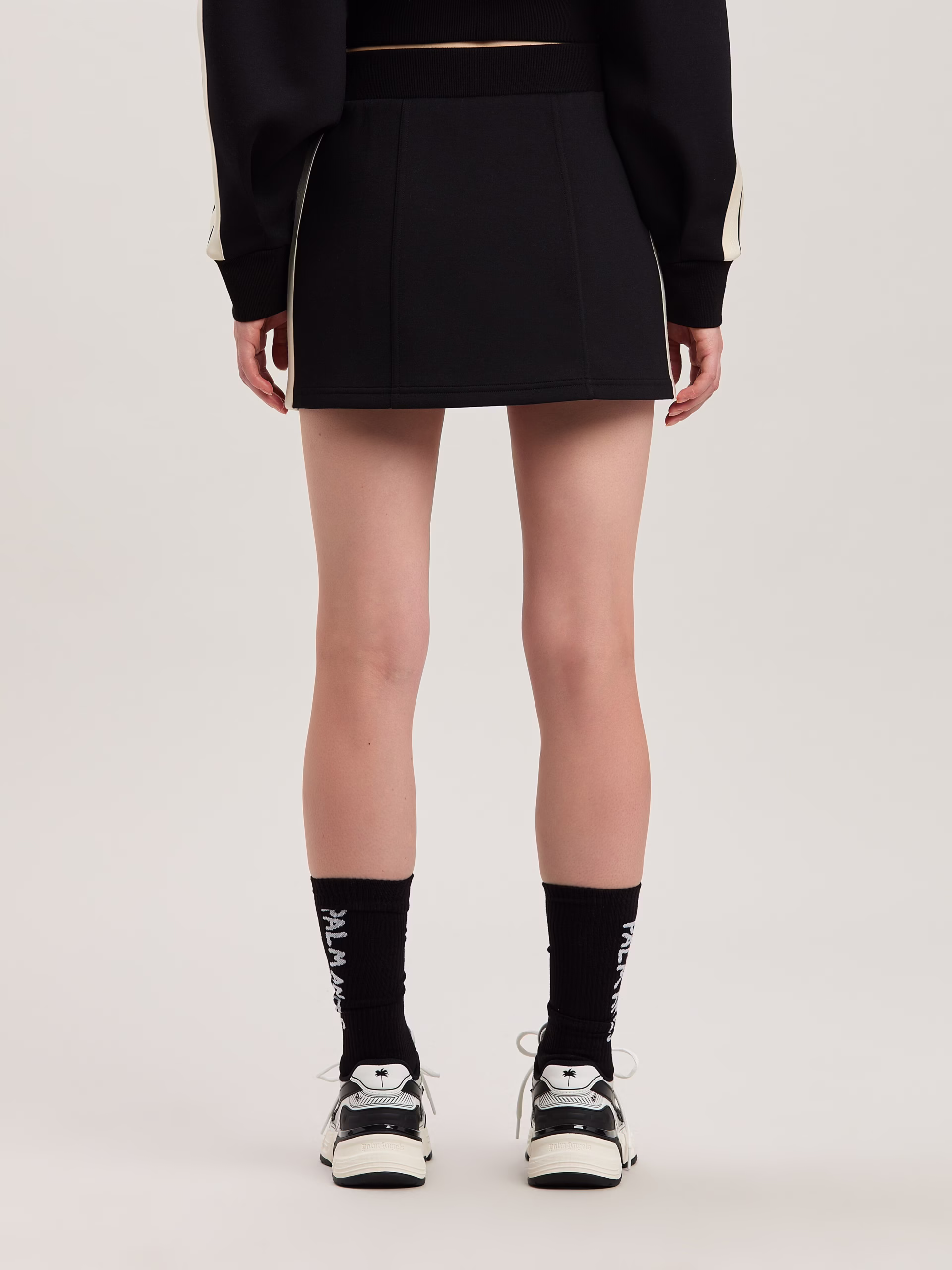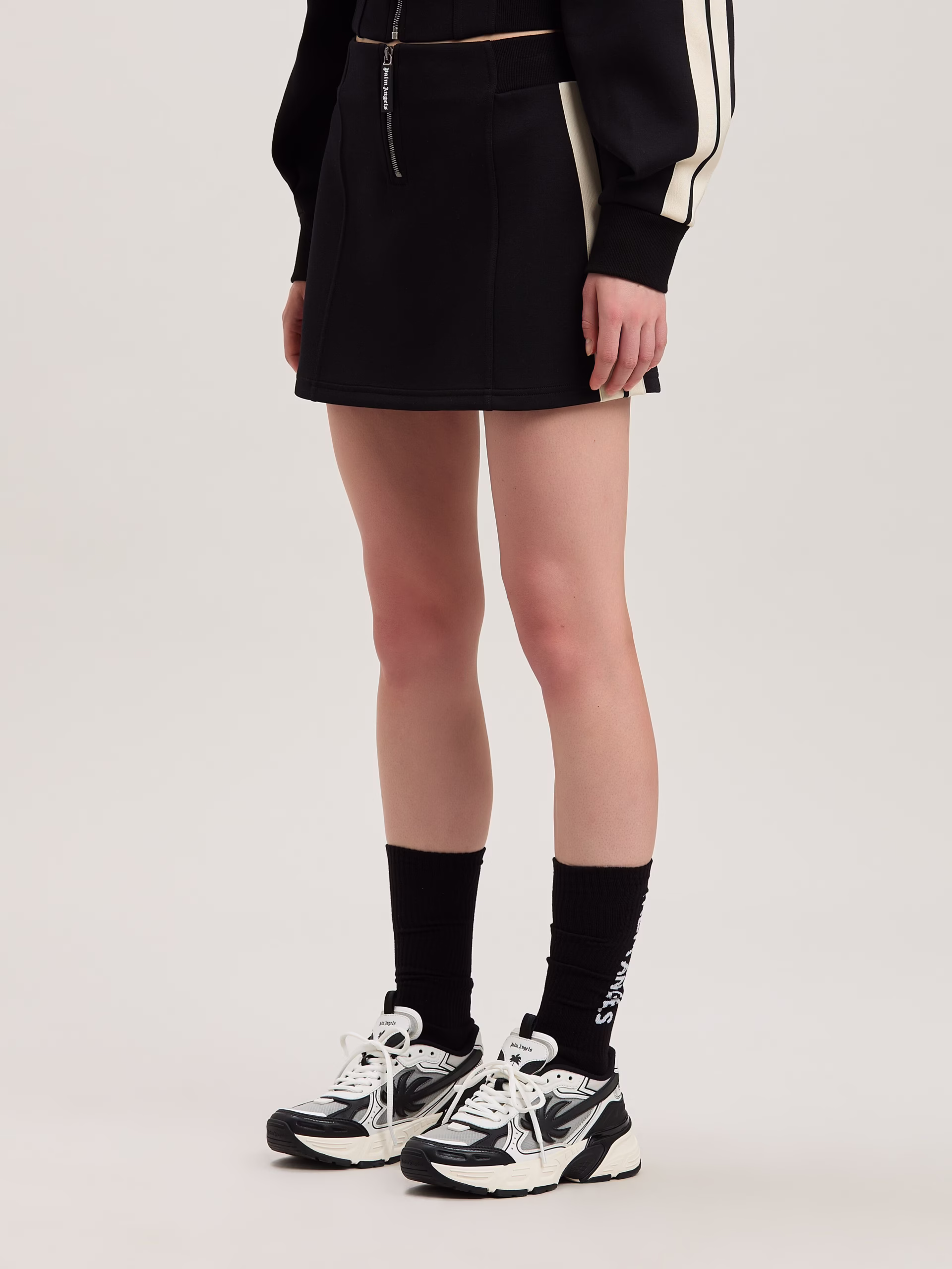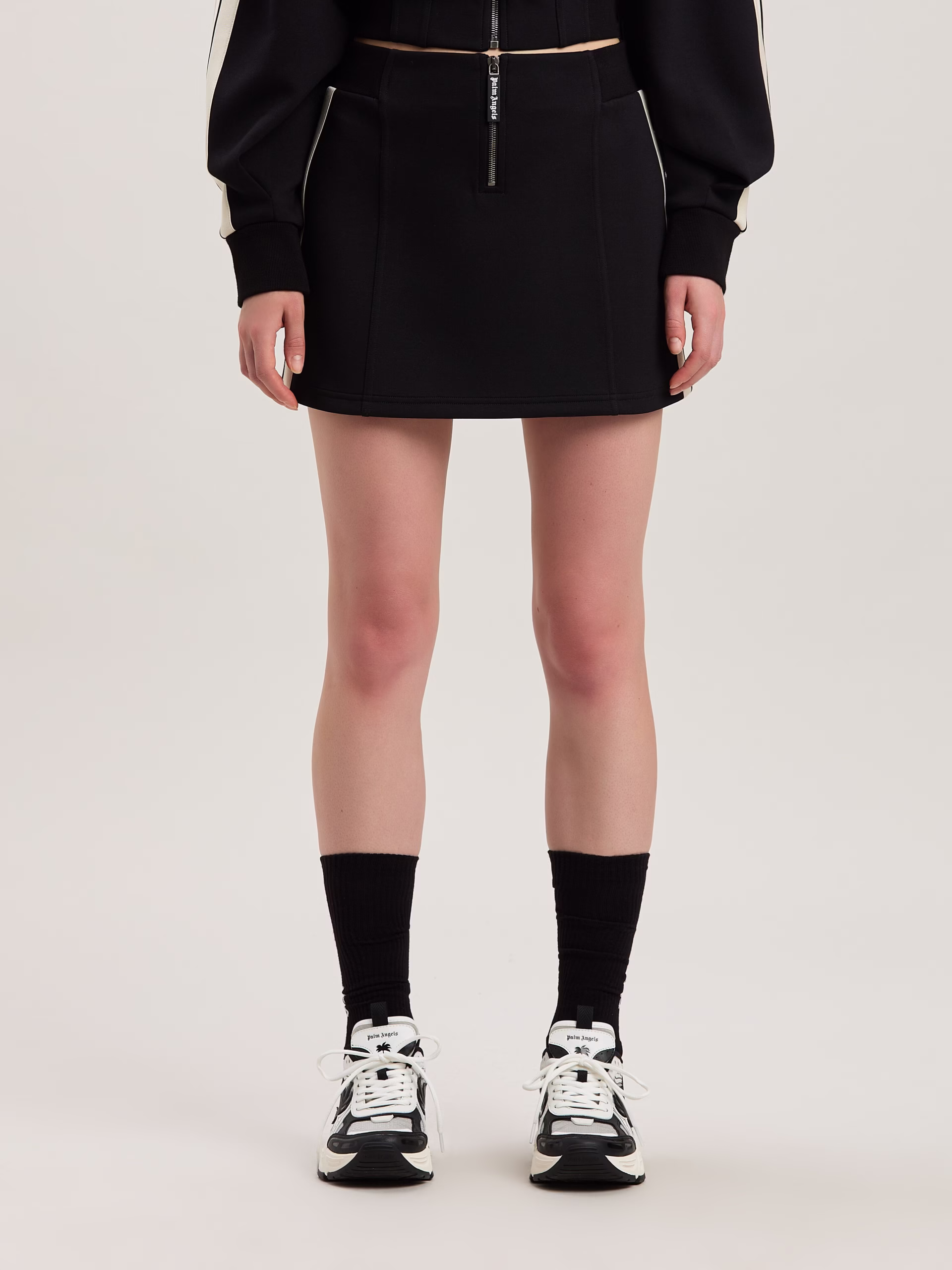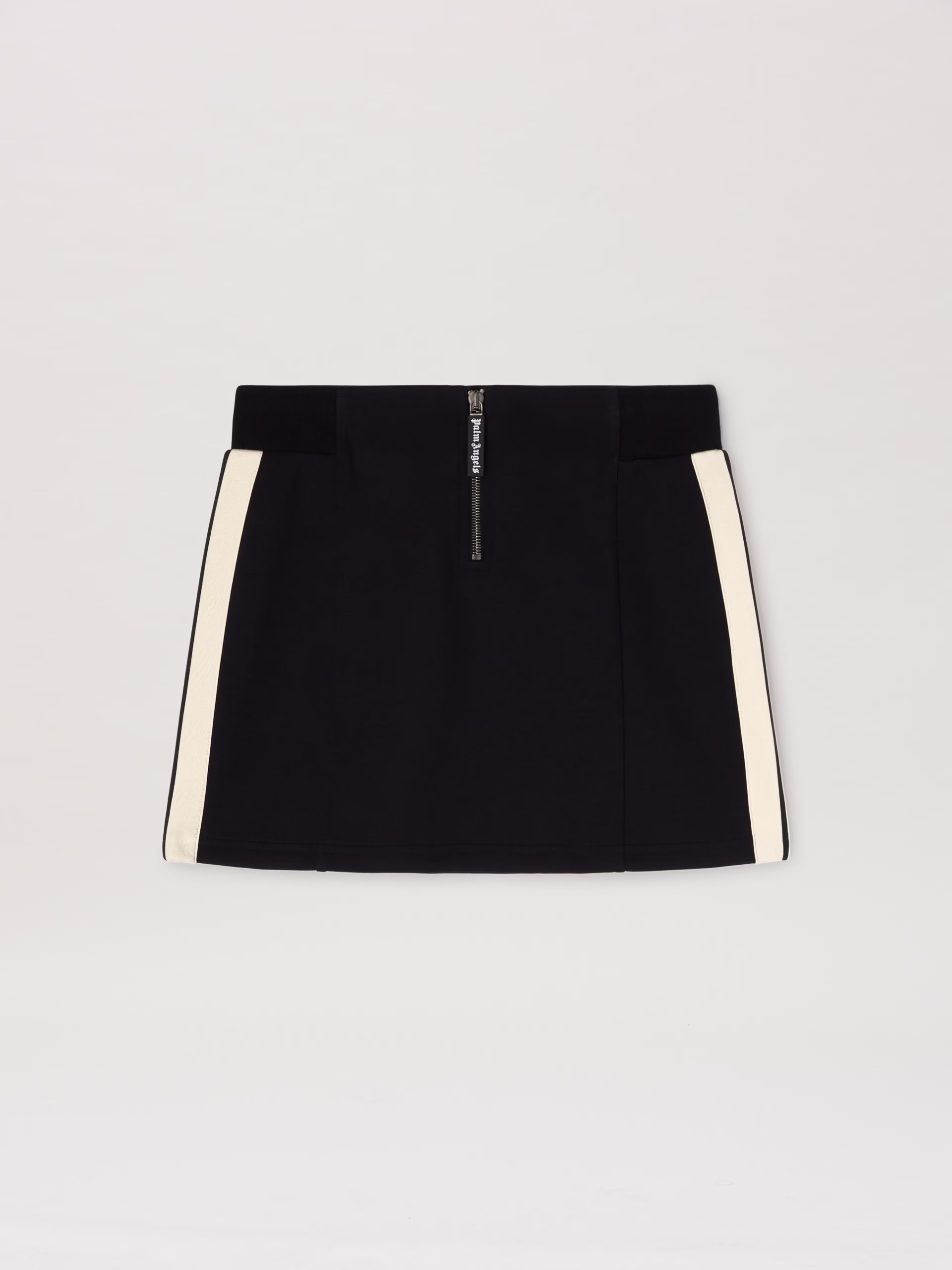 Technical fabric giving leisure garments a sculptural elegance. Women’s black neoprene track miniskirt, with heigh waist and iconi