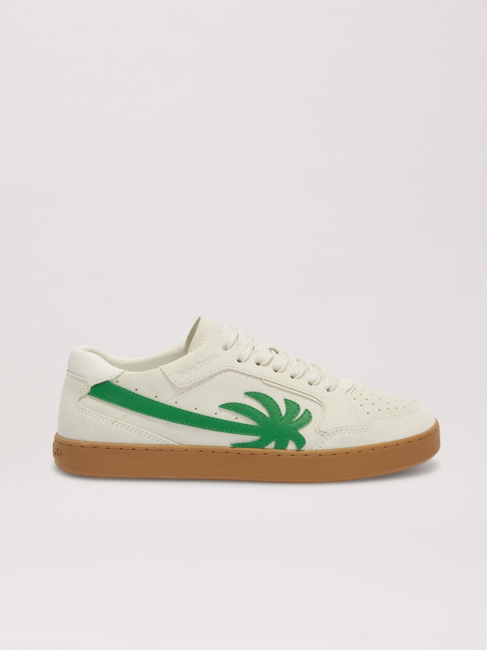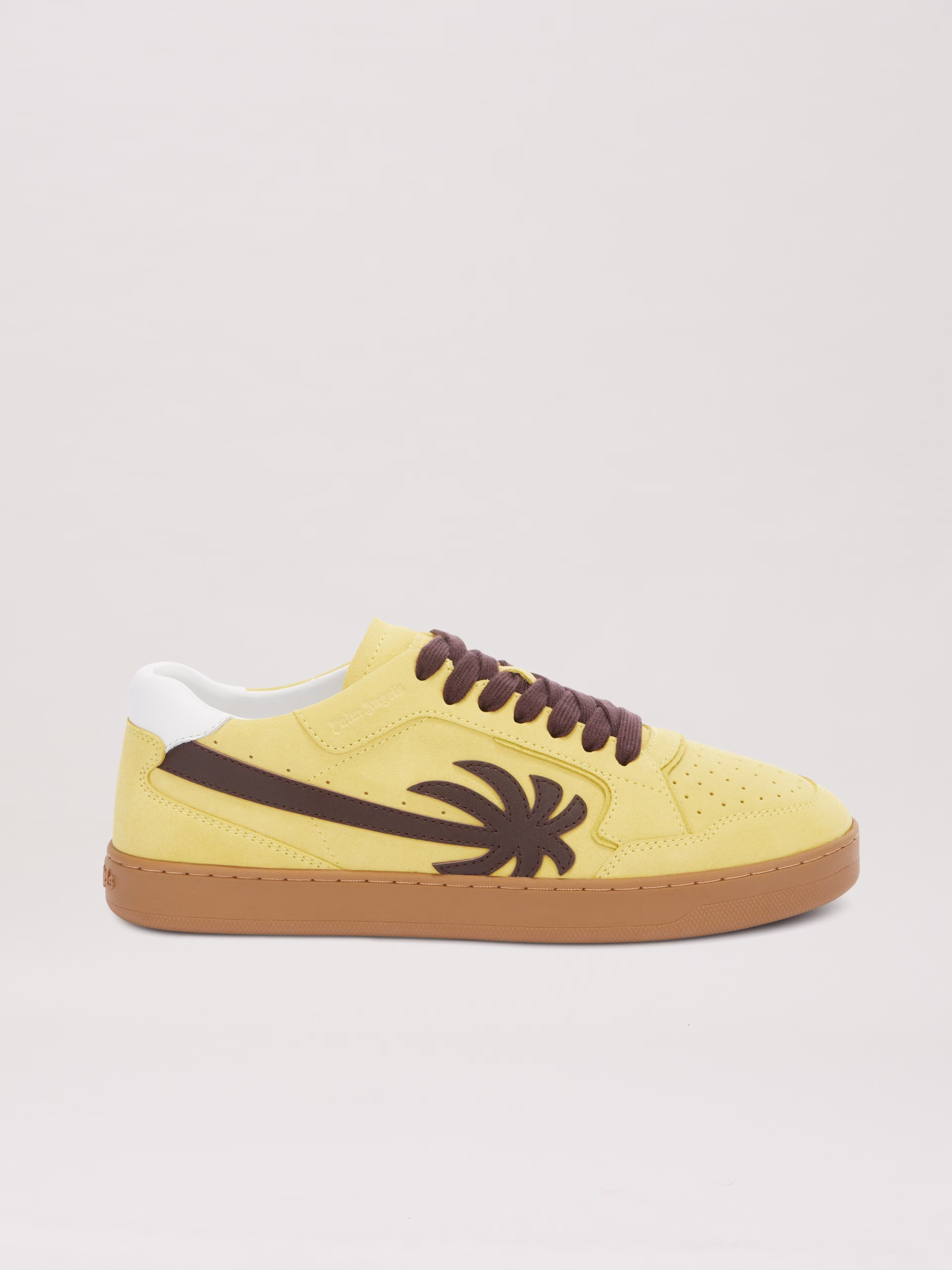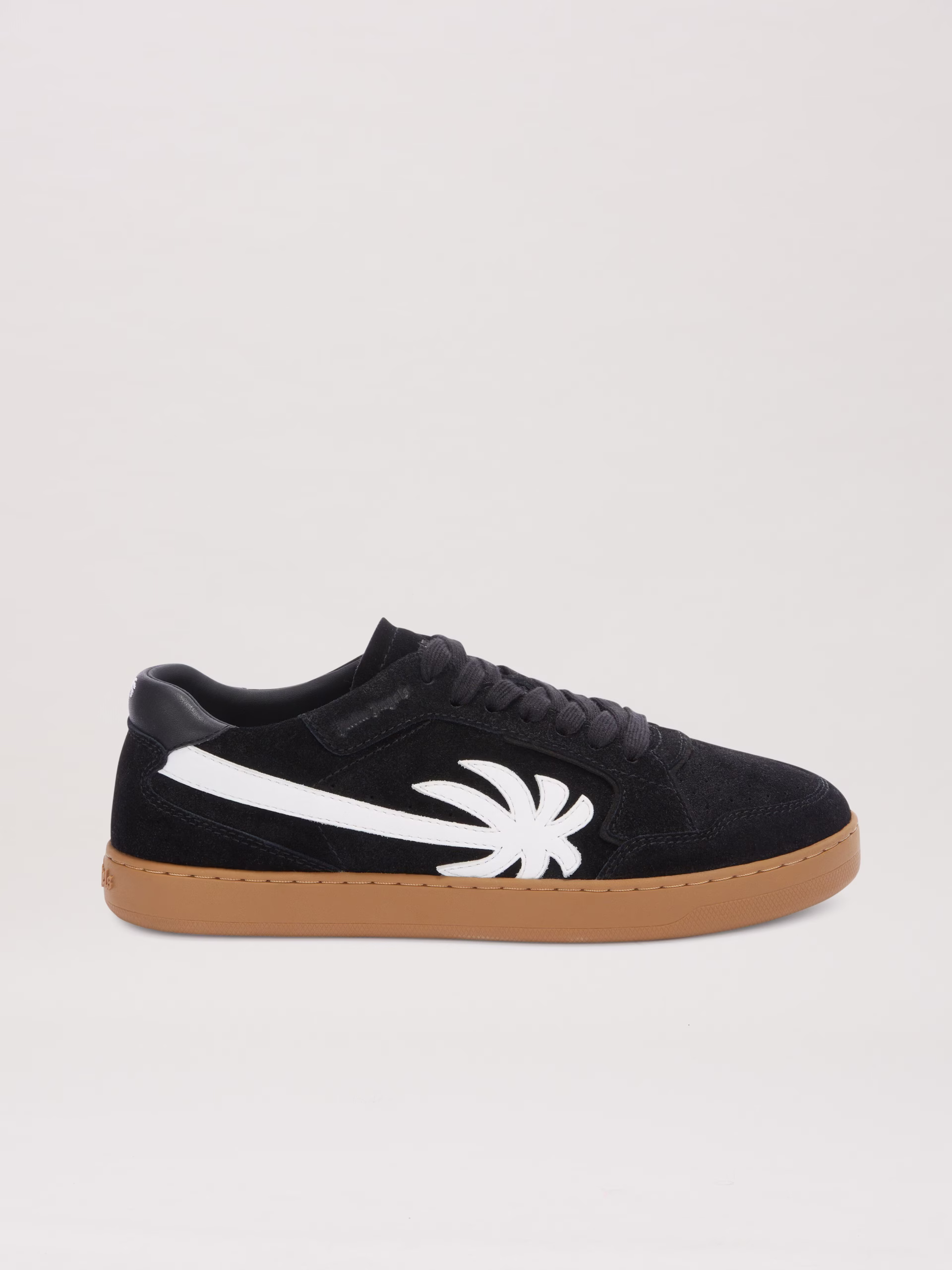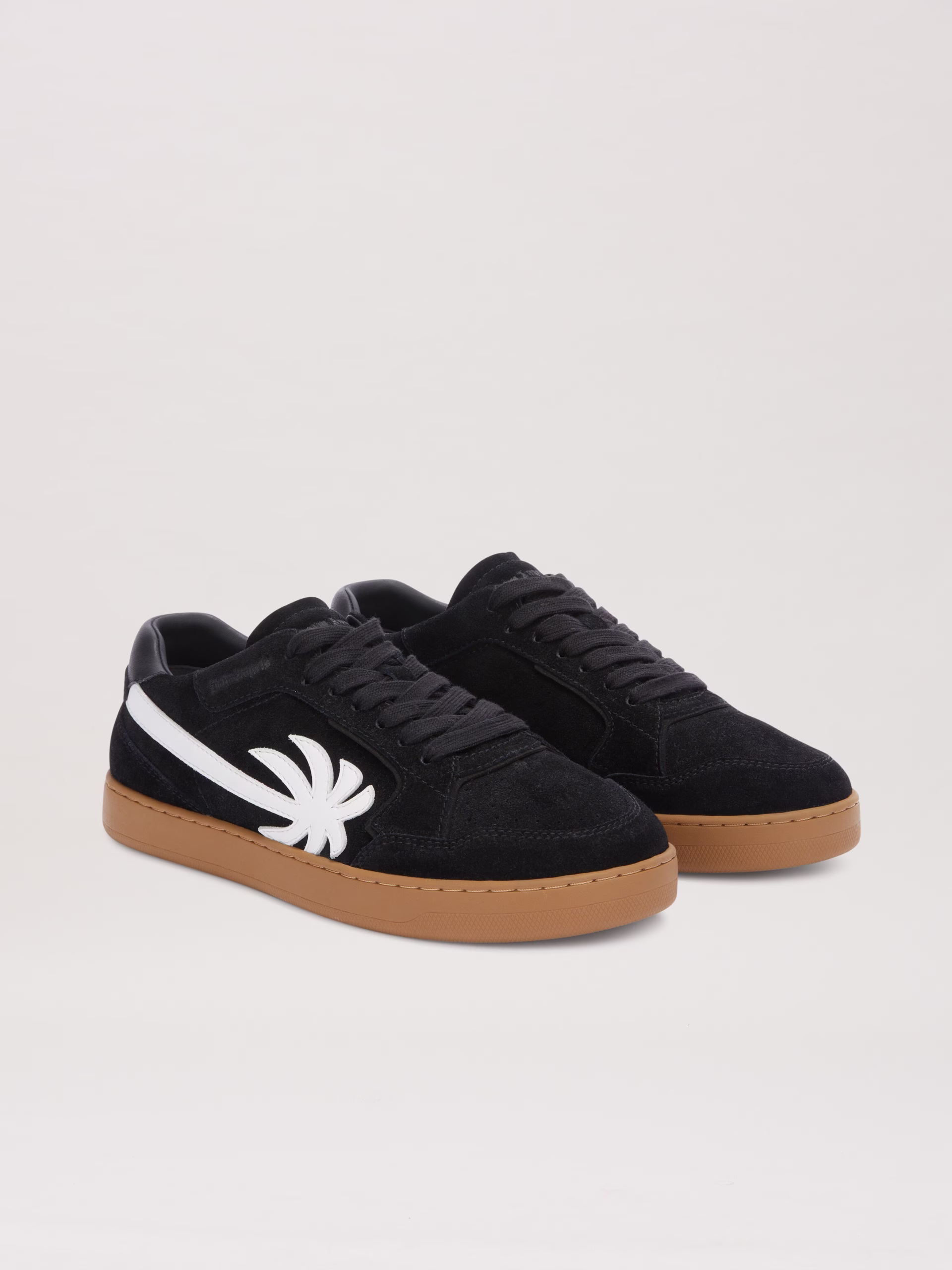Revisited retro silhouette with a subtle color scheme. Men’s black suede sneaker with caramel-colored sole, elongated white palm t