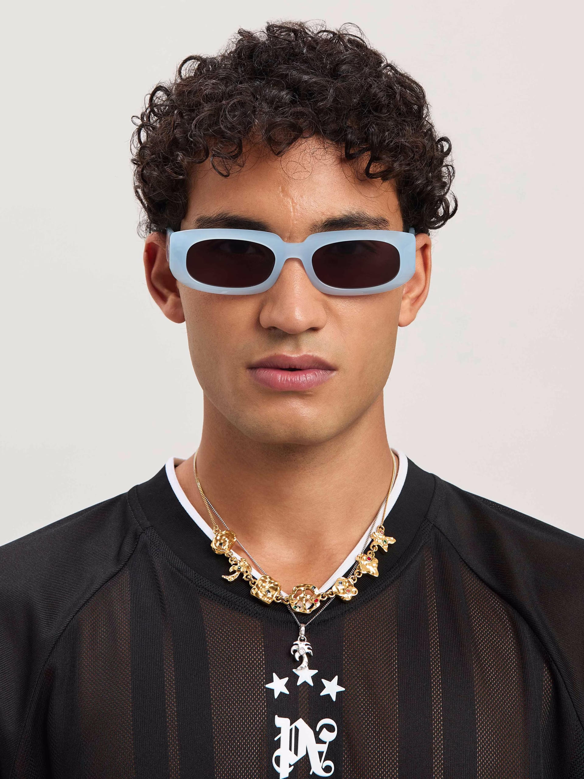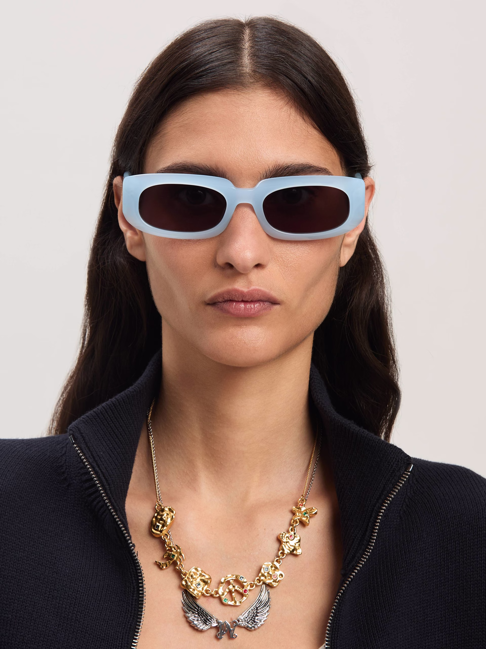 A fusion of solid and dynamic lines, round and square. Rectangular light blue matte acetate frame with dark grey oval lenses and w