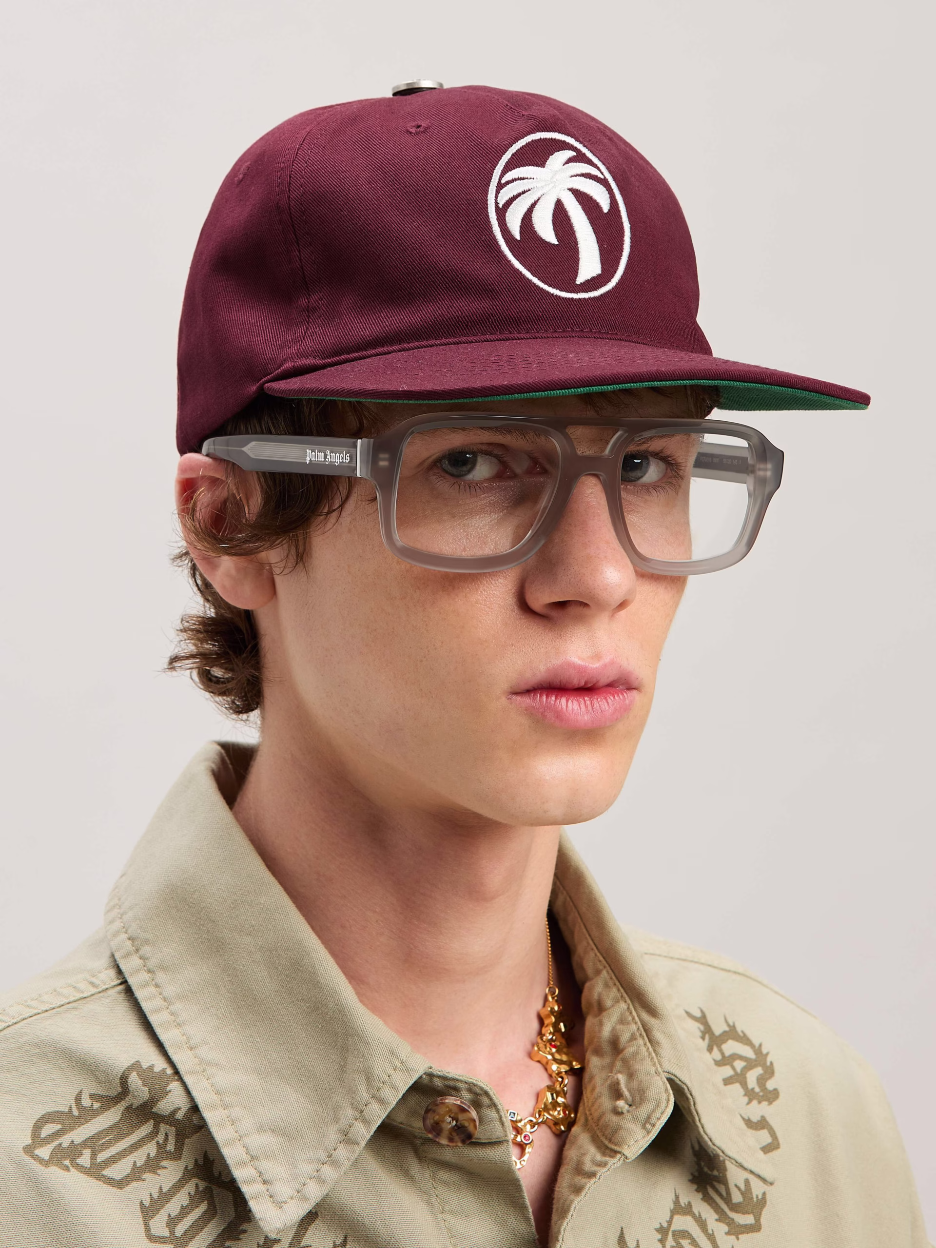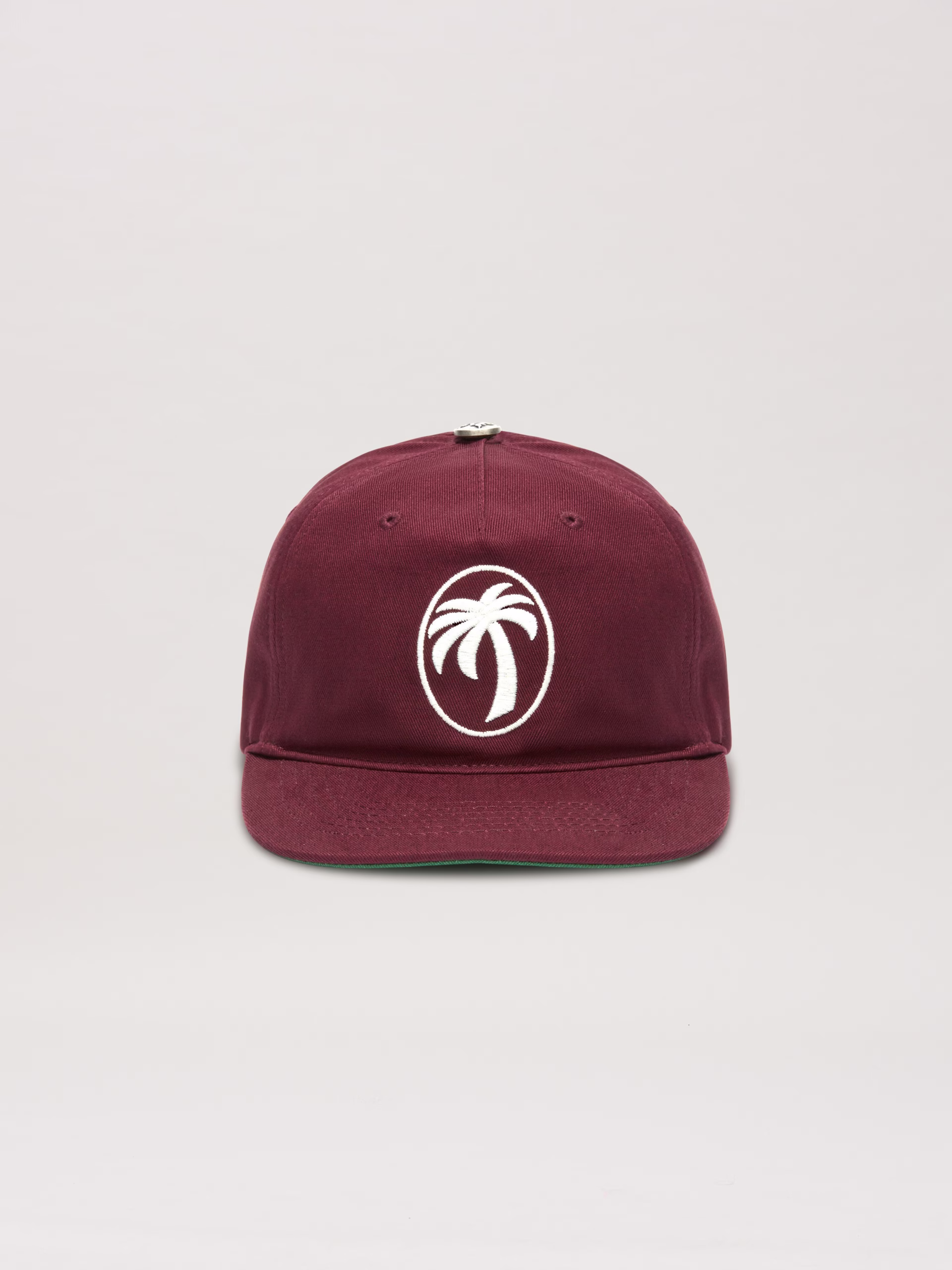 A new statement crest in Palm Angels iconography. Men’s burgundy baseball cap with Oval Palm embroidered in white on front.