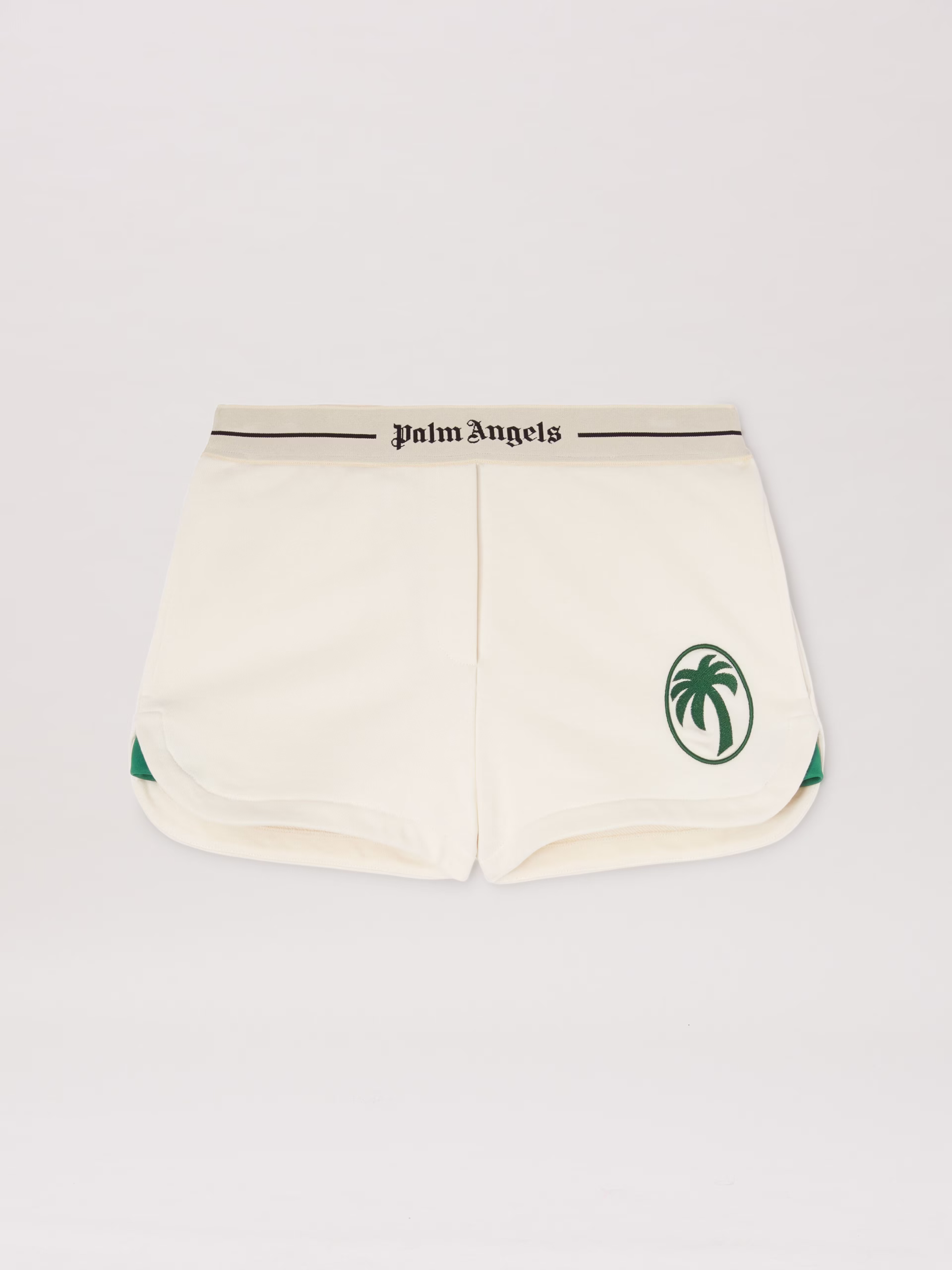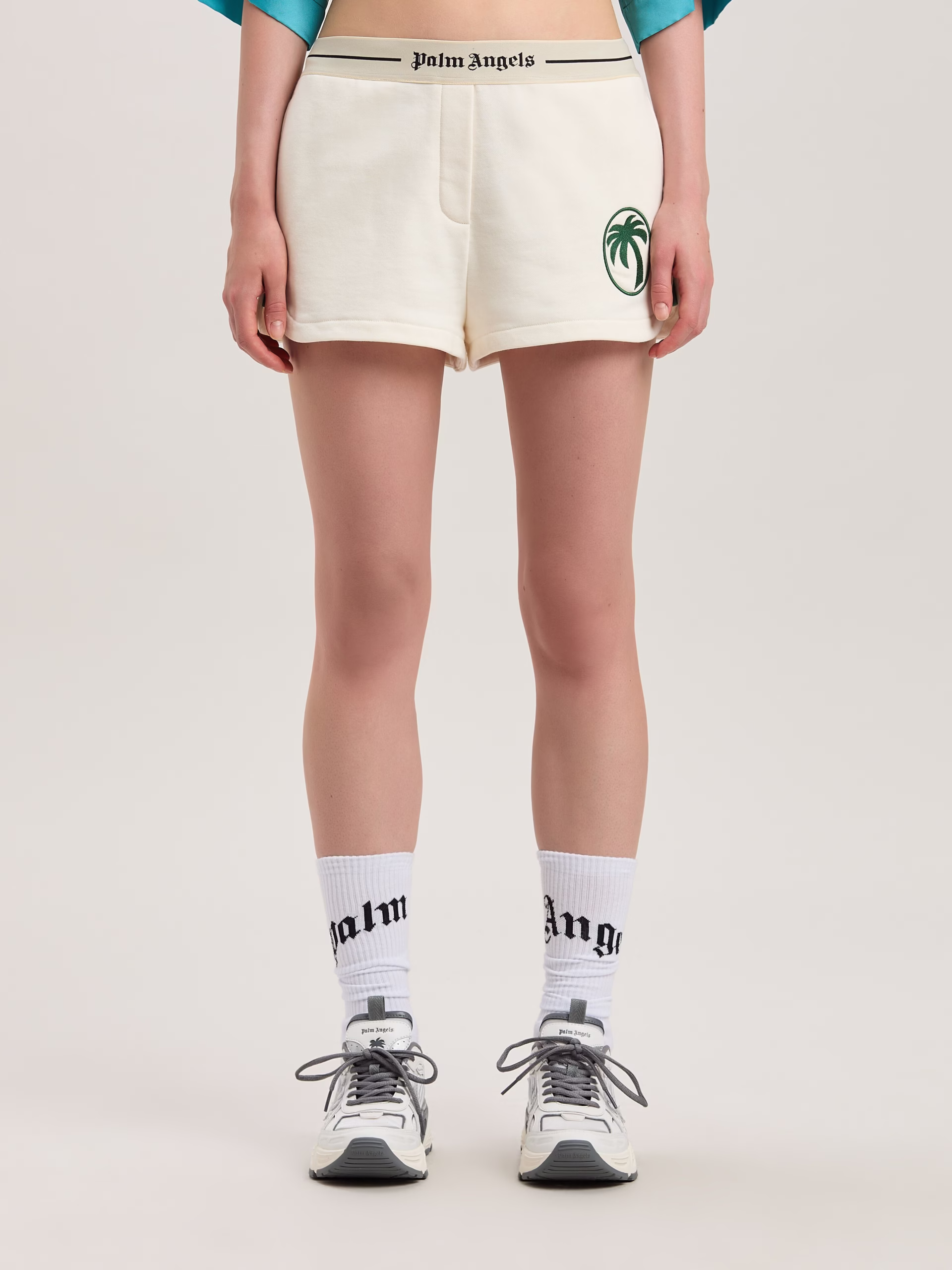 Sporty elegance crowned by the palm crest. Women’s white sweat shorts with beige logo elastic waistband and Oval Palm embroidered