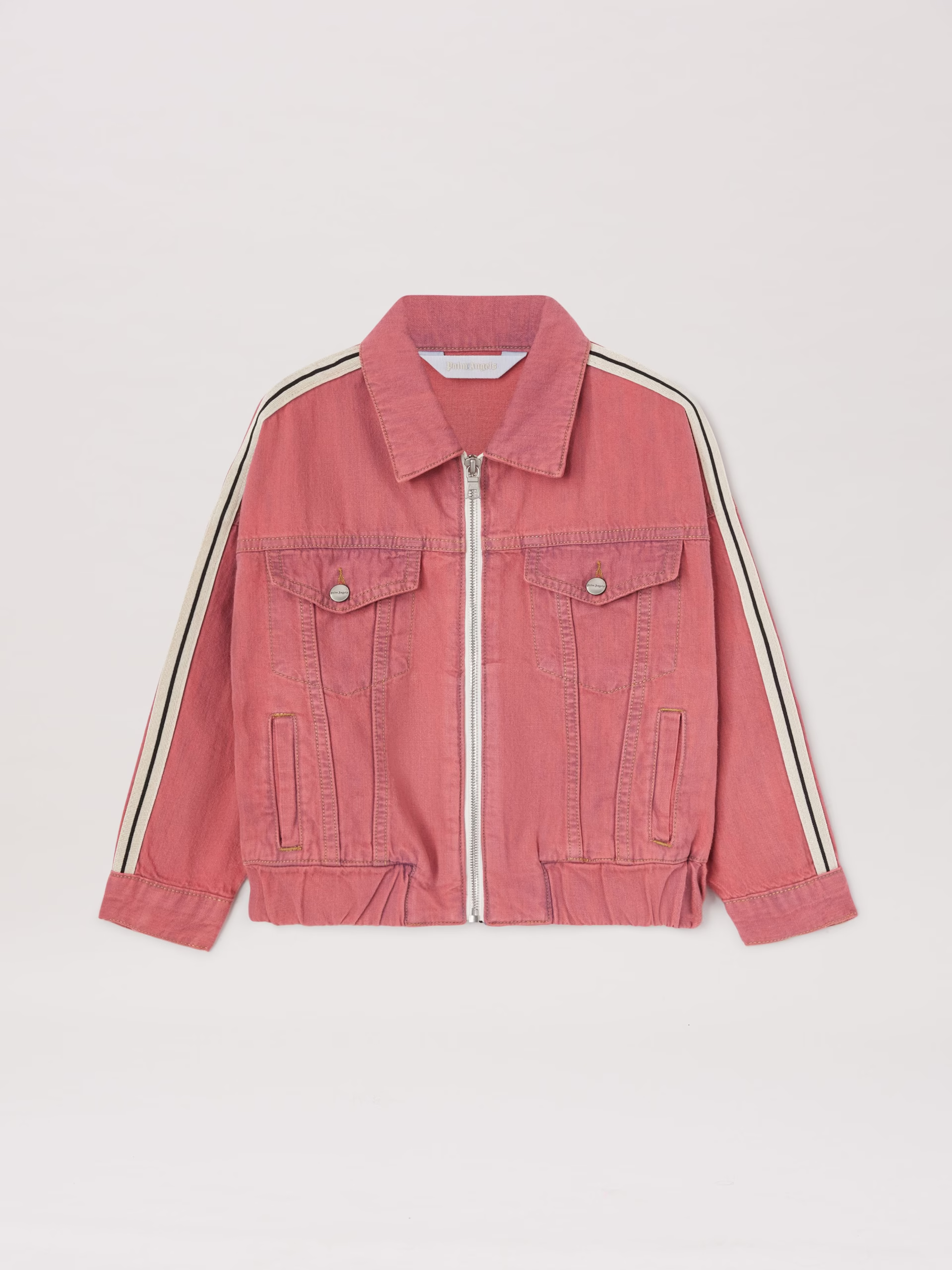 The free spirit of denim meets the tracksuit codes. Girl’s rose pink denim-style chambray jacket, zippered, with front flap pocket