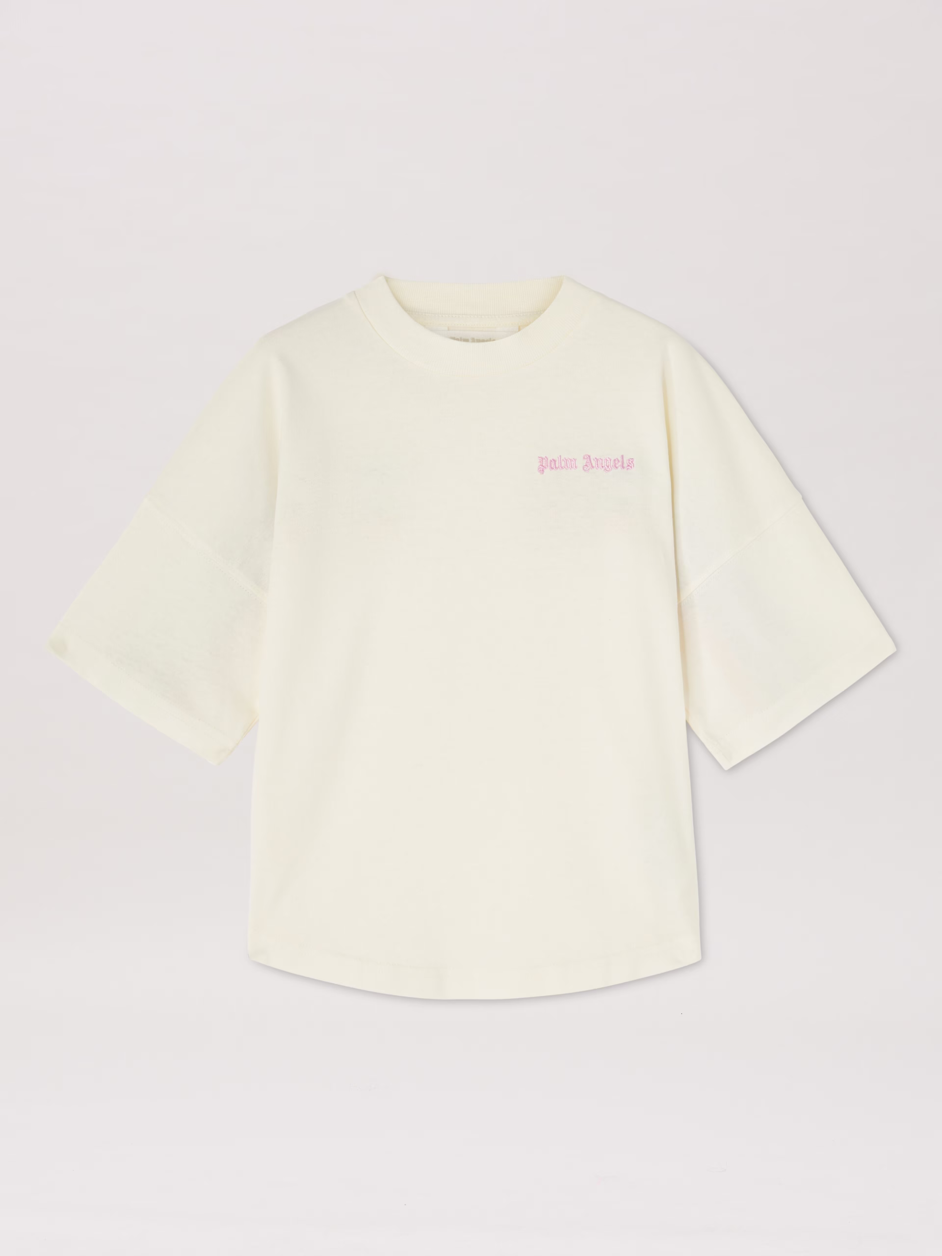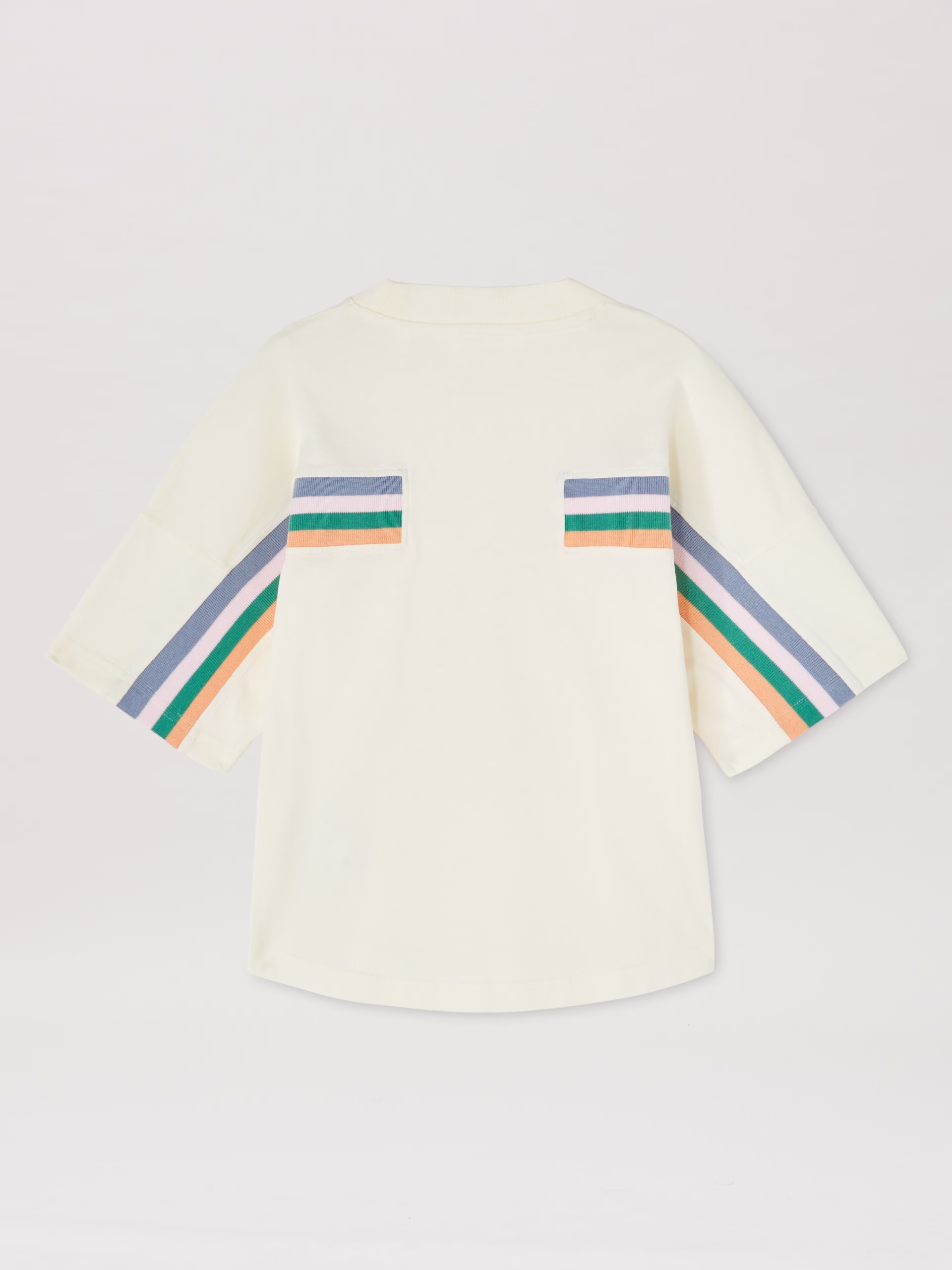 From sport code to decorative element, the Iconic Tape gets new colors and positions. Girl’s butter color short-sleeved T-shirt wi